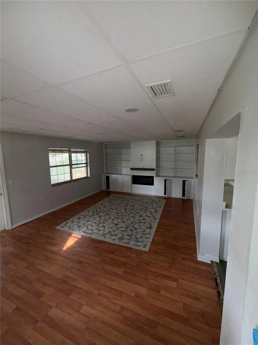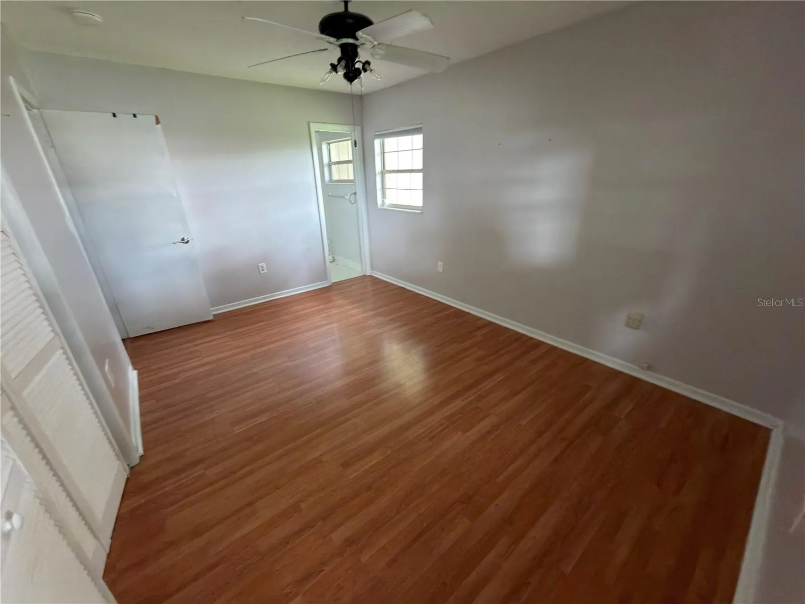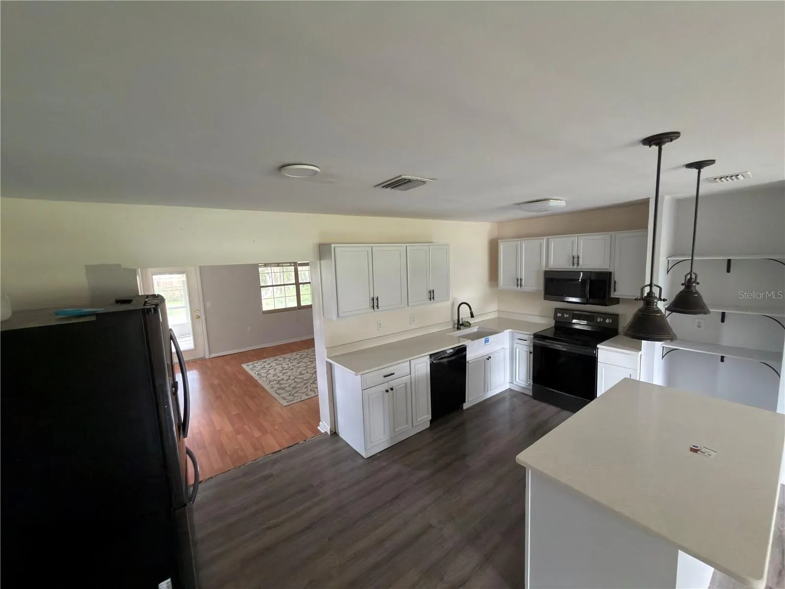 The open-concept floor plan is perfect for everyday living and entertaining. Updates include a modern kitchen, renovated bathrooms, and durable vinyl plank flooring throughout. The kitchen offers ample storage, quartz countertops, and comes equipped with a dark stainless steel refrigerator and range.