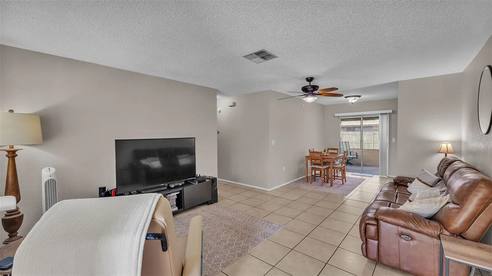 The home features a screened-in back porch—perfect for relaxing—and a fully fenced yard offering privacy and space for pets or outdoor activities. The kitchen opens to the main living area, and the primary bedroom includes a private bathroom.