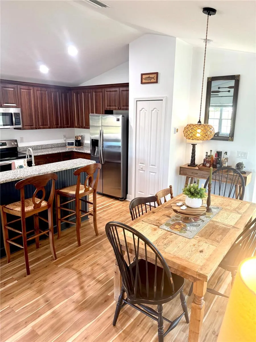 As you approach this coastal-inspired gem, you’ll be greeted by immaculate landscaping and a charming front porch – a perfect spot to unwind. Step inside to discover an open concept living and dining area drenched in natural light, enhanced by cathedral ceilings and natural wood style flooring that flows seamlessly throughout the main living spaces.