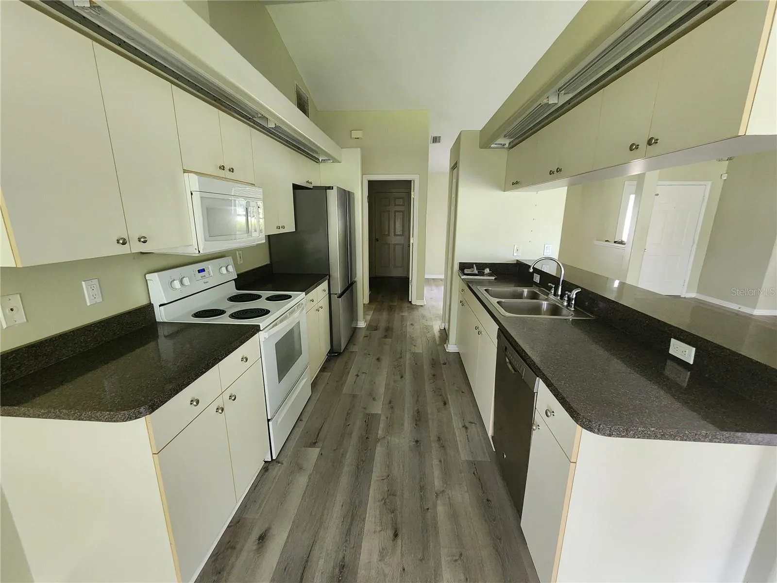 The open layout seamlessly connects the living, dining, and kitchen spaces. Vaulted ceilings and a split-bedroom floor plan add to the sense of spaciousness and privacy.