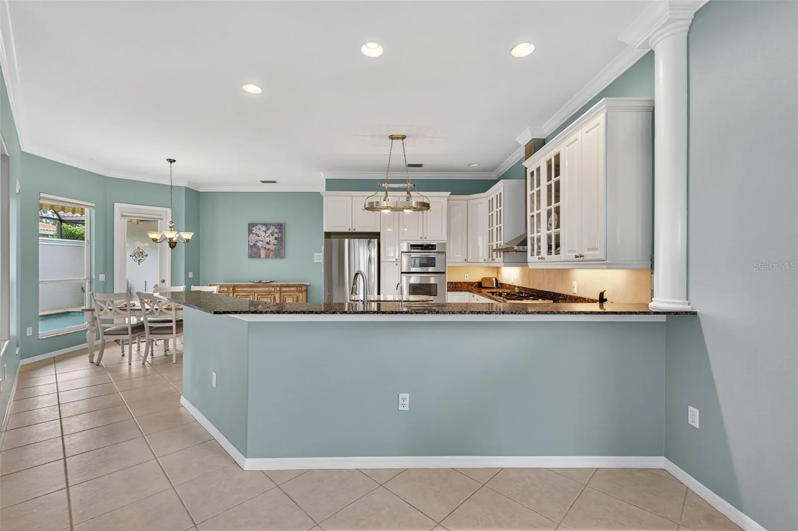 A comfortable kitchen for cooking and entertaining includes stainless steel appliances, gas cook top with separate Microwave/convection oven and custom glass display cabinets as well as a handy, hanging pot rack.