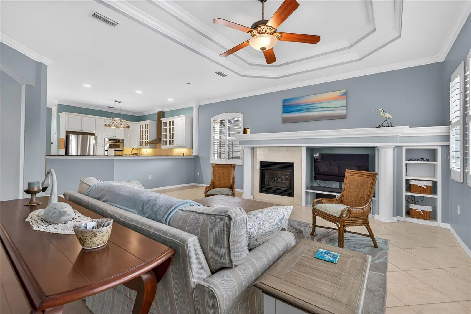 An open great room with fireplace and large picture window overlook tropical landscaping from the main living space. Upscale details like crown molding, plantation shutters and tray ceilings lend a premium feel.