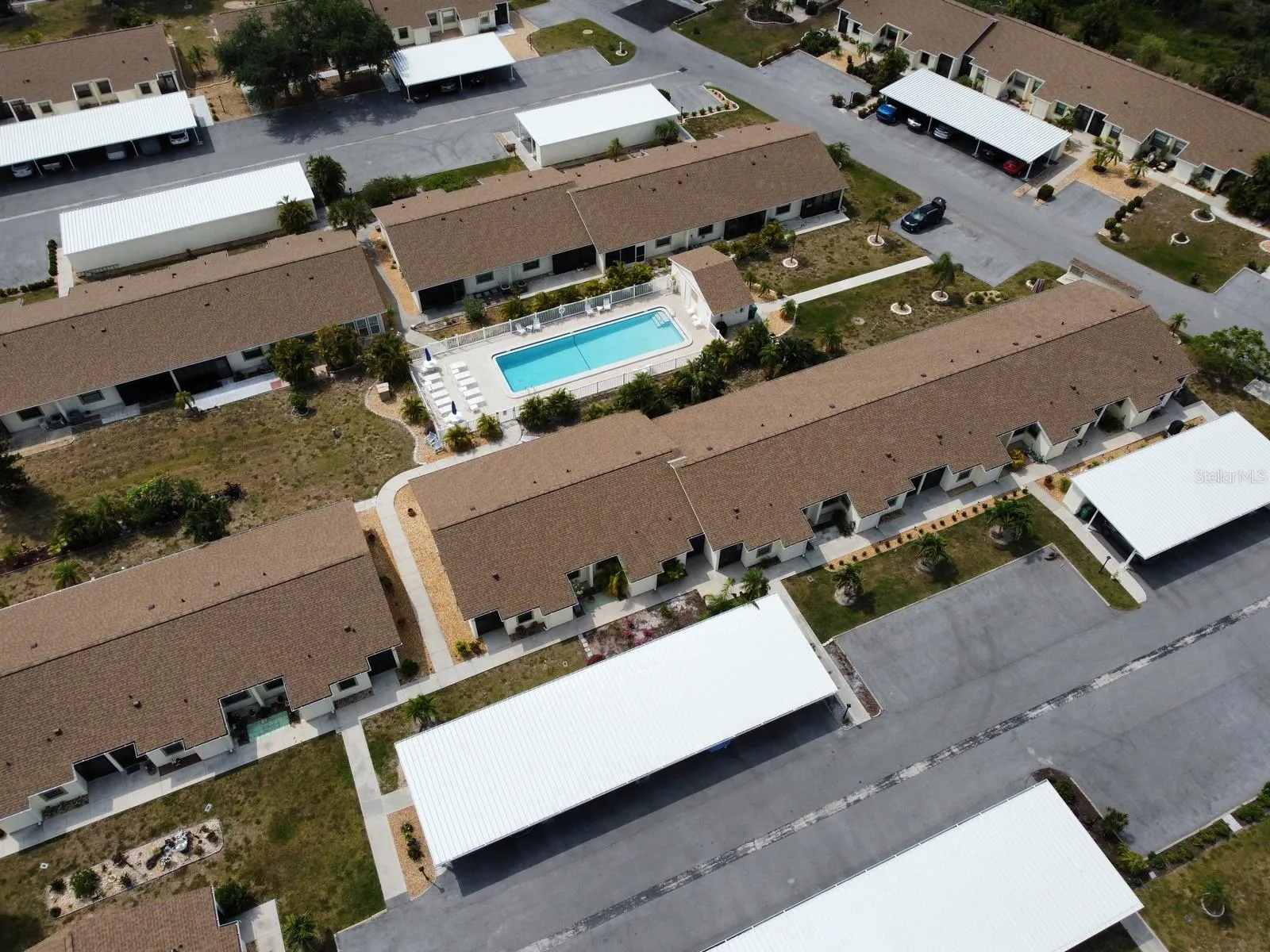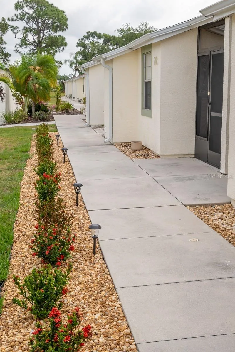 This peaceful friendly community offers a large heated pool just steps away from the unit’s generous patio area outside the lanai. New landscaping provides a buffer from the pool, giving you a very convenient pool access, but also with a gorgeous view of the organic beauty of nature. Your unit includes a covered carport, a private 10’ x 3’ storage shed, an additional assigned parking space and abundant guest parking. Recent community updates include the replacement of all roofs and carport roofs in 2023. With one of the lowest condo association fees in the area, The Village of Wildflower is well landscaped and welcoming.