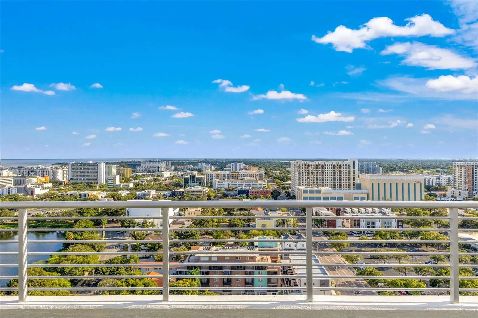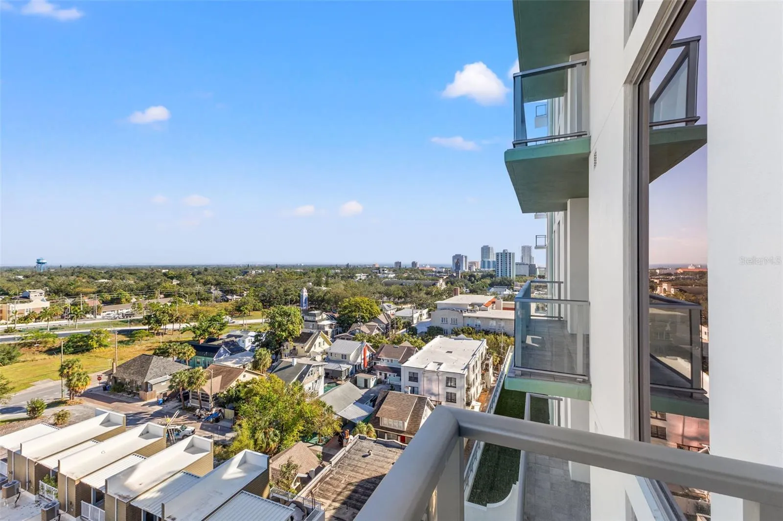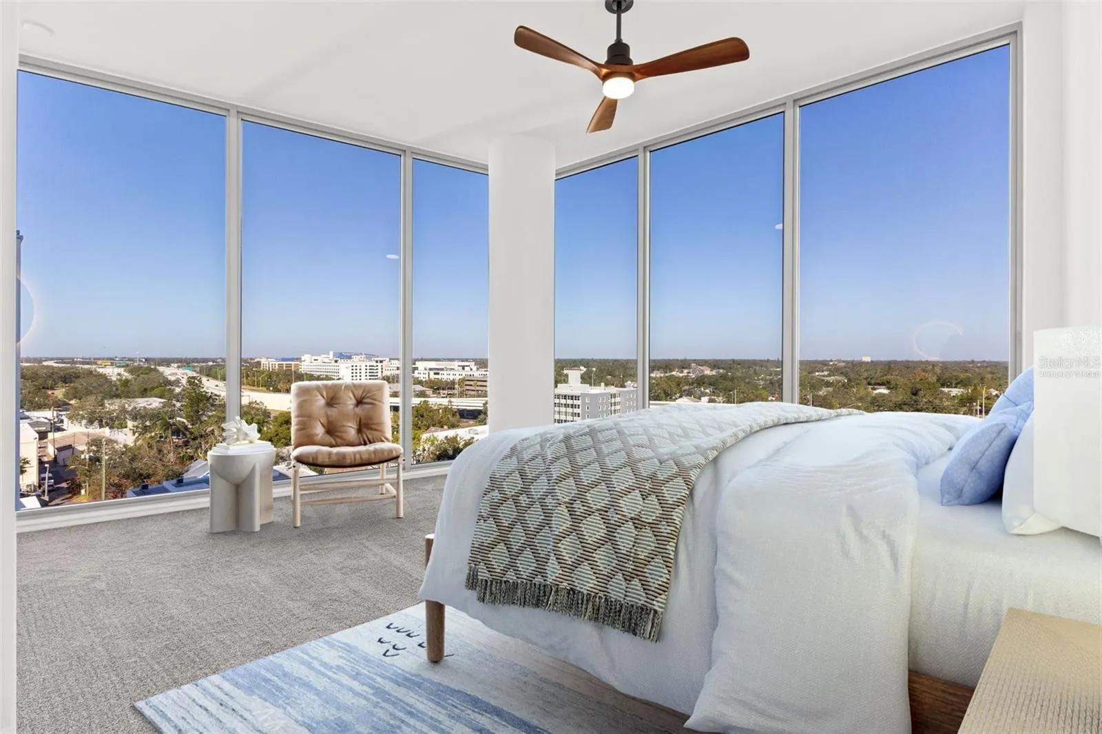The master suite is a private retreat, framed by floor-to-ceiling windows wrapping two full walls, offering uninterrupted views that stretch across the city skyline and Tampa Bay. Throughout the main living spaces, soaring 10-foot ceilings and polished porcelain flooring create an airy, elegant backdrop. Expansive sliding doors open to a private terrace where you can enjoy northwest-facing views — the perfect vantage point for morning coffee or evening sunsets.