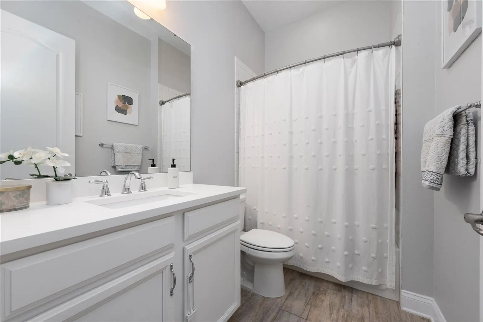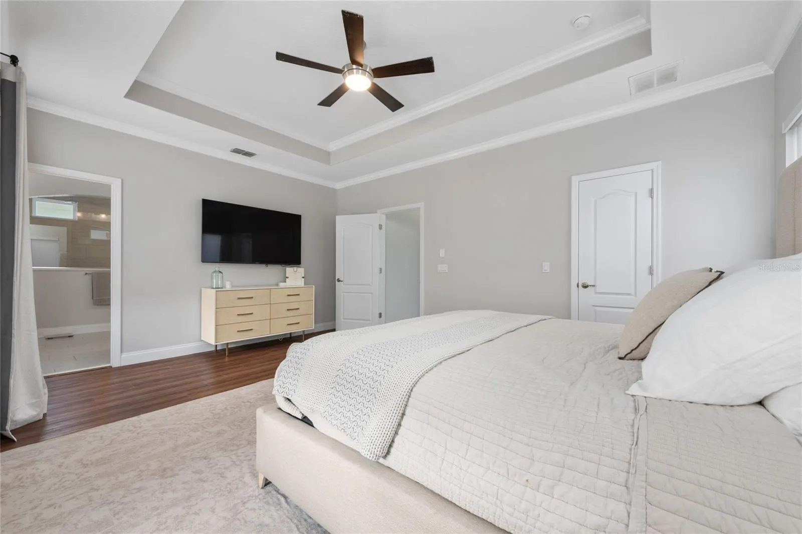 The first floor features a convenient guest suite with full bath, while upstairs, the master retreat awaits with two closets (one with custom built-ins), a tray ceiling, and ample space for your sanctuary. The spa-like master bath offers a walk-in shower, abundant natural light, and generous space for relaxation.