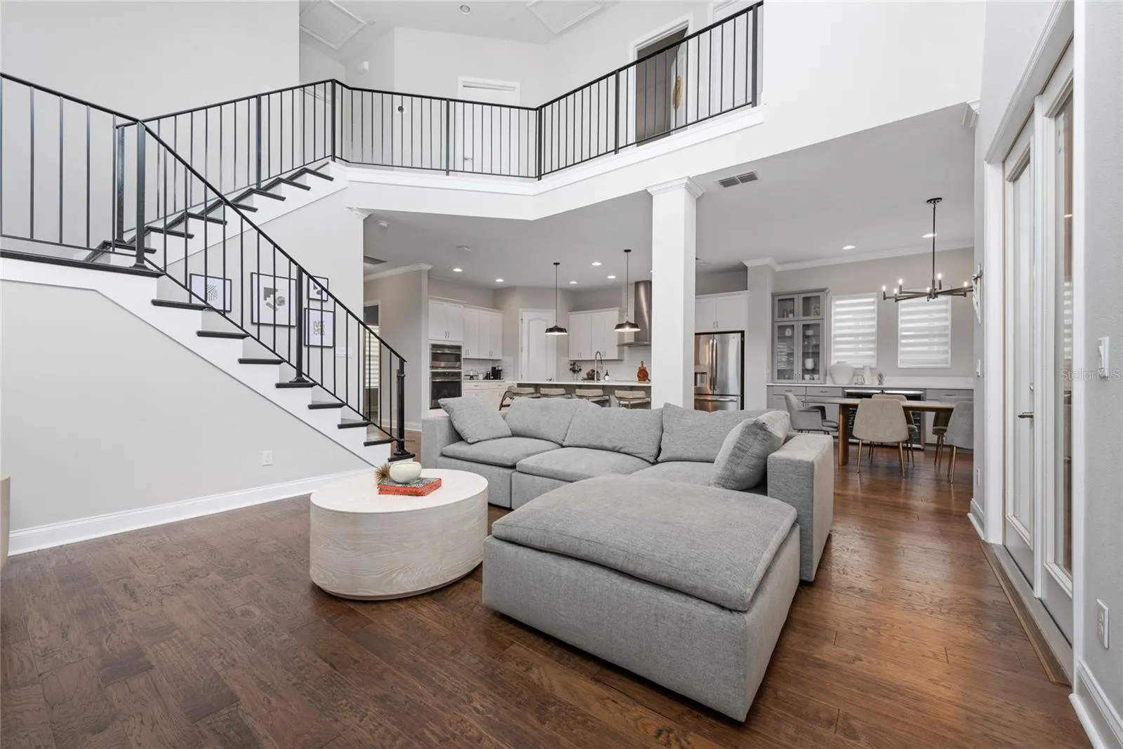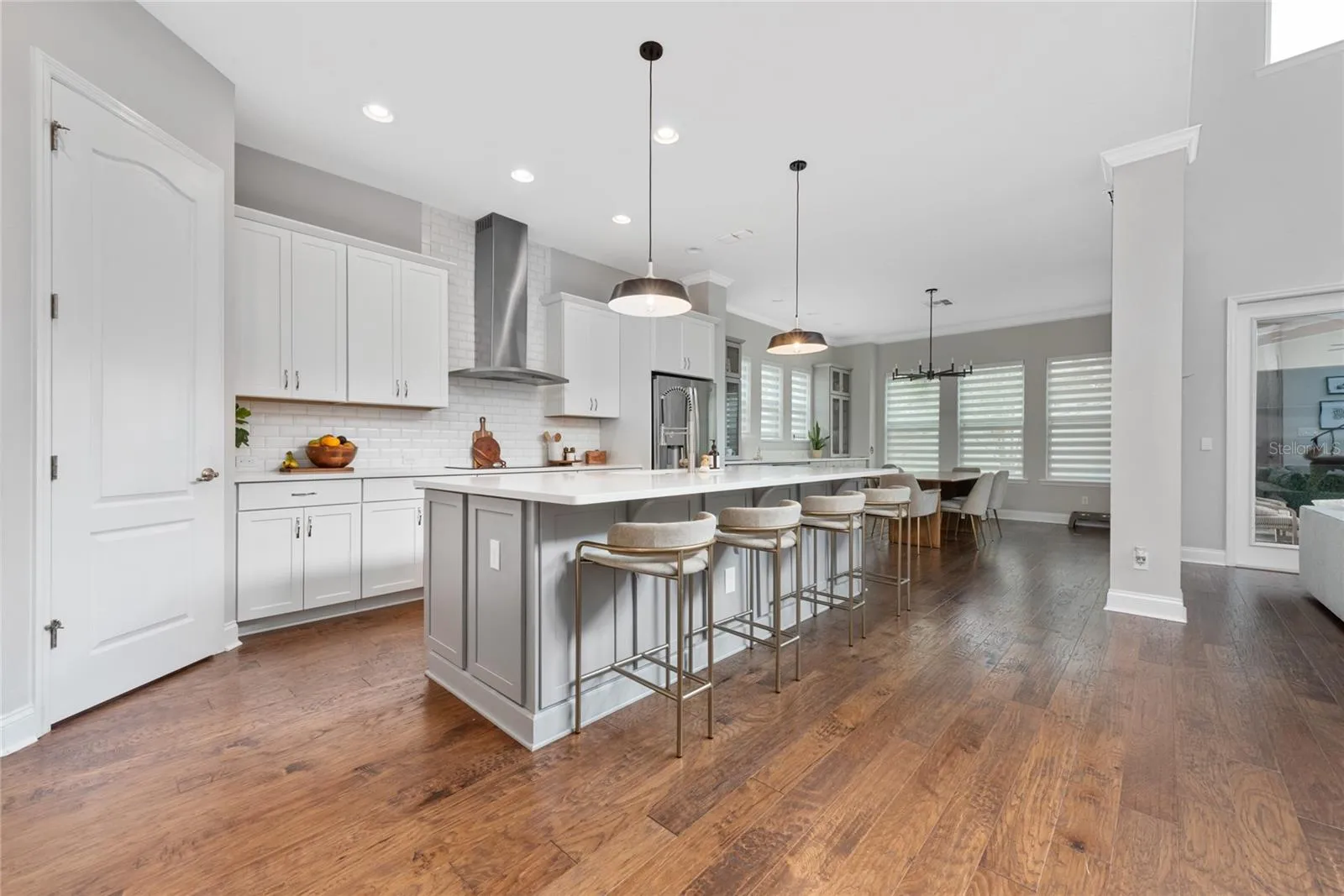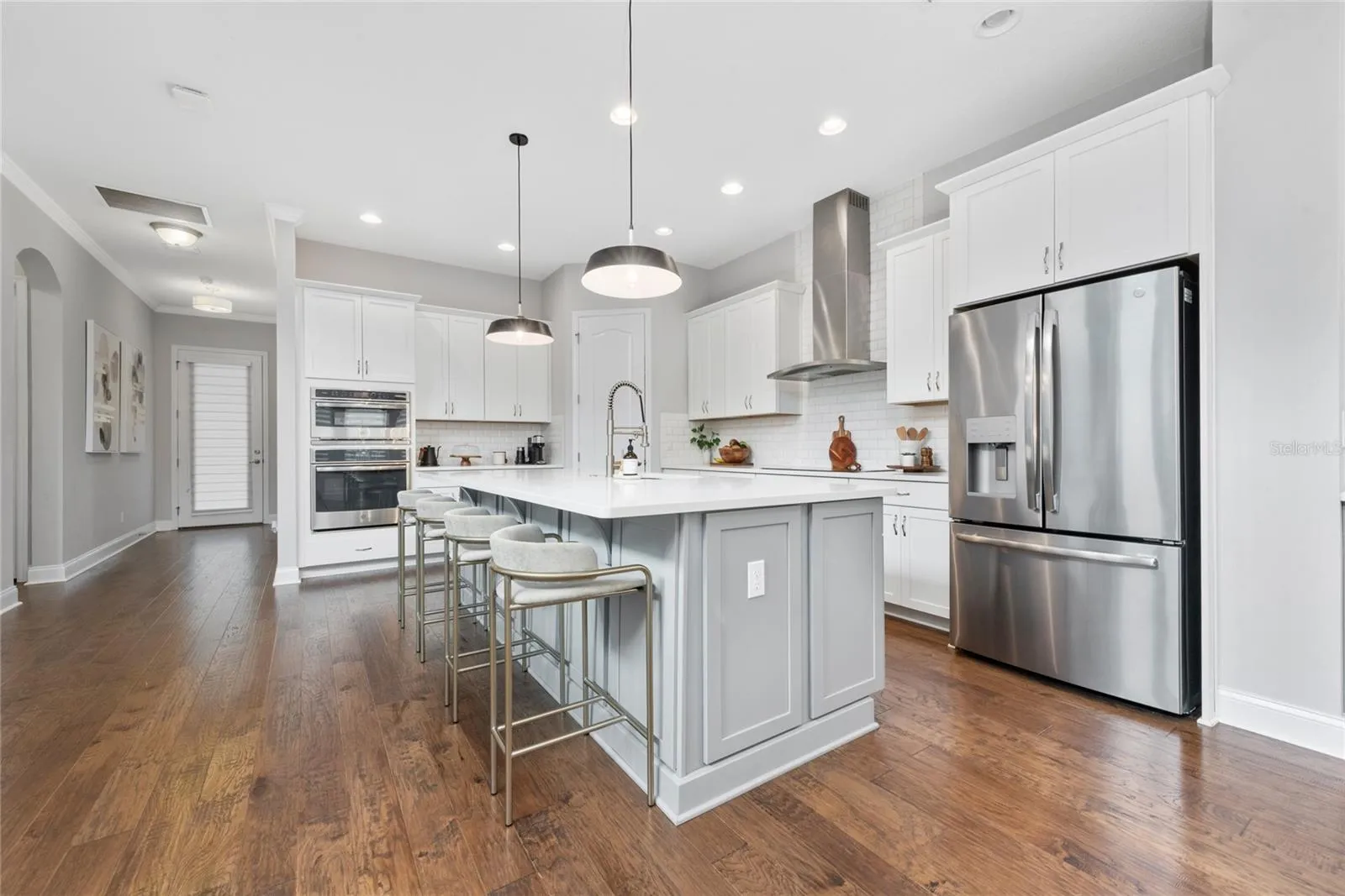 As you enter, you’ll be greeted by beautiful hardwood floors and a breathtaking 20-foot ceiling in the great room. The dining area includes a built-in bar and buffet, ideal for entertaining, while the gourmet kitchen is a chef’s delight, showcasing top-of-the-line appliances and thoughtful design.