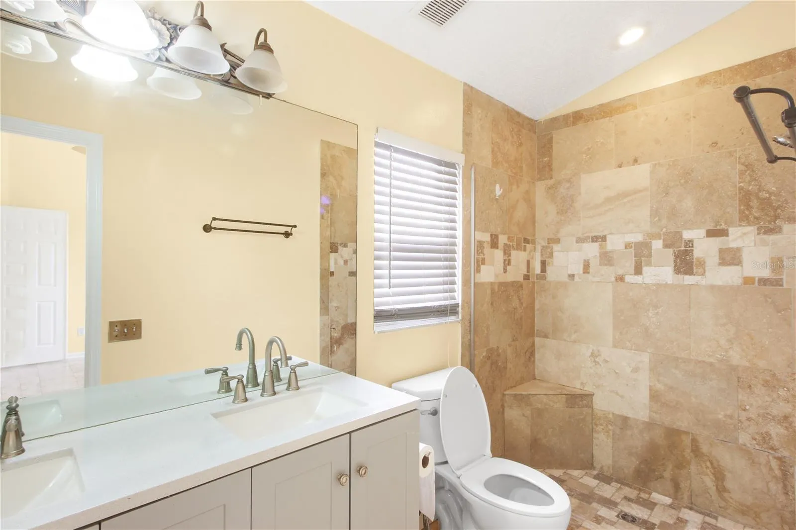 Inside, you’ll love the open floor plan with vaulted ceilings that make the home feel bright and spacious. The kitchen shines with stainless steel appliances, porcelain tile floors, and a travertine backsplash — perfect for everyday meals or hosting friends. Retreat to your master suite, complete with a walk-in closet and spa-like bathroom featuring dual sinks and a travertine shower. Guests will be equally impressed with the stylish second bath showcasing a designer glass bowl sink.