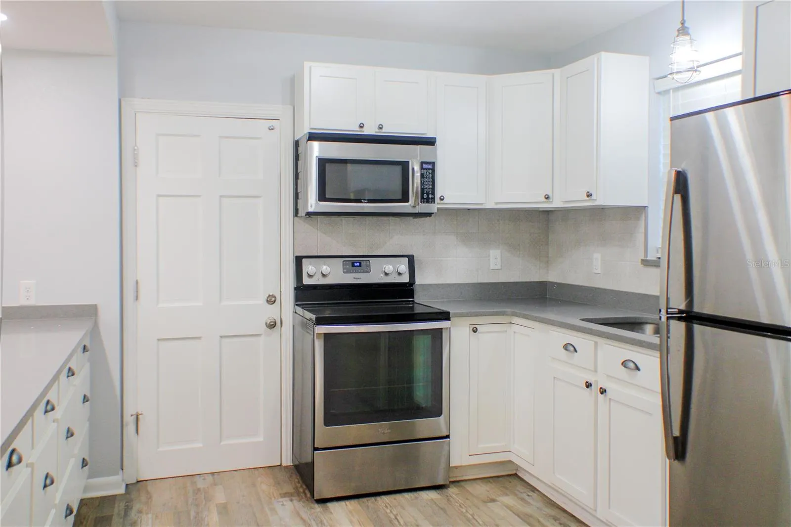 Inside, you’ll find a modern kitchen with quartz countertops, refrigerator with ice maker, microwave, and oven. Wood and luxury vinyl plank flooring flow throughout the home, and a washer and dryer are included for the lifespan of the appliances. The primary bedroom features a stylish barn door to the bathroom, and every bedroom has ceiling fans. The living room is very spacious and offers an open view into the kitchen so even if you’re making dinner, the whole family can still be involved. A decorative fireplace adds charm, though it is not available for use.