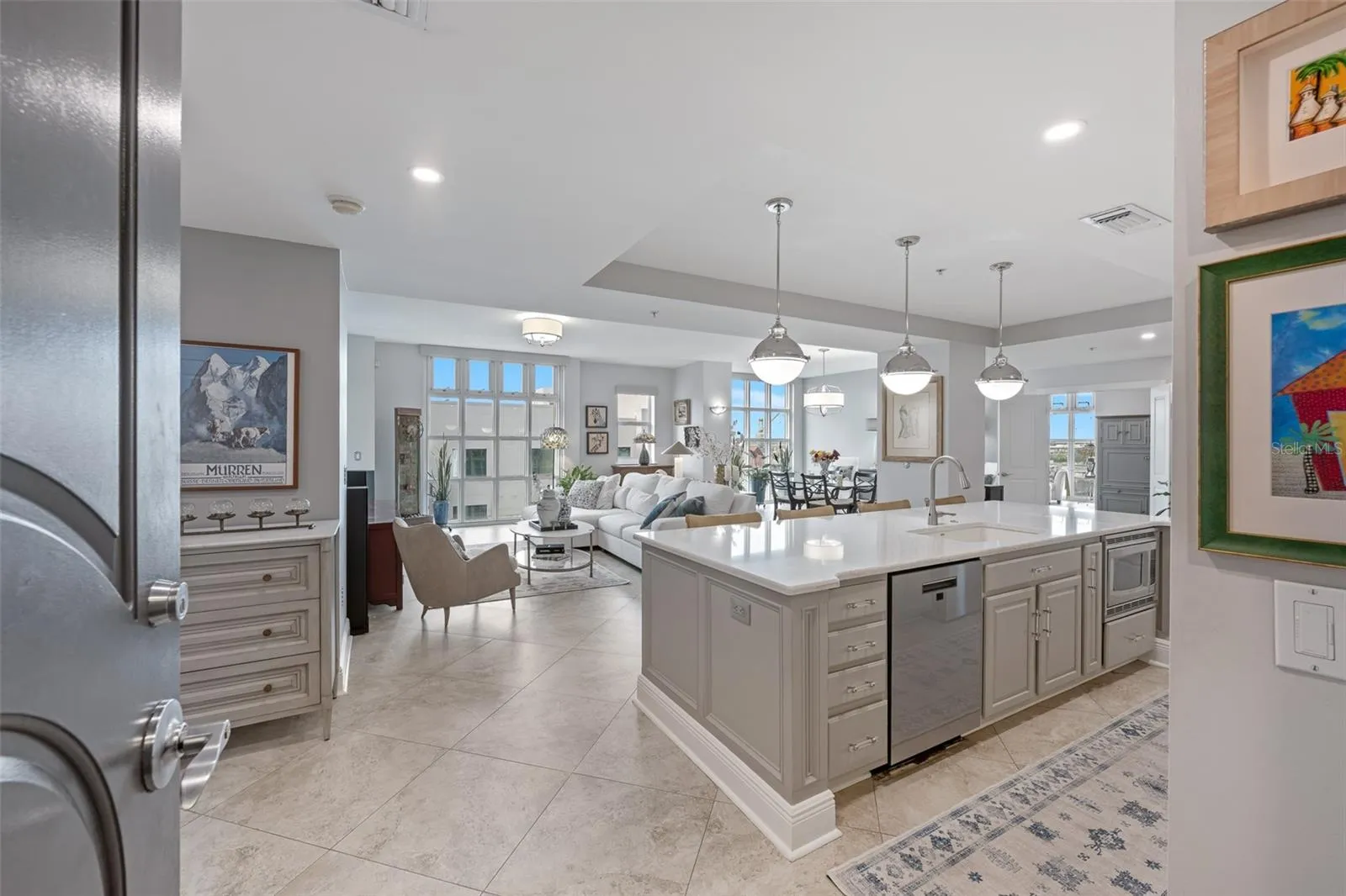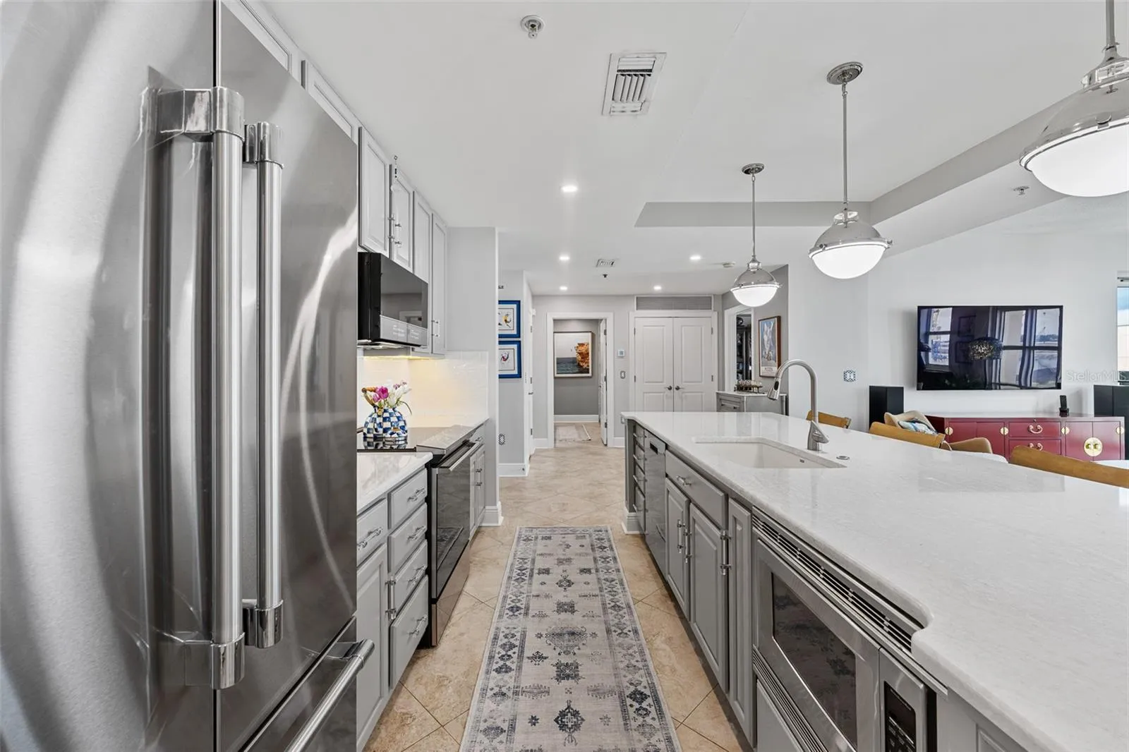 At the heart of the residence, the chef-inspired kitchen is both practical and a showpiece. A nearly 10-foot Cambria Ironsbridge quartz island anchors the space, offering seating for four and a luminous veining that doubles as art. Custom dove-gray cabinetry provides exceptional storage, while chrome hardware, under-cabinet lighting, and a full-height subway tile backsplash create a timeless, clean-lined aesthetic. High-end stainless steel appliances—including a French door refrigerator and smooth-top range—deliver top-tier performance. Pendant lighting, a touchless gooseneck faucet, and a sleek undermount sink complete this modern culinary retreat.