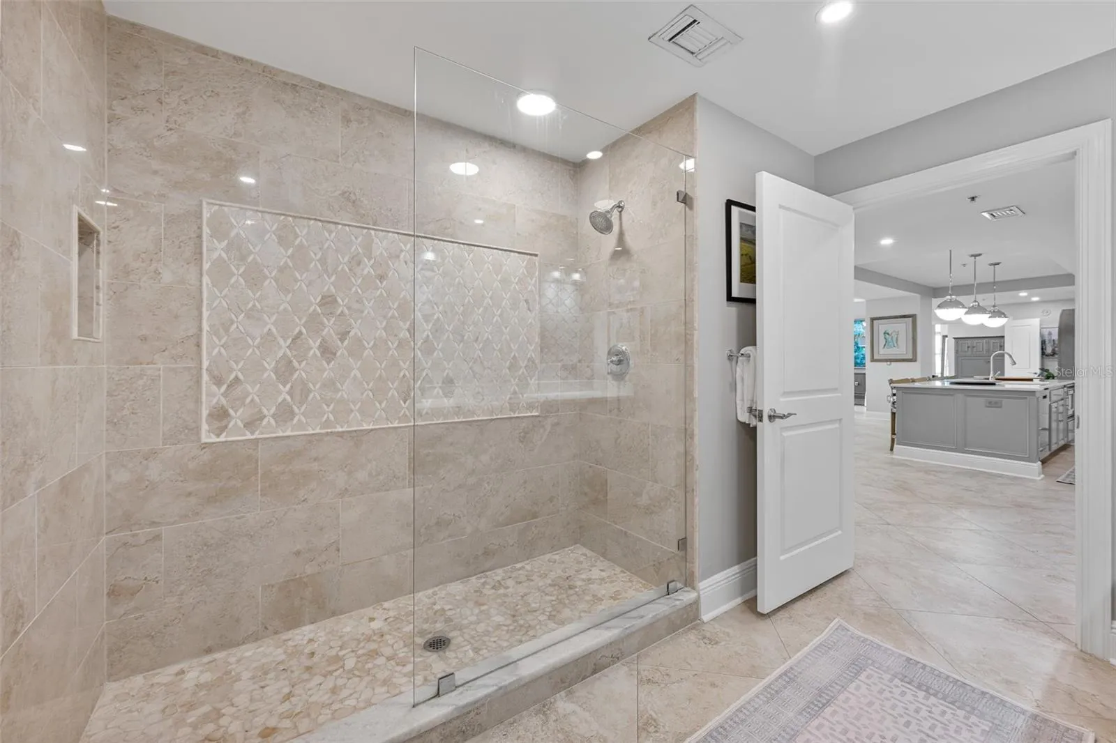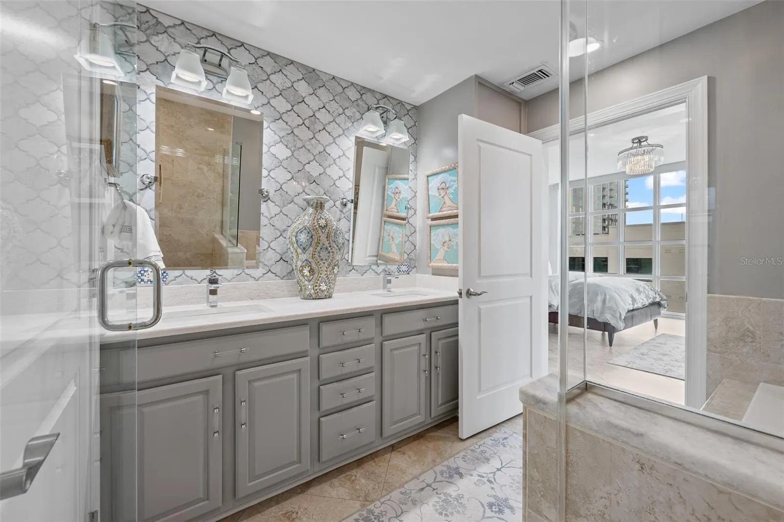 The primary bath is a spa-worthy sanctuary. Dual quartz vanities sit against a Moroccan-inspired Carrara marble mosaic accent wall, paired with sleek beveled mirrors and designer lighting. A deep soaking tub under a shimmering chandelier offers ultimate relaxation, while the walk-in shower is elevated with polished onyx pebbles underfoot, porcelain travertine-style walls, and a mosaic detail—transforming everyday routine into luxury ritual.