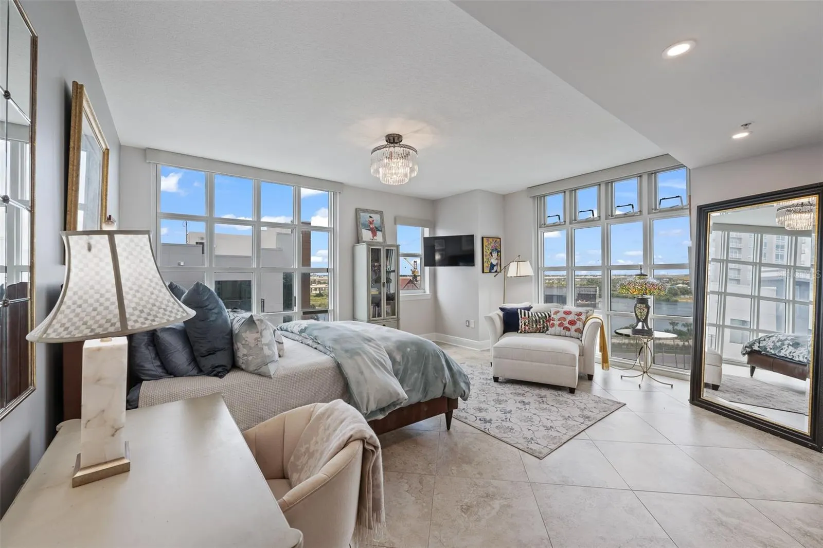 A pair of double doors marks the entrance to your private retreat, setting the tone for the serenity and spaciousness that awaits. Inside, the expansive corner primary suite is surrounded by walls of glass, filling the room with natural light and showcasing sweeping water vistas. From your bed, enjoy a front-row seat to the cruise ships docking at Pier 6—an ever-changing maritime backdrop that adds a touch of drama to your peaceful sanctuary.
