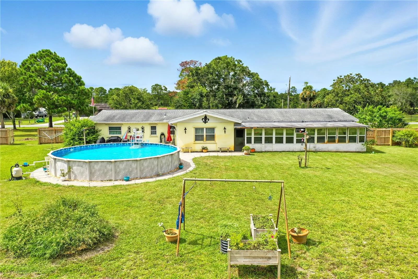 Outdoors is where this home truly shines: a 27-ft above-ground pool (4-ft deep) surrounded by pavers, a 17×25 paver patio and a 38×11 enclosed porch with bar, 2019 windows, and wall A/C unit, all designed for relaxation and entertaining.