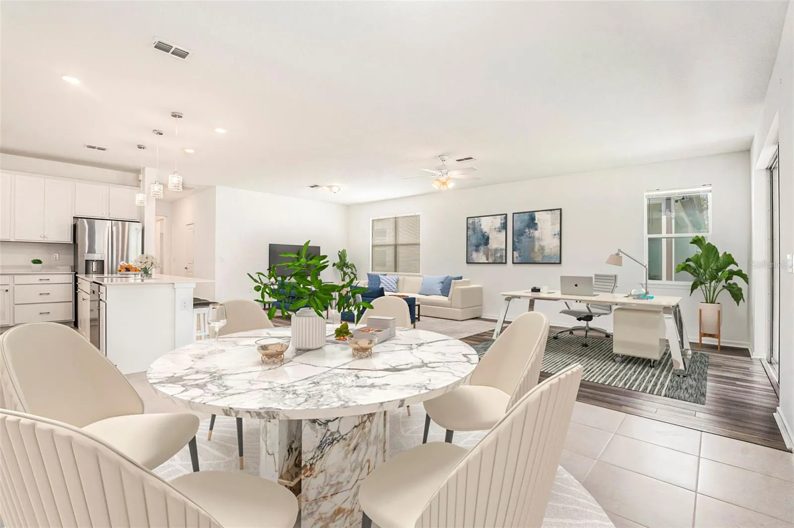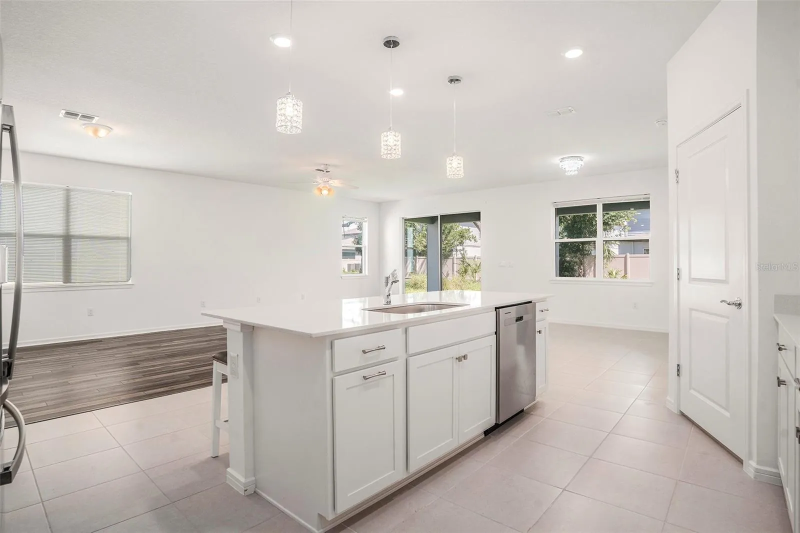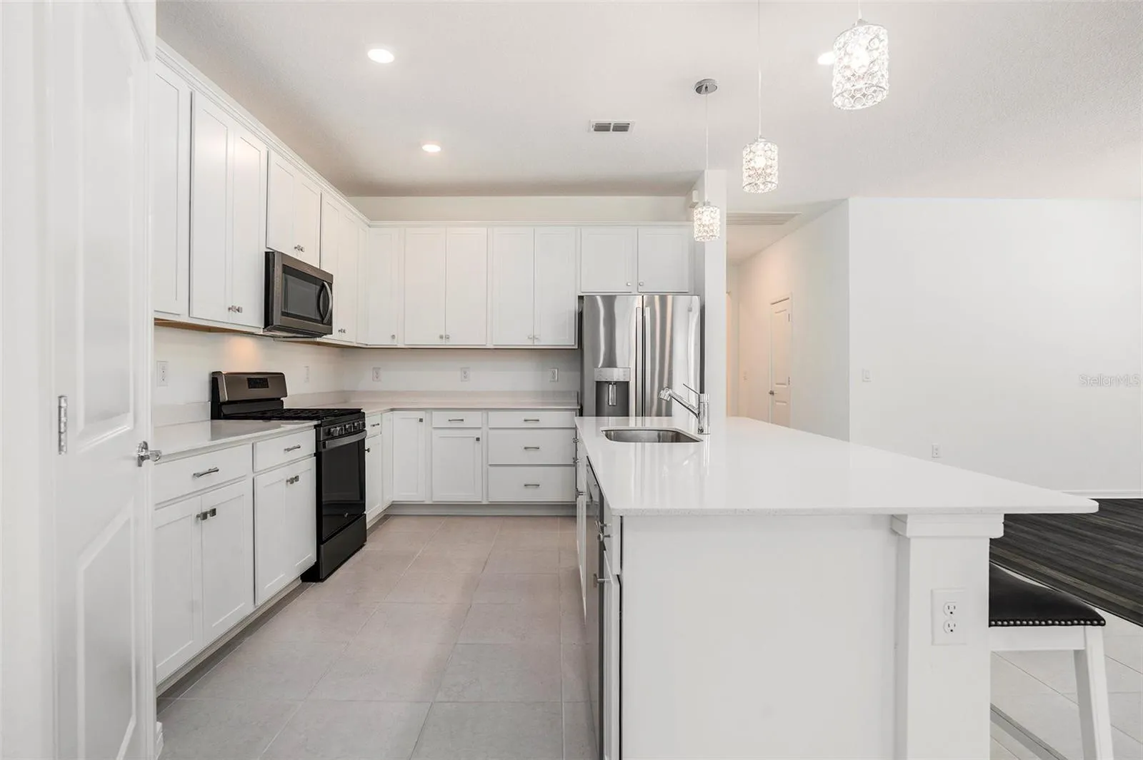 The heart of the home is the open-concept kitchen, living, and dining area, perfect for entertaining or everyday living. The gourmet kitchen is a chef’s delight, boasting quartz countertops, a large center island with seating and prep space, and stainless steel appliances—including a gas range.