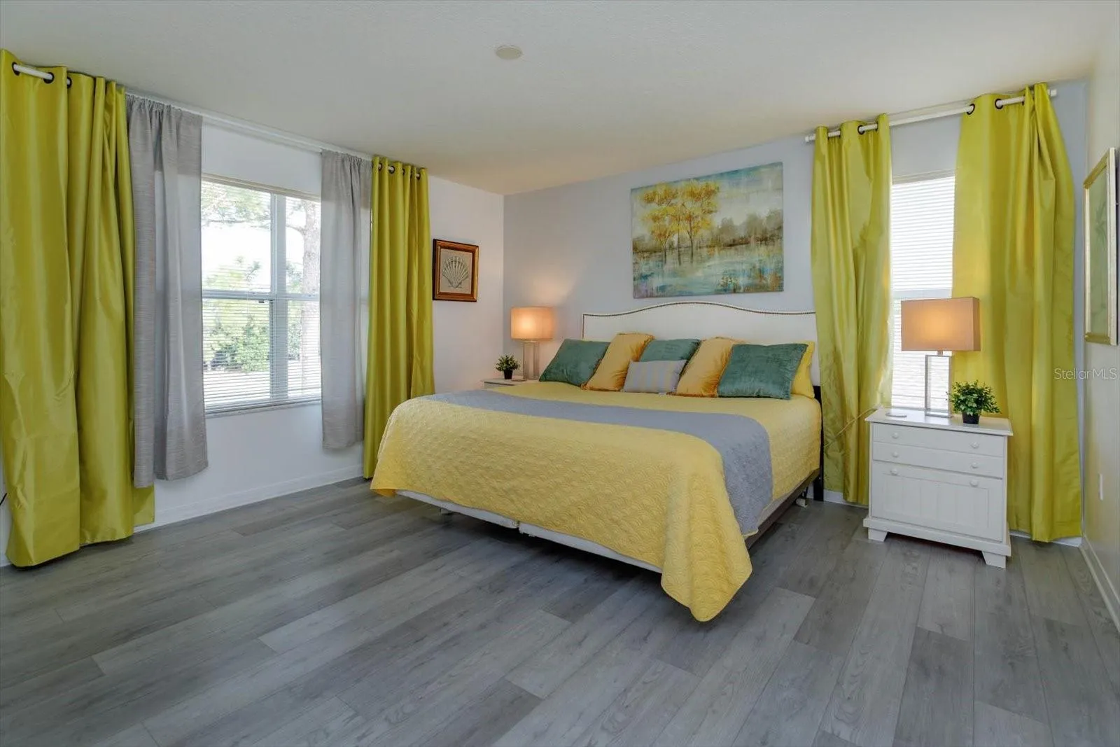Upstairs, the large primary suite includes a private en-suite bath complete with a garden tub, separate shower, and plenty of space to unwind. One bedroom is conveniently located on the ground floor and features sliding glass doors that open to the patio, along with a nearby full bathroom—perfect for guests or multi-generational living.
