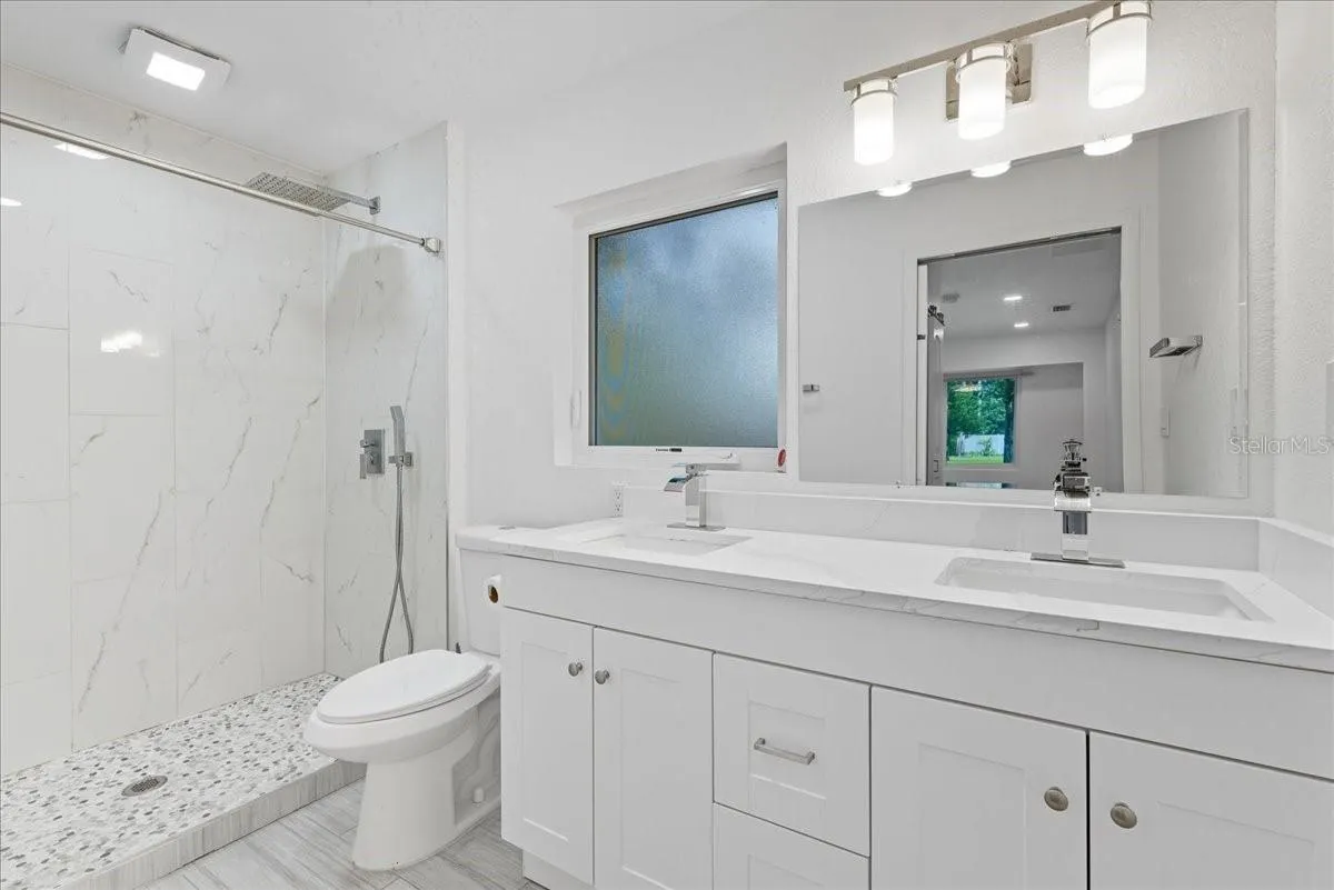 Beautifully appointed and renovated home in the Northwest Gainesville community of Hazel Heights. A professional contractor entirely remodeled this home, and permits were opened and closed. All work and upgrades were completed in January 2024, including new windows, plumbing, kitchen and laundry room. Upgraded electrical, HVAC, gas tankless Rheem water heater, attic insulation, and all exterior walls. New roof, quartz countertops in the kitchen and bathrooms, and you will appreciate the added space provided by a large pantry, a hallway linen closet, and extra cabinet storage in the laundry room. A spacious primary bedroom includes a large walk-in closet, a relaxing walk-in shower with custom tiles, and a dual vanity sink. The ample backyard space lends itself to a family soccer match. Call today for your private tour. Seller is offering flooring credit.