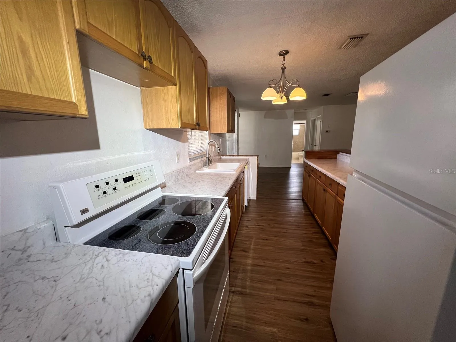 This charming 3 bedroom, 2 bathroom home offers comfort, functionality, and freedom with no HOA. Inside, the spacious kitchen features ample counter space with a large, durable laminate countertop in a classic marble-look design, providing plenty of room for meal prep, entertaining, or casual dining. The open living areas flow seamlessly to a screened-in lanai, perfect for relaxing or hosting guests, while the fenced backyard offers privacy and space for pets, play, or outdoor gatherings. Home is equipped with a 2.5 ton, 14 SEER HVAC system, providing efficient cooling and comfort year-round. Beautifully upgraded wood flooring, installed just 2 years ago, adds warmth and modern style throughout the home. With a motivated seller, this home presents an excellent opportunity for buyers—schedule your showing today!