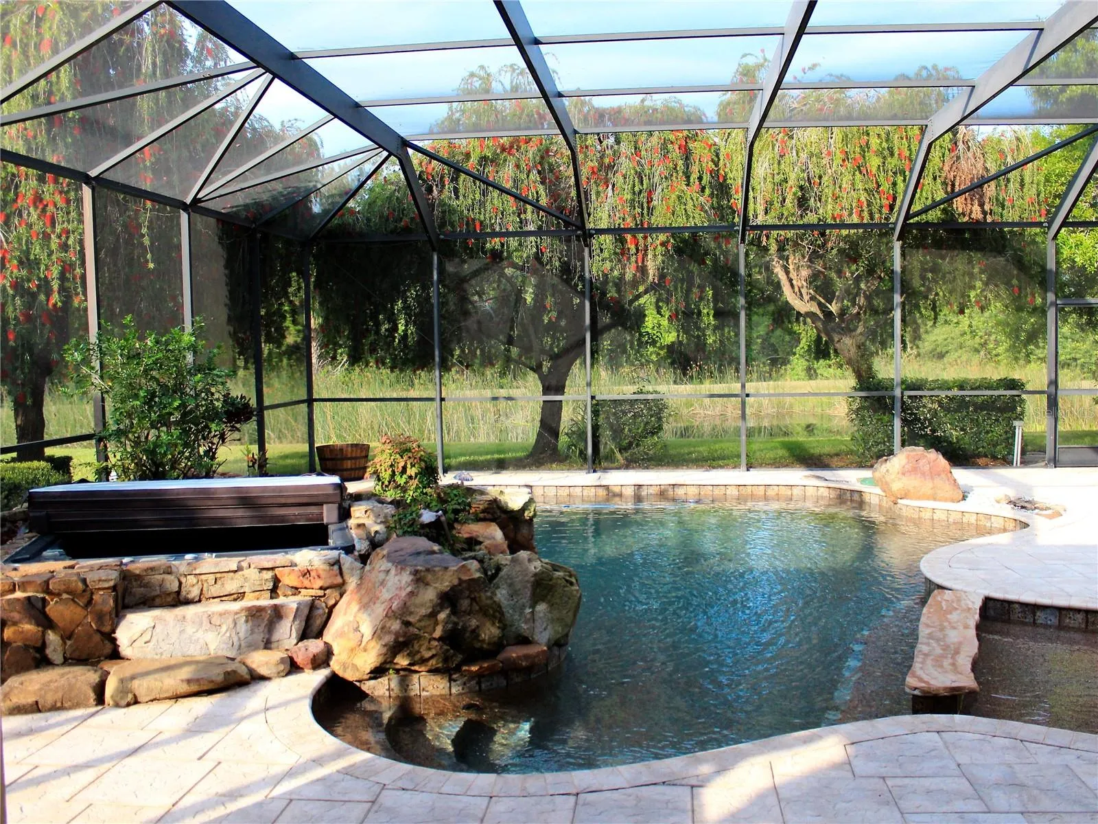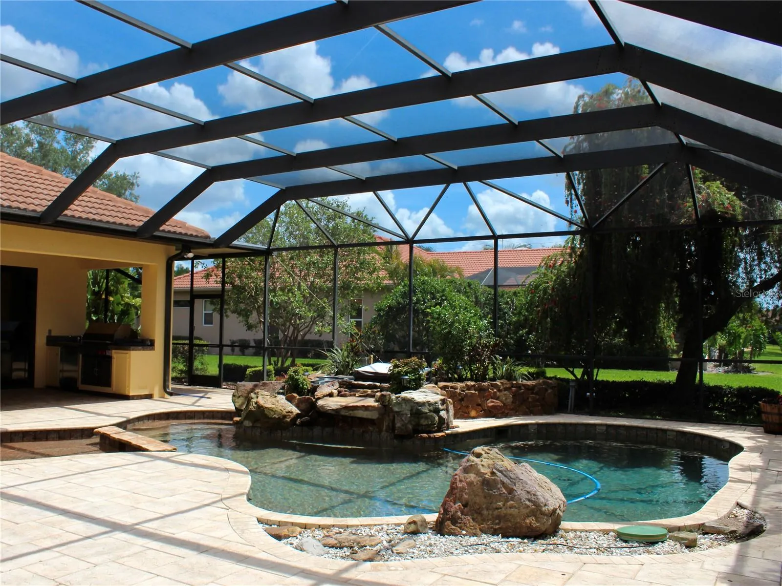 Luxury meets serenity. This Spanish/Mediterranean style home possesses some of the most enchanting backyard views available in Greyhawk Landing! The spaciously designed, 3,521 sqft, open floor plan, welcomes plenty of natural light to create a fluid, interconnected living and dining environment. Featuring granite countertops, wood cabinetry, and stainless-steel appliances; take pleasure in the gourmet kitchen, complete with a breakfast bar and kitchen dining area. Pocket sliding glass doors situated throughout the home offer a total of five access points straight to the backyard, allowing breathtaking views from every angle. The primary bedroom features two capacious walk-in closets, roman shower, jetted tub, and dual vanities. Three additional bedrooms with ample closet space provide both comfort and functionality; accompanied by two other bathrooms: one full, one half. The home generously includes two extra rooms: an office and bonus room. The outdoor space is a private sanctuary with its heated salt-water pool, integrated hot tub, rock waterfall, deck jets, and a summer kitchen — perfect for entertaining. A private pond reflects the surrounding beauty, creating a tranquil escape to unwind in the sights and sounds of nature. Enjoy peaceful moments fishing in the pond or explore nearby nature trails within your gated community. Located within 0.5 miles of all your community upscale amenities including: pool, spa, clubhouse, fitness center, playground, pickleball courts, basketball courts, soccer fields and baseball fields. This home offers the best of both worlds — privacy and convenience. Plus, it’s zoned for A-rated schools.Come check out your dream home!