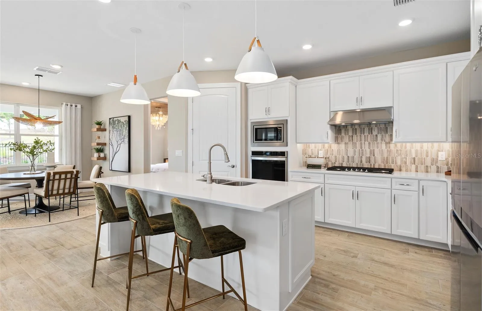 Step into the Mystique by Pulte, a single-story home offering 2 spacious bedrooms, 2 beautifully appointed bathrooms, and an enclosed flex room—perfect for a home office or quiet retreat. The open-concept layout seamlessly connects the gourmet kitchen, café, and gathering room, creating an airy atmosphere. The many windows bathe the entire space in natural light, elevating the overall feeling of openness. The heart of the home is the chef-inspired kitchen, where Dana White cabinetry meets luxurious Lagoon Quartz countertops. Thoughtfully designed features like soft-close drawers, easy-reach corner cabinets, double roll-out trays, and a waste basket drawer make the kitchen as functional as it is beautiful. A decorative tile backsplash and stainless-steel single bowl sink enhance the space, while the Whirlpool stainless steel appliances—including a natural gas range and a refrigerator—ensure you have everything you need for both everyday meals and special occasions. The kitchen flows effortlessly into the café and gathering room, where a pocket sliding glass door leads to the extended covered lanai, making this home ideal for seamless indoor-outdoor living. Retreat to the luxurious owner’s suite, a serene sanctuary with a spacious walk-in closet and a spa-like en suite bathroom. Dual vanity sinks, a walk-in shower with rain shower head, an enclosed toilet, and a linen closet complete the tranquil space. The additional spare bedroom and bathroom, along with the enclosed flex room, provide ample space for family and guests. The upgraded laundry room with cabinetry, countertops, and Whirlpool washer and dryer make daily tasks a breeze. Every detail of this home has been carefully curated, from the Shaw wood-look luxury vinyl plank flooring throughout to the tile in the bathrooms and laundry. Designer-curated finishes elevate every corner of this home, including pendant pre-wire in the kitchen, brushed nickel hardware and plumbing fixtures, 2” faux wood blinds, 8’ interior doors, comfort-height toilets, and Sherwin Williams City Loft Interior Wall Paint throughout. The 2-car garage offers extra tandem storage space, ensuring that every part of your home is both beautiful and practical. With its stunning design and thoughtful touches, the Mystique home provides the perfect blend of luxury and functionality for today’s lifestyle.