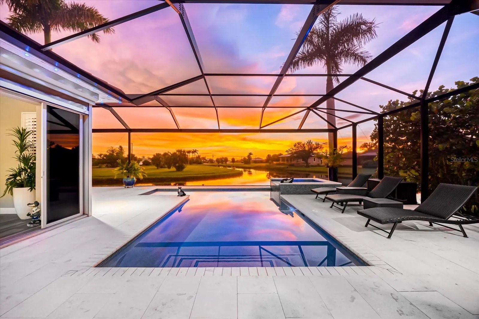 One of the standout features of this home is the 90-degree multi-slide pocket doors, which fully retract to create a seamless transition between the indoor living space and the expansive lanai. This design floods the interior with natural light and offers unobstructed views of the lake and stunning sunsets, perfectly complementing the open-concept layout and Florida lifestyle. Outside, enjoy a brand-new saltwater pool and spa (2024), surrounded by 1,500 sq ft of white limestone pavers and enclosed in a new picture window pool cage. The lanai is vented and prepped for an outdoor kitchen, making it an ideal space for entertaining or relaxing in style.
