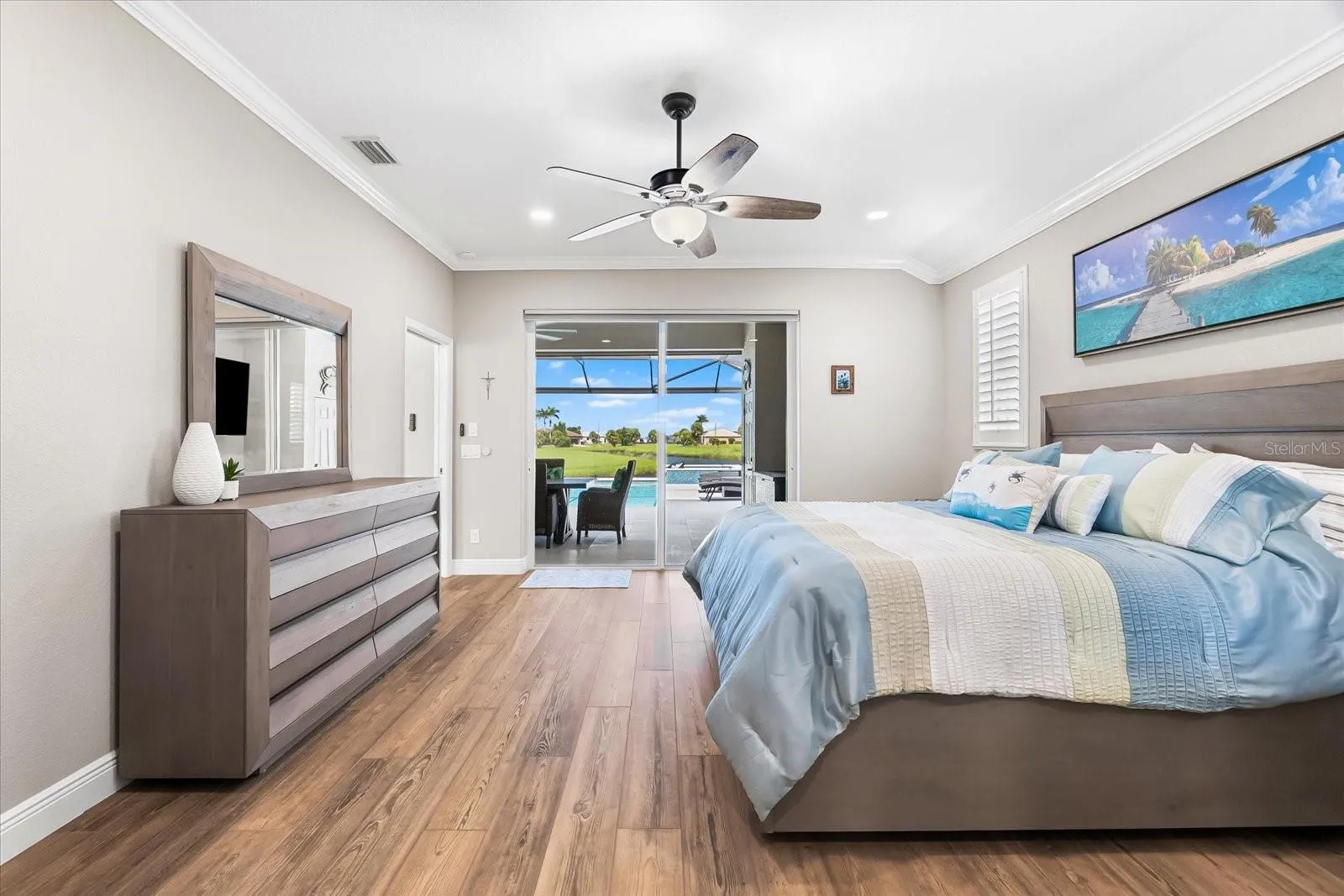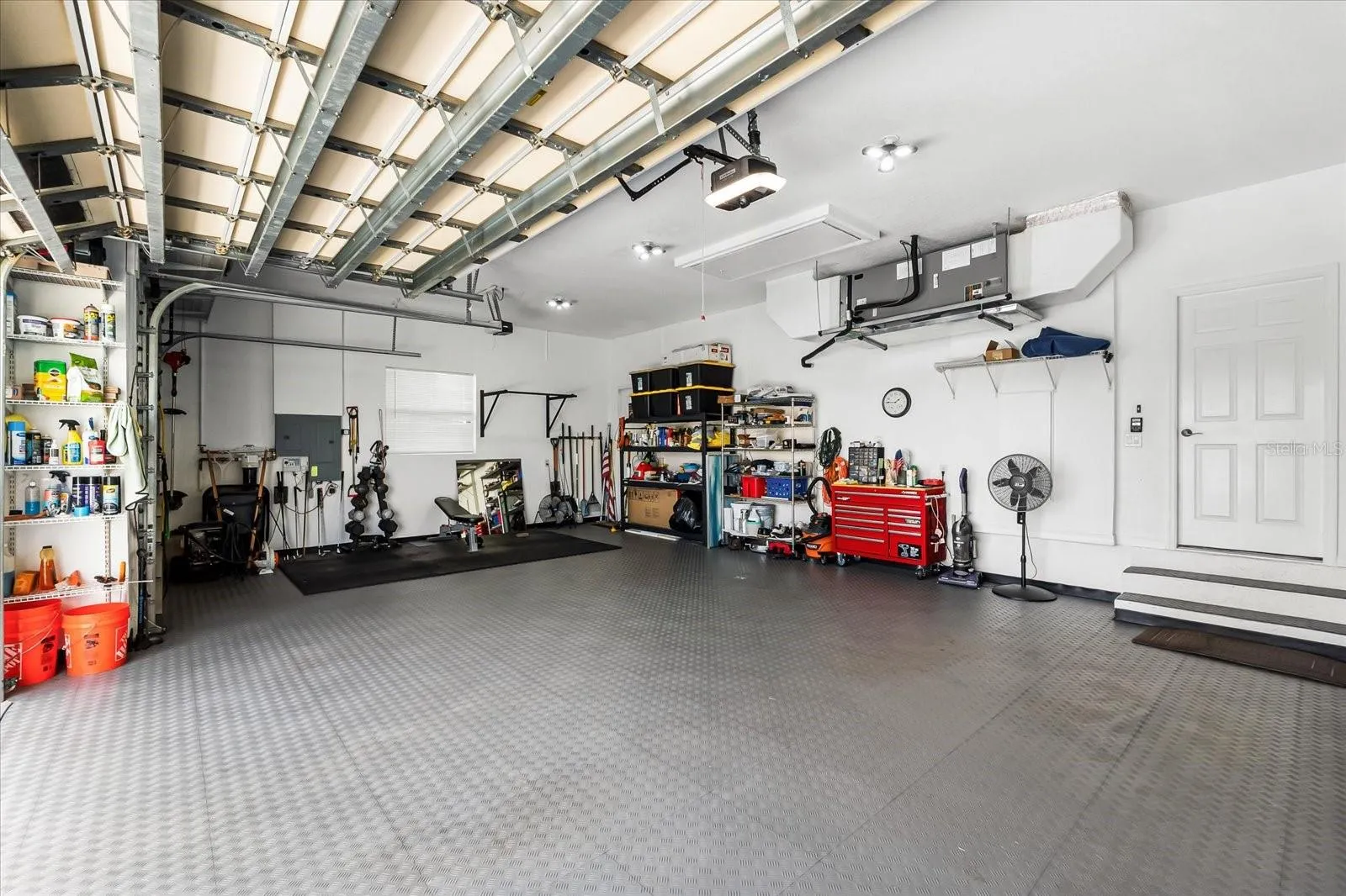 Outdoor enhancements include a new hot water heater (2025), new pool pump (2025), and a new irrigation pump (2025) with lake water irrigation and expanded zones. The exterior shines with new landscape lighting, coach lights, and rock beds with concrete curbing. Additional features include Storm Smart hurricane shades, accordion shutters on all windows, hurricane rated garage doors with new motors, springs and coils.The garage also features durable, interlocking flooring designed for long-lasting performance and easy maintenance.