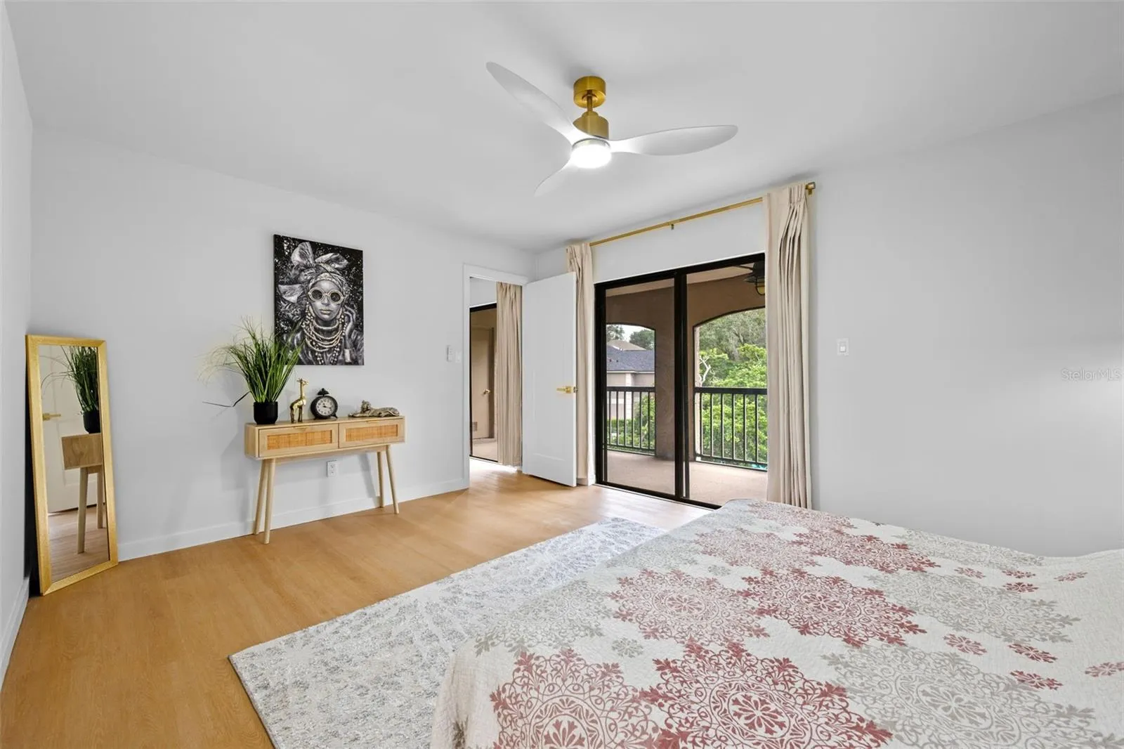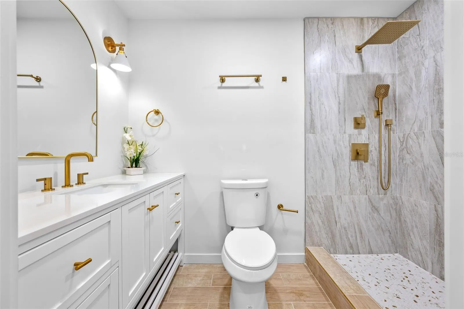 The primary suite is a private retreat with direct lanai access, a newly built walk-in closet, and a custom makeup vanity. The fully remodeled en-suite bathroom features a large vanity, new toilet, and a designer tile shower with premium fixtures. The guest bedroom is thoughtfully located on the opposite side of the unit for added privacy, with a fully remodeled second bathroom featuring high-end finishes.