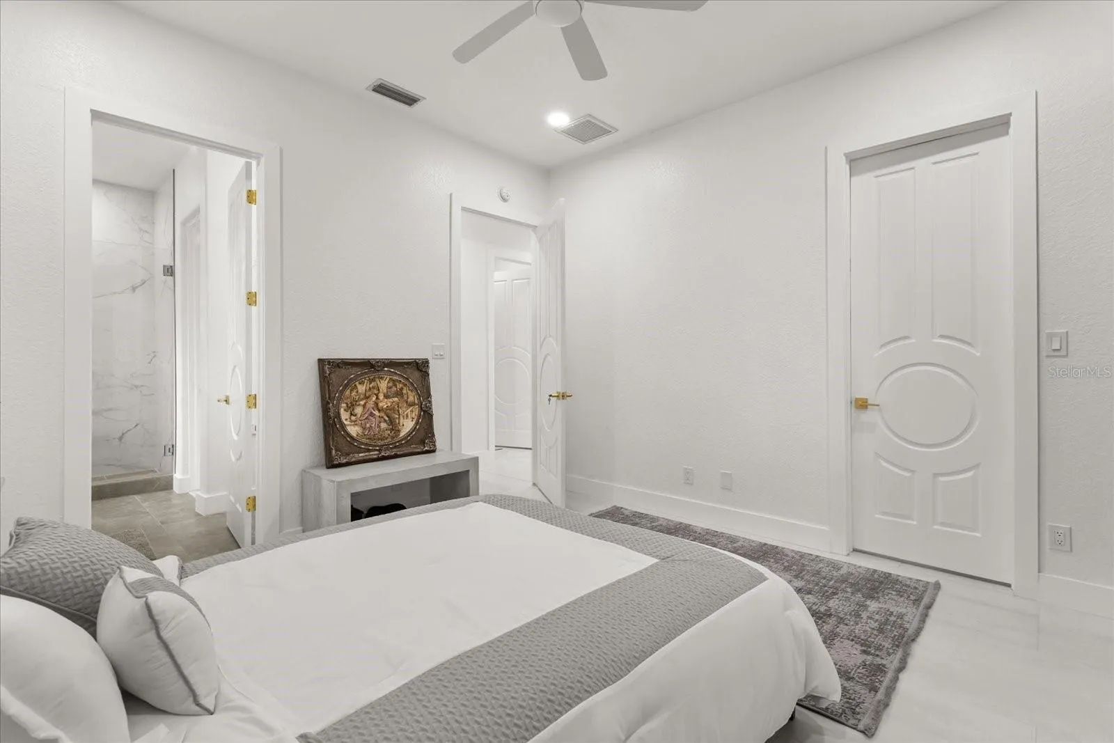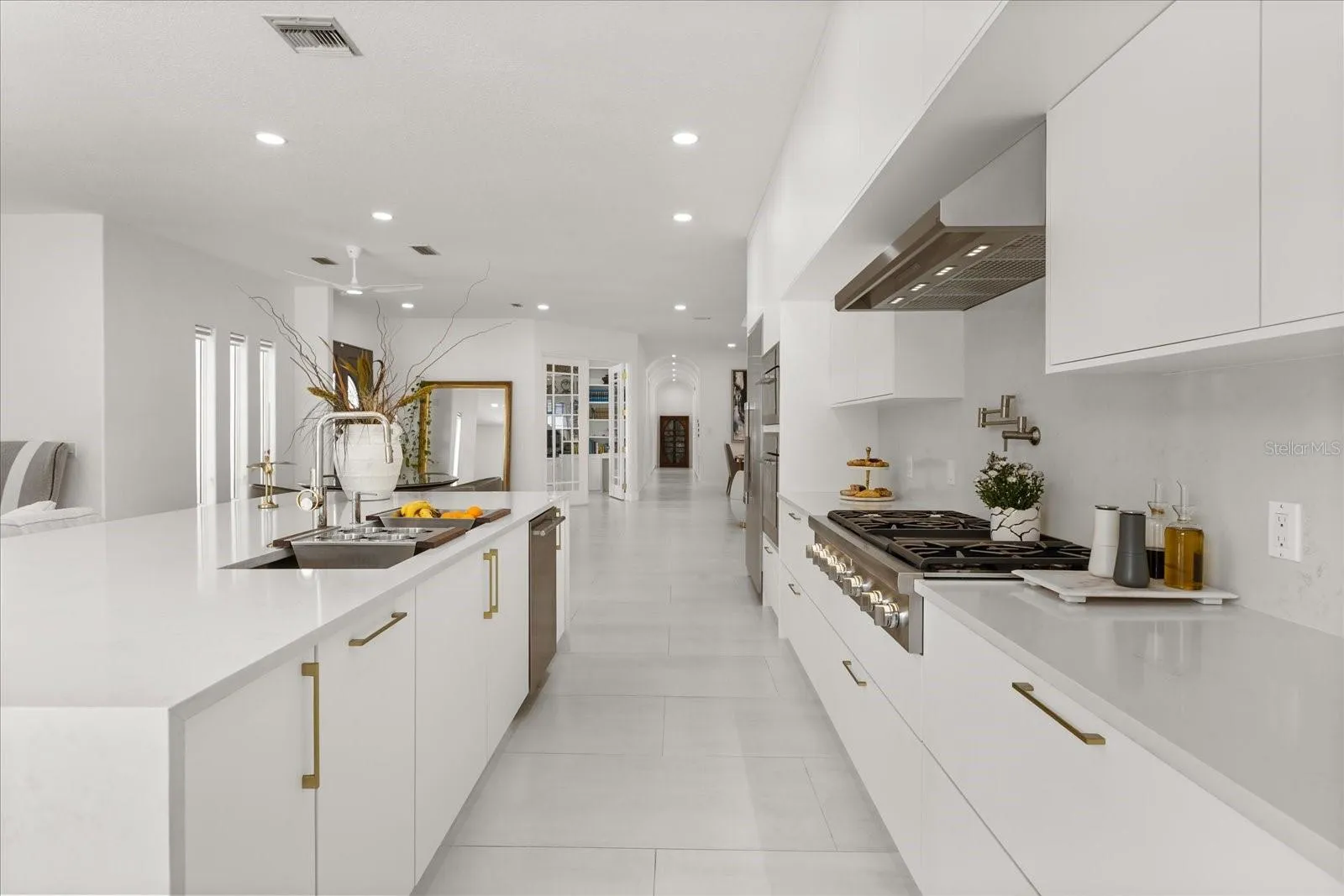Inside the main home, the living space unfolds across a single story with soaring ceilings, custom built-ins, and expansive gathering areas. The gourmet kitchen is a chef’s delight, featuring a gas cooktop, built-in oven, 42” cabinetry, and generous counter space for entertaining. A gas fireplace anchors the family room, while French doors—imported from Italy—open to the screened pool, patio, and expansive backyard. All doors throughout the home are 8-foot doors, also imported from Italy, adding to the property’s refined architectural appeal.