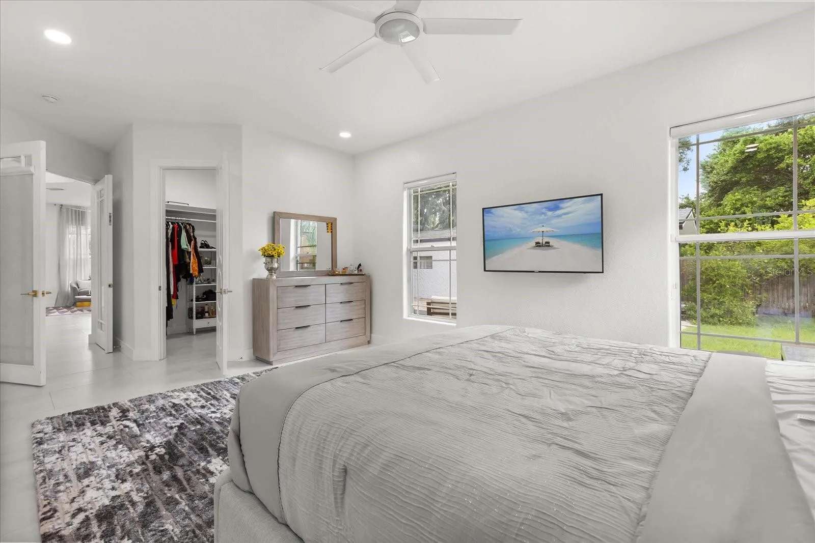 The oversized primary suite feels like a retreat with its spa-inspired bath, oversized walk-in closet, and serene views of the pool and canal. Four additional bedrooms provide comfort for family or guests.