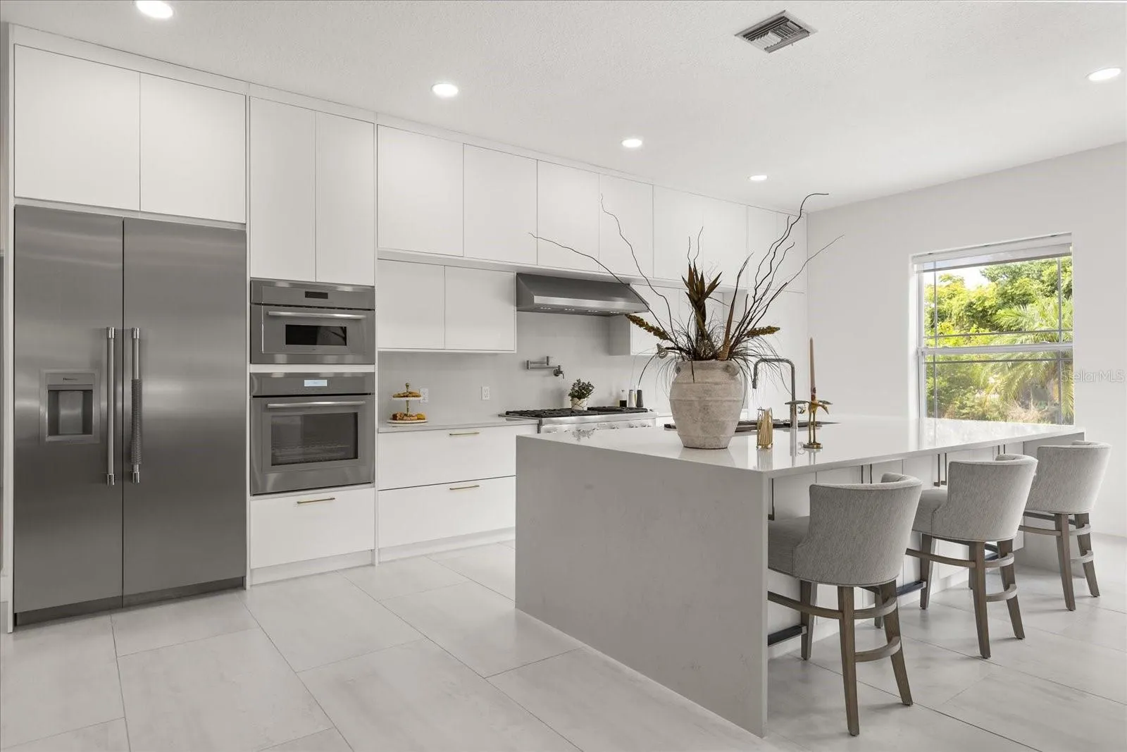 Inside the main home, the living space unfolds across a single story with soaring ceilings, custom built-ins, and expansive gathering areas. The gourmet kitchen is a chef’s delight, featuring a gas cooktop, built-in oven, 42” cabinetry, and generous counter space for entertaining. A gas fireplace anchors the family room, while French doors open to the screened pool, patio, and expansive backyard.