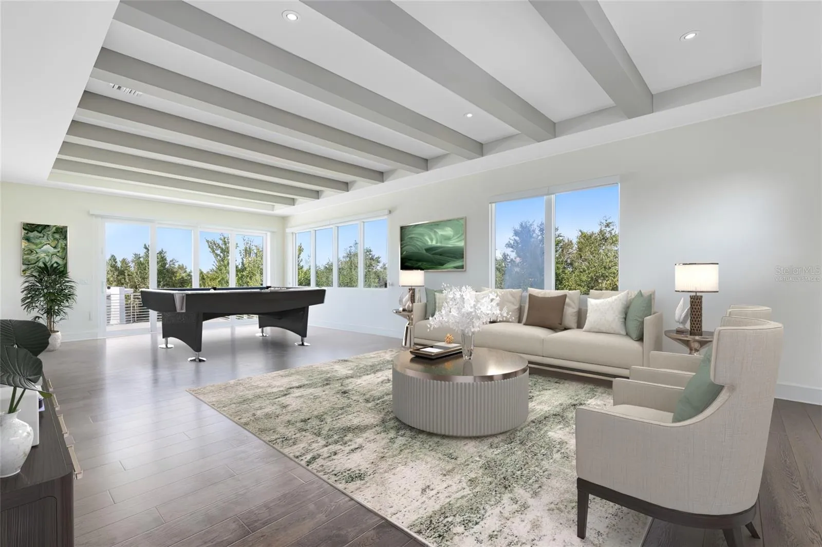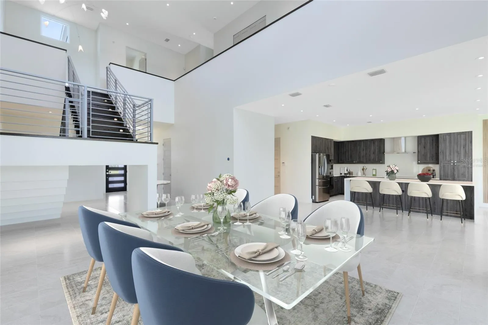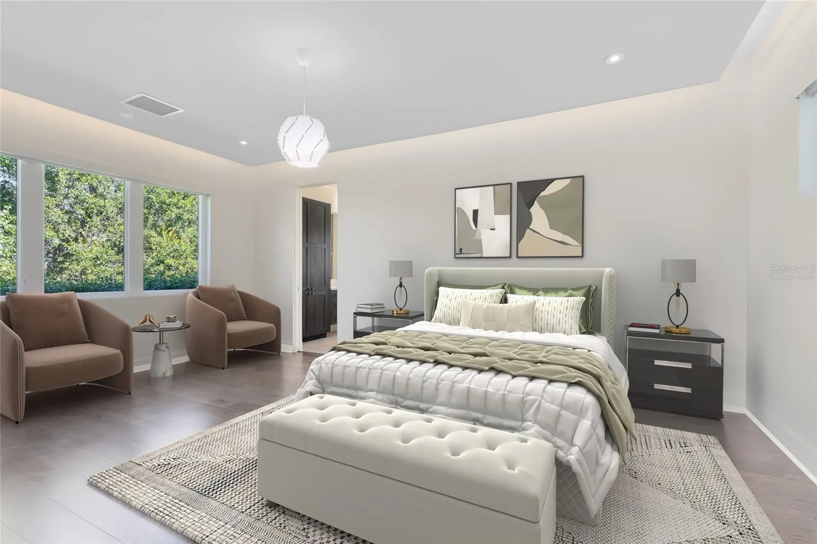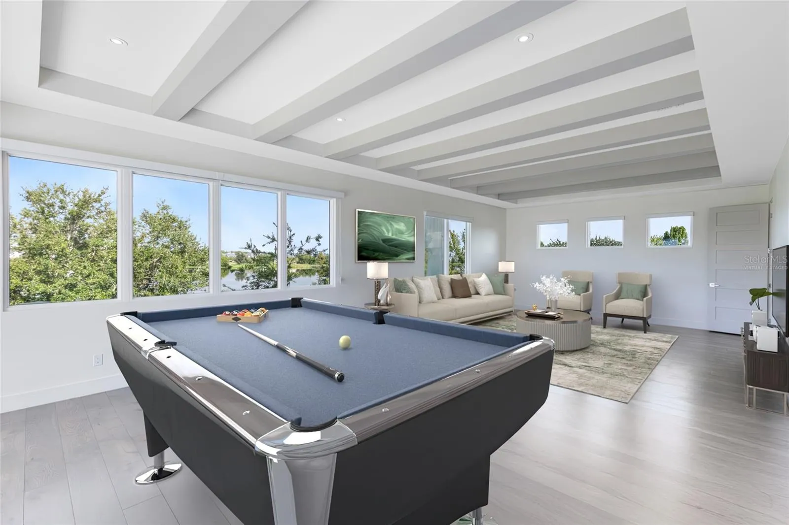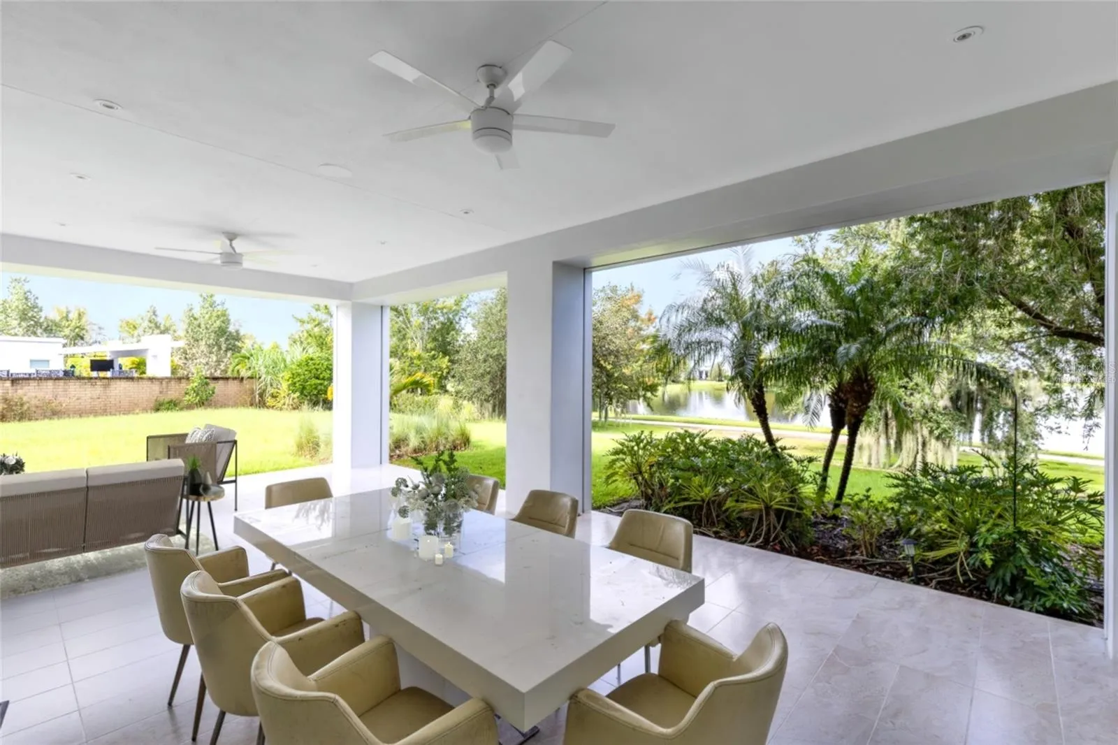 The heart of the home is the expansive great room with soaring ceilings, $20K designer chandeliers, and walls of glass that flood the space with natural light. The chef’s kitchen showcases waterfall-edge quartz countertops, custom cabinetry, premium appliances, and a large island with seating. Seamless indoor-outdoor living extends through sliding glass doors to the covered lanai and backyard with peaceful lake views.