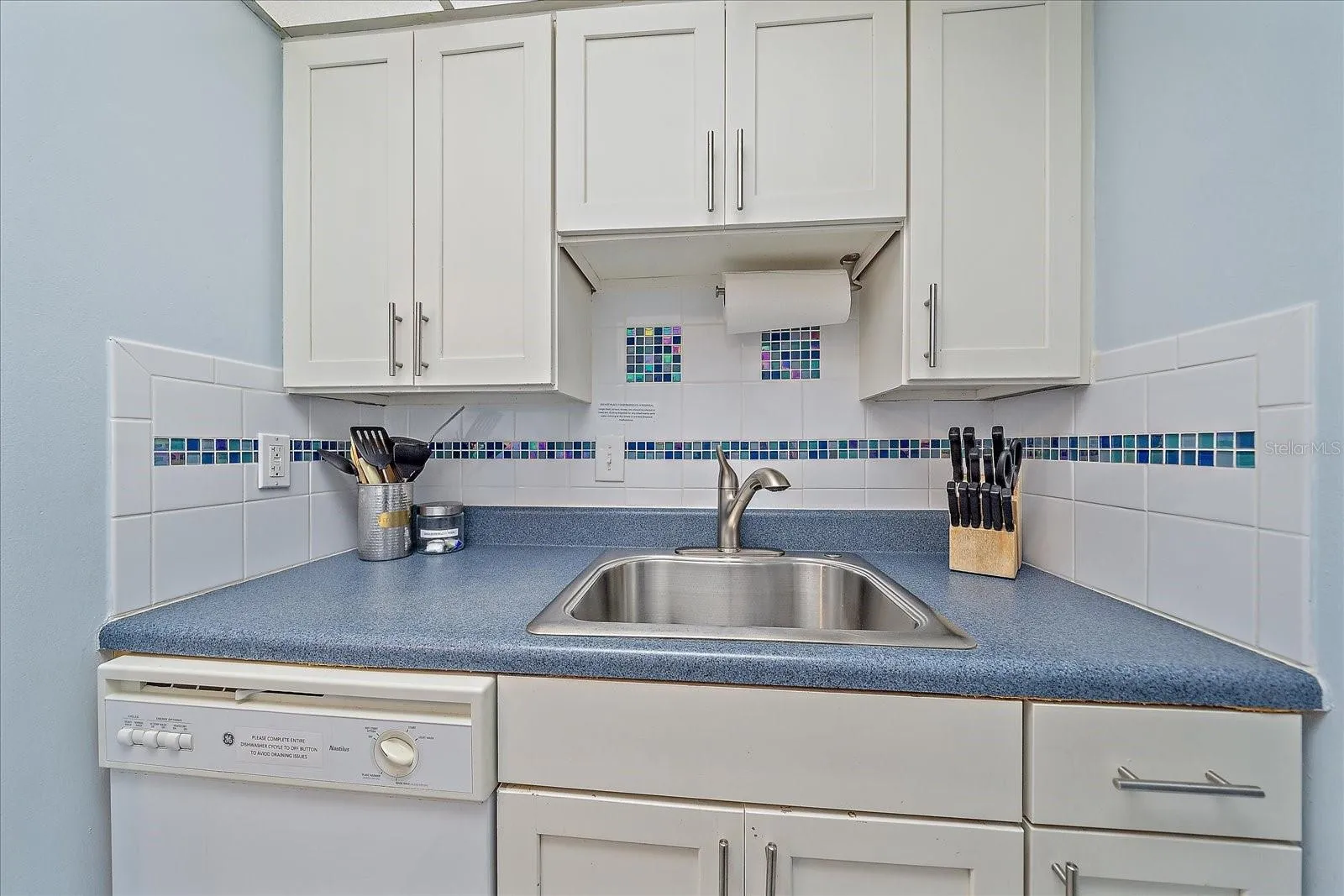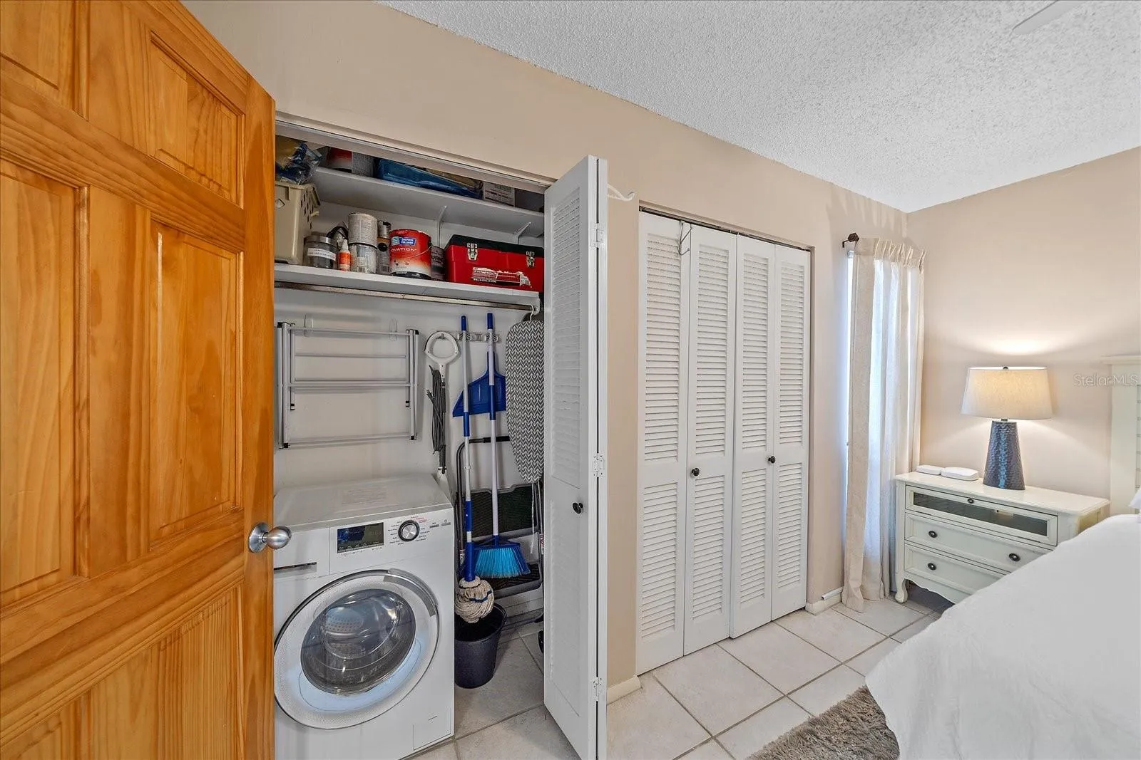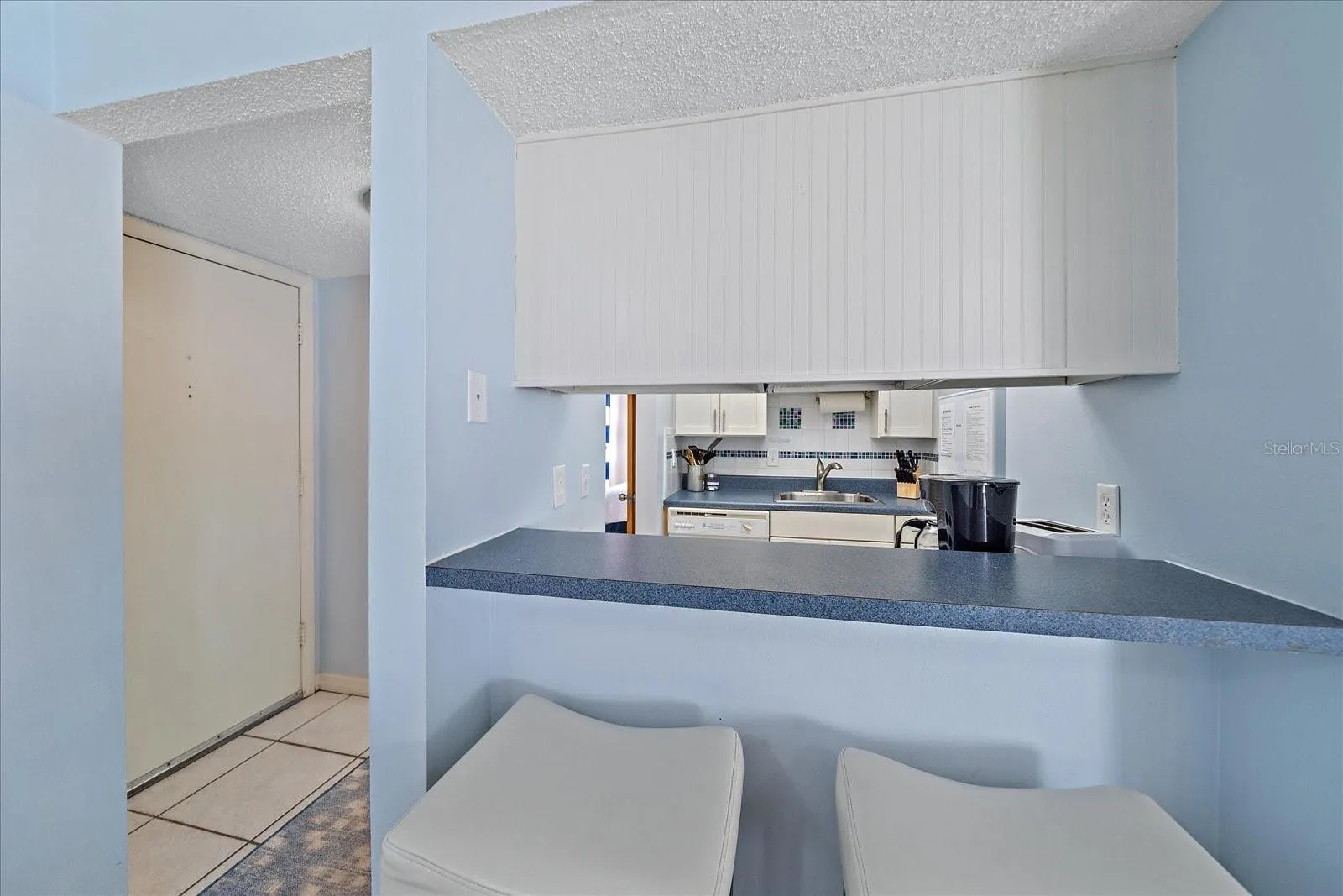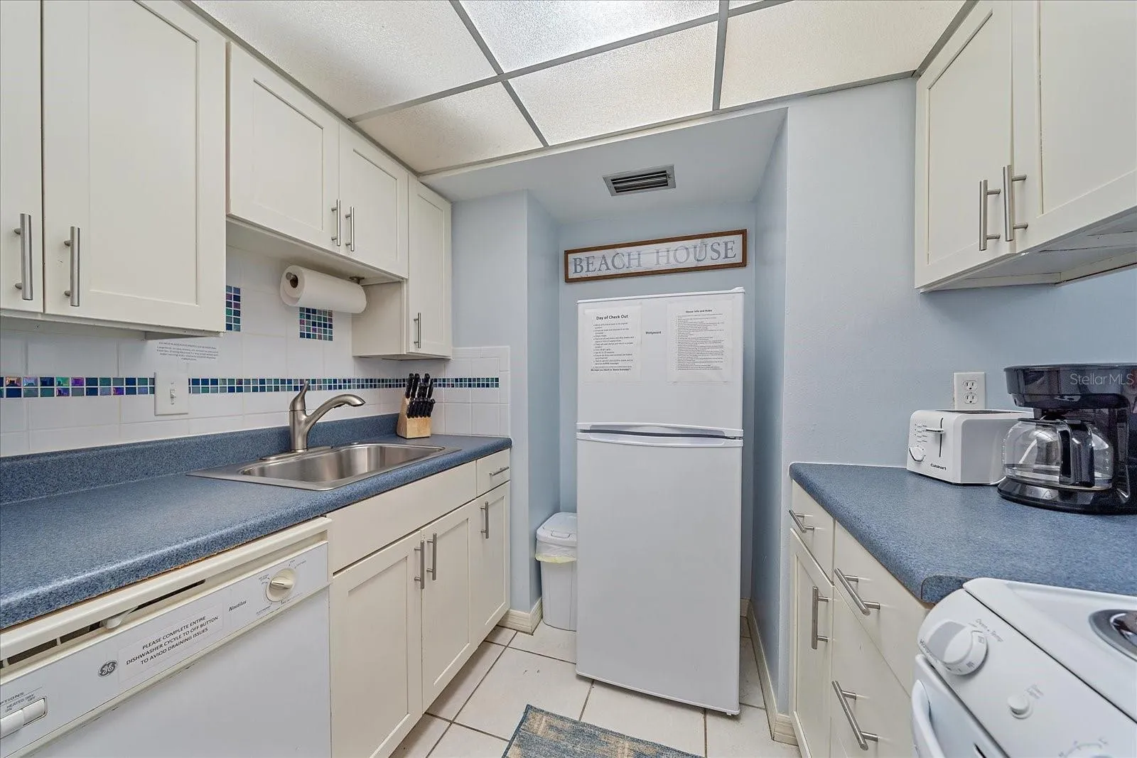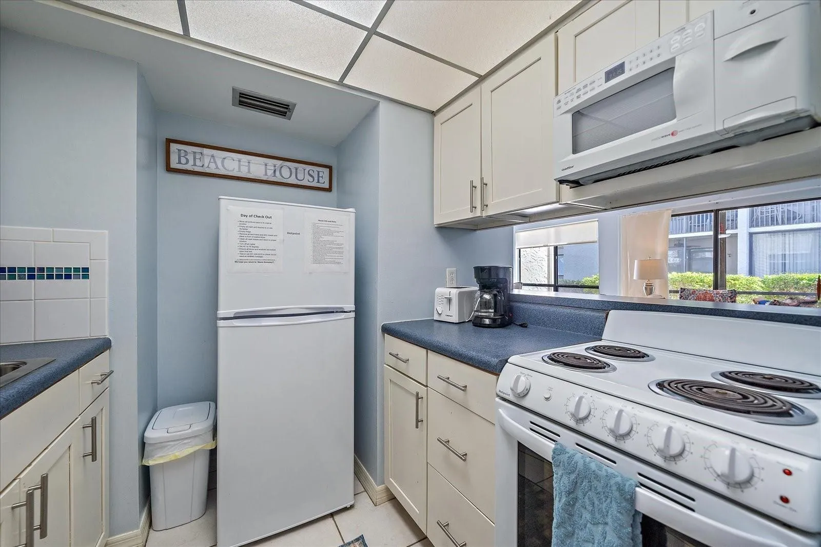 Inside, this light, bright, and cheerful condo features a split bedroom floor plan for privacy, all-tile flooring throughout for easy care, and an open living area with direct access to a private covered balcony—perfect for morning coffee or evening cocktails. The open galley kitchen includes a cozy eat-in space for two. The primary suite offers a shared vanity area with sink and a private glass walk-in tiled shower, plus a private washer/dryer combo unit in the side closet. The guest bedroom has a large window and sits privately away from the master bedroom.