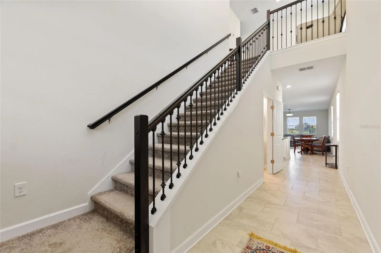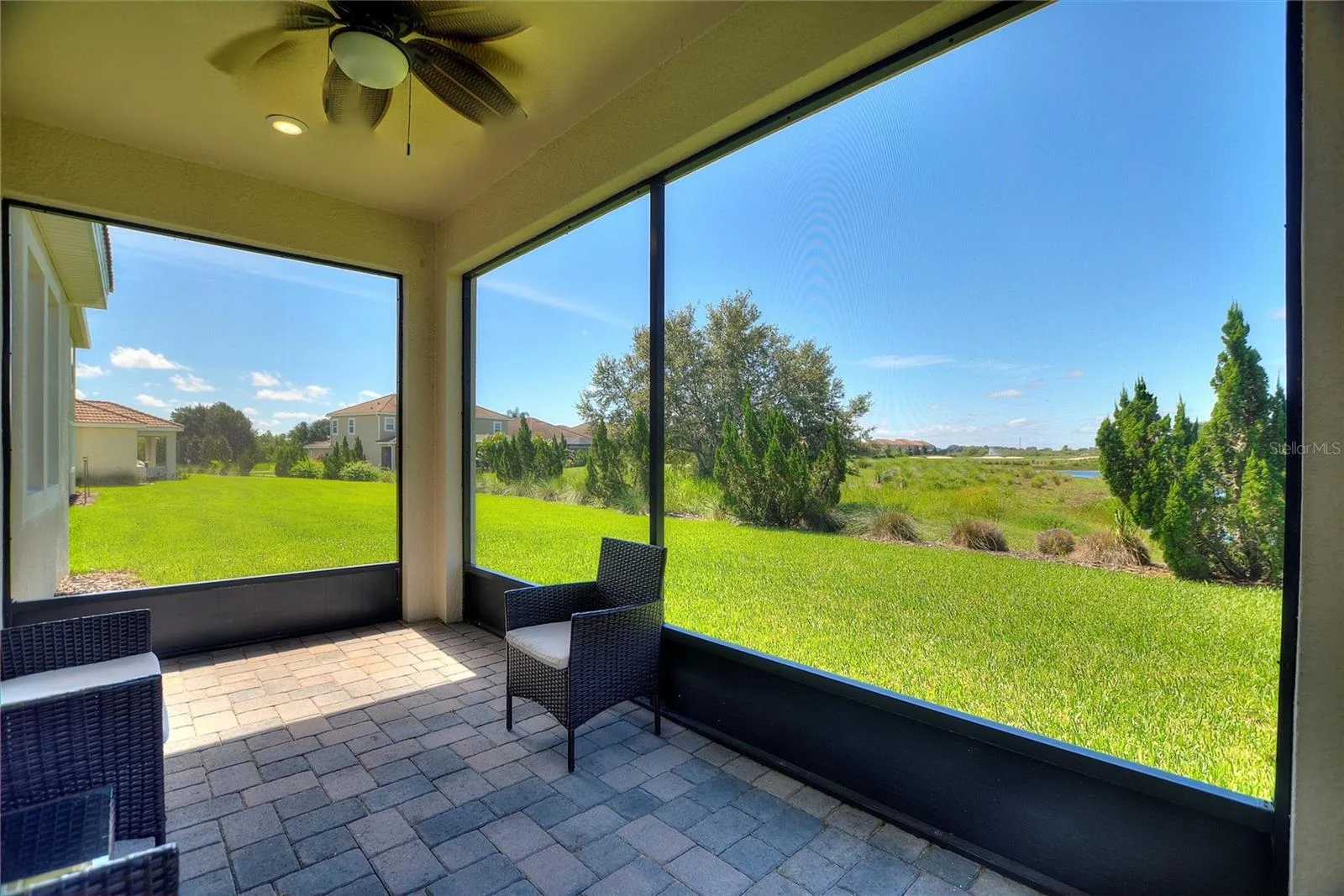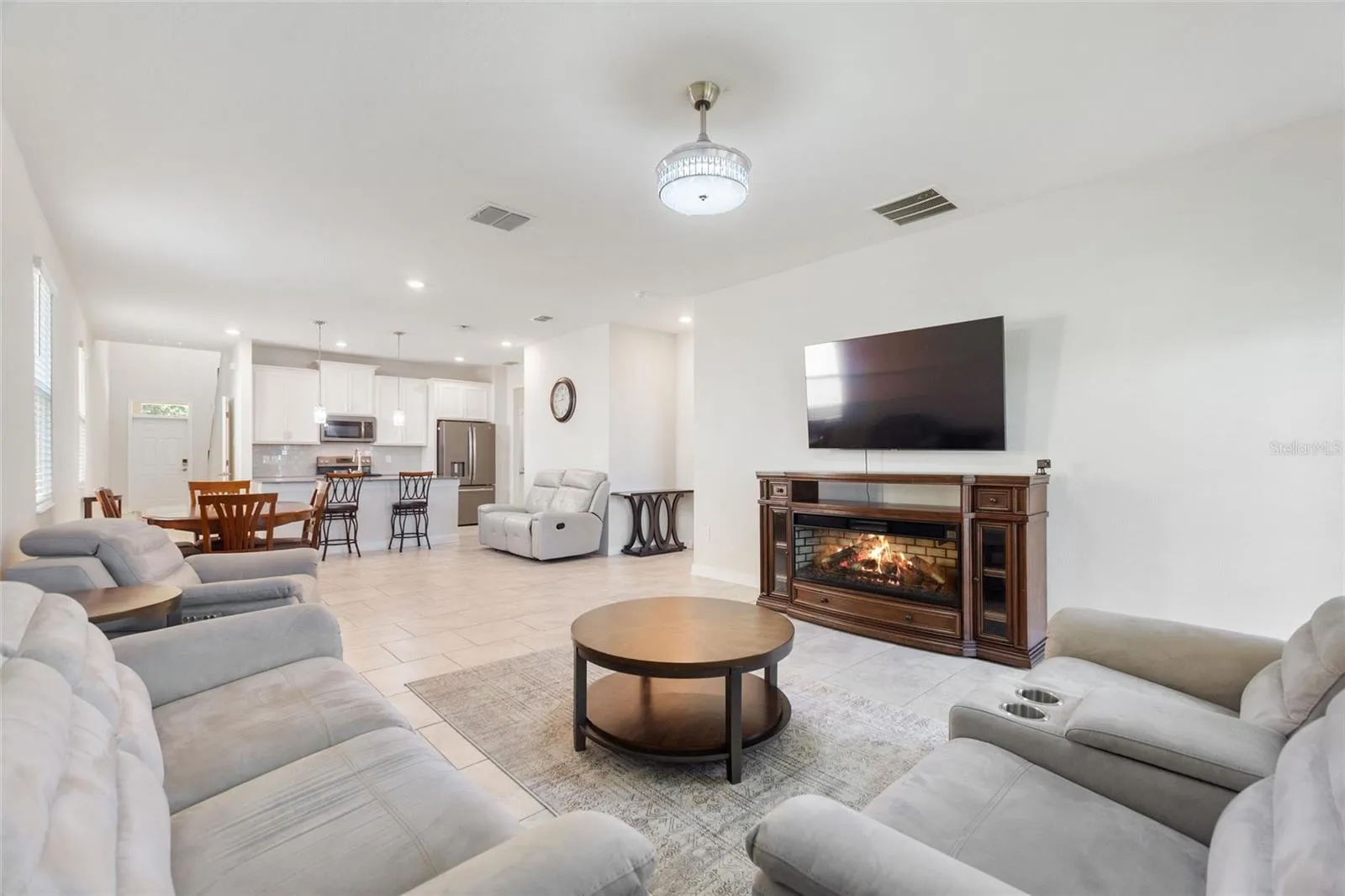 The spacious primary suite is conveniently located on the main level, offering comfort and privacy. The open-concept living area features a generous family room that flows effortlessly to the screened-in covered lanai, ideal for relaxing or entertaining while soaking in the serene scenery. Upstairs, a versatile loft provides additional living space, perfect for a home office, media room, or play area.
