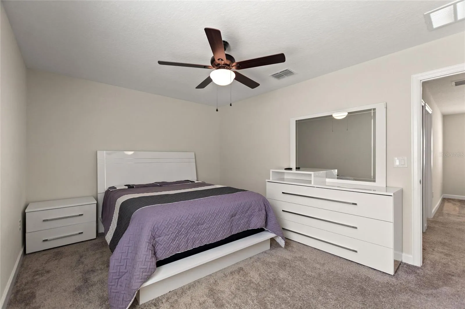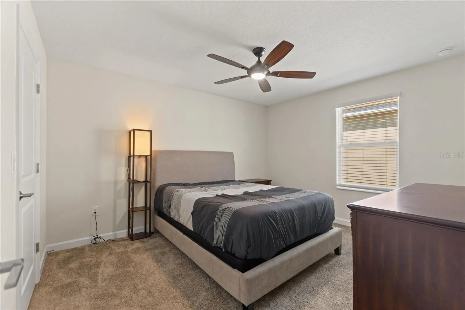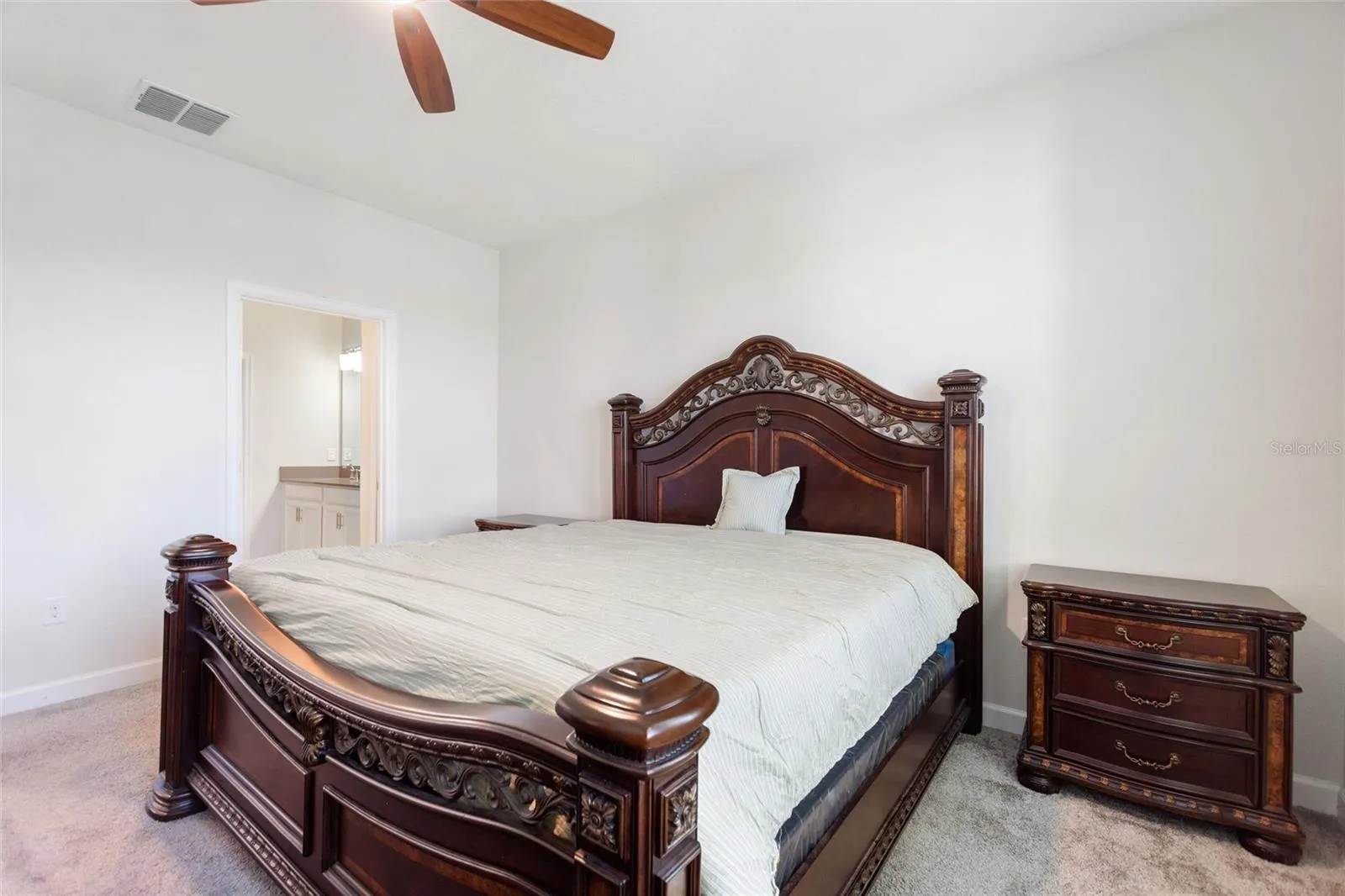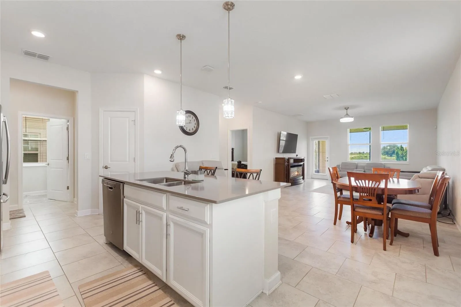 The spacious primary suite is conveniently located on the main level, offering comfort and privacy. The open-concept living area features a generous family room that flows effortlessly to the screened-in covered lanai, ideal for relaxing or entertaining while soaking in the serene scenery. Upstairs, a versatile loft provides additional living space, perfect for a home office, media room, or play area.