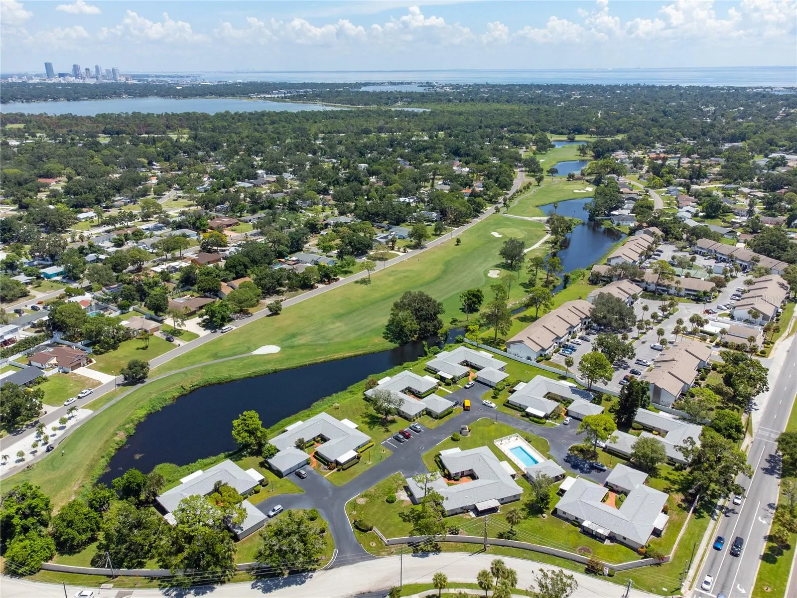 Welcome home to your Country Club Villa! Move-in ready. furnished or unfurnished. The location is ideal overlooking the 13th Fairway and a serene pond. The property is situated steps away from the highly sought after St. Petersburg Country Club, which offers several amenities such as golf, tennis, swimming, fitness, event space, a restaurant, and more! For more information call the ST PETERSBURG COUNTRY CLUB. Once arriving at the quaint Country Club Villas community, you will notice the meticulously manicured grounds and how charming the community is. Upon entry into your end unit, please take note of the abundance of natural light and how open the floorplan is laid out which is perfect for those that love to entertain or just like the open feel. The main living area is shared with the dining area and overlooks the incredibly large, enclosed lanai. There are 2 bedrooms and 2 baths along with an indoor laundry that comes with a Full size Washer and Dryer. The bedrooms are quite sizable. The master bath ensuite includes a separate vanity space from the walk in shower. The guest bath has a walk in shower. The Lanai is approximately 188 sq ft of bonus space overlooking the beautiful 13th fairway and small pond. This “bonus” space could easily be utilized as a home office, art studio, fitness room, and/or an additional entertaining area. The unit is conveniently located near the beautiful community pool and your personal garage/additional storage area. HOA fee includes cable TV, water, sewer, trash, exterior & grounds maintenance, pool maintenance, pest control and more! Don’t miss your opportunity to own this great Villa home in a highly desirable area- only 6 minutes to Eckerd College and 10 minutes to Downtown St Pete or St Pete Beach! 5 minutes or less to 2 major grocery stores and shopping. Downtown is approx 8 min away.