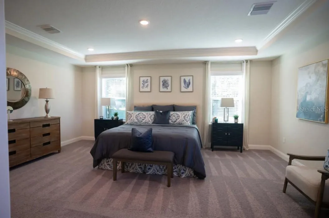 The expansive great room, enhanced by six flush mount LED lights and an additional window, offers the perfect setting for both relaxation and entertaining. Adjacent to the great room, a den with double French doors and sidelights, crowned by its own tray ceiling, provides a versatile space for work or quiet retreat.
