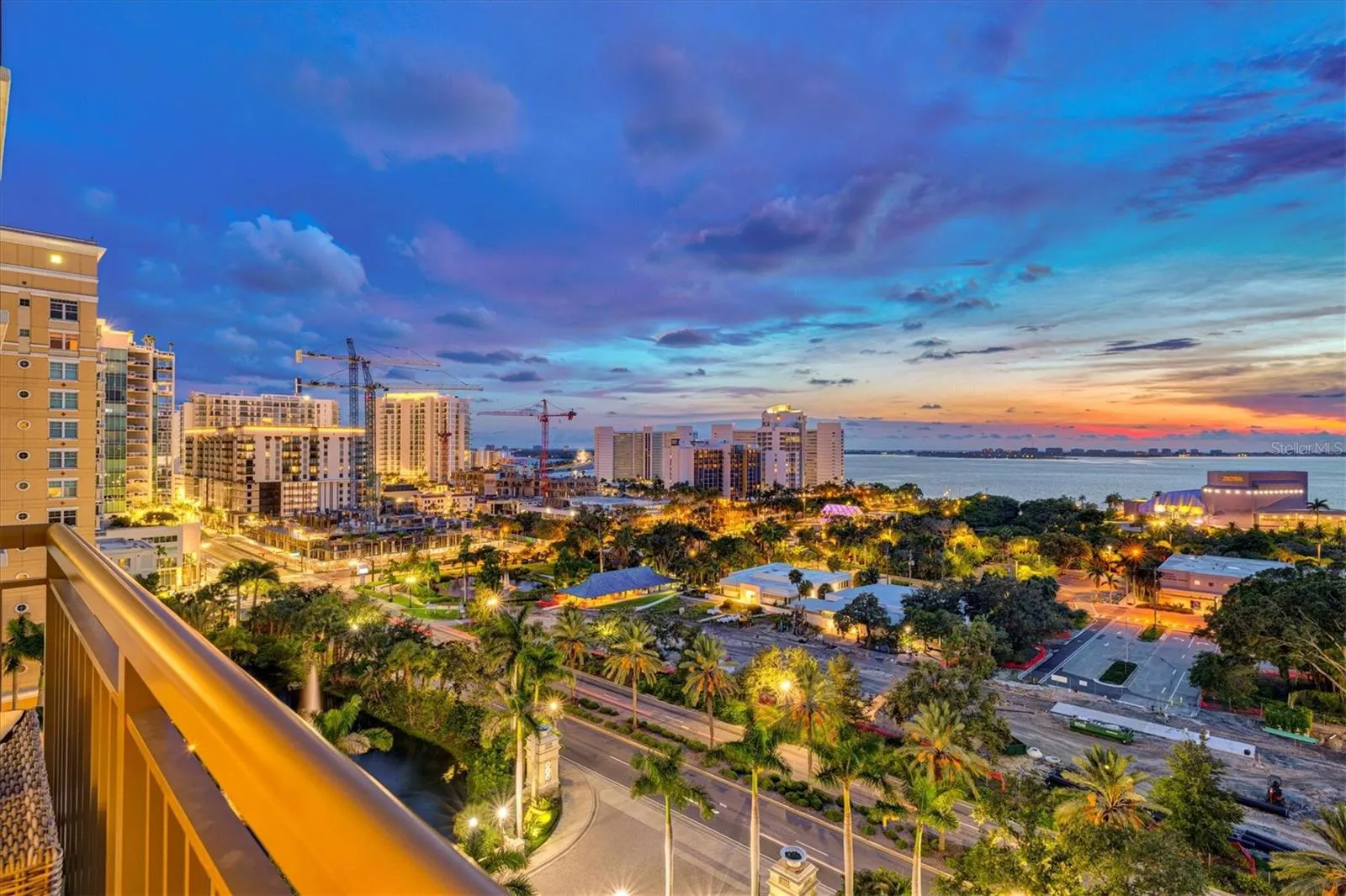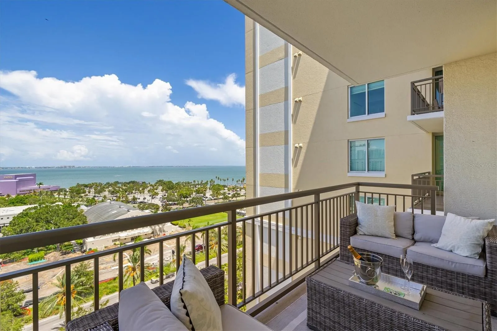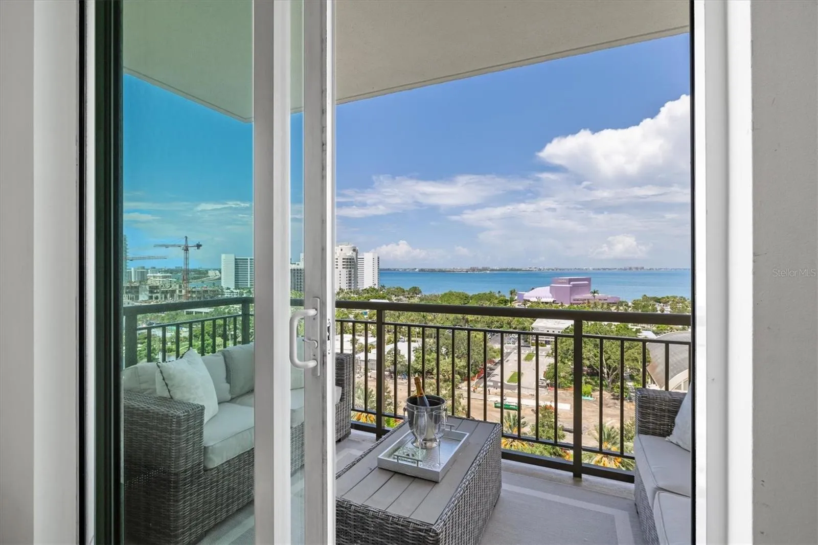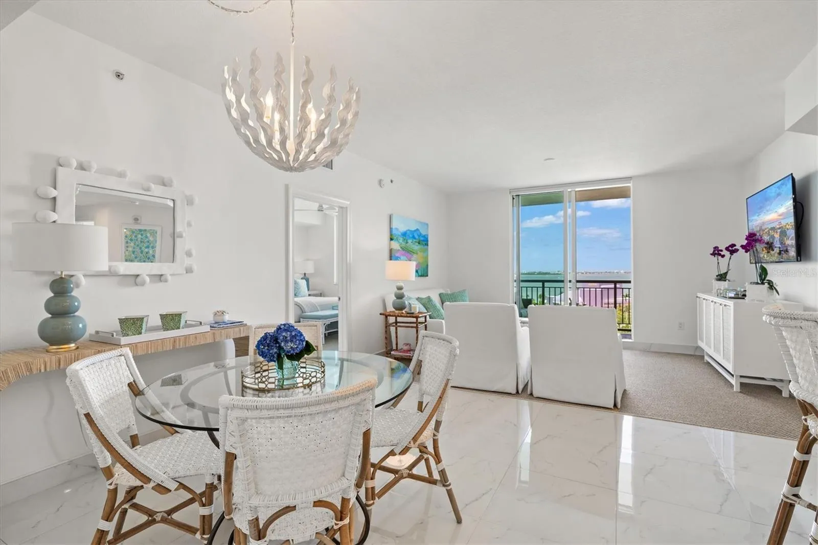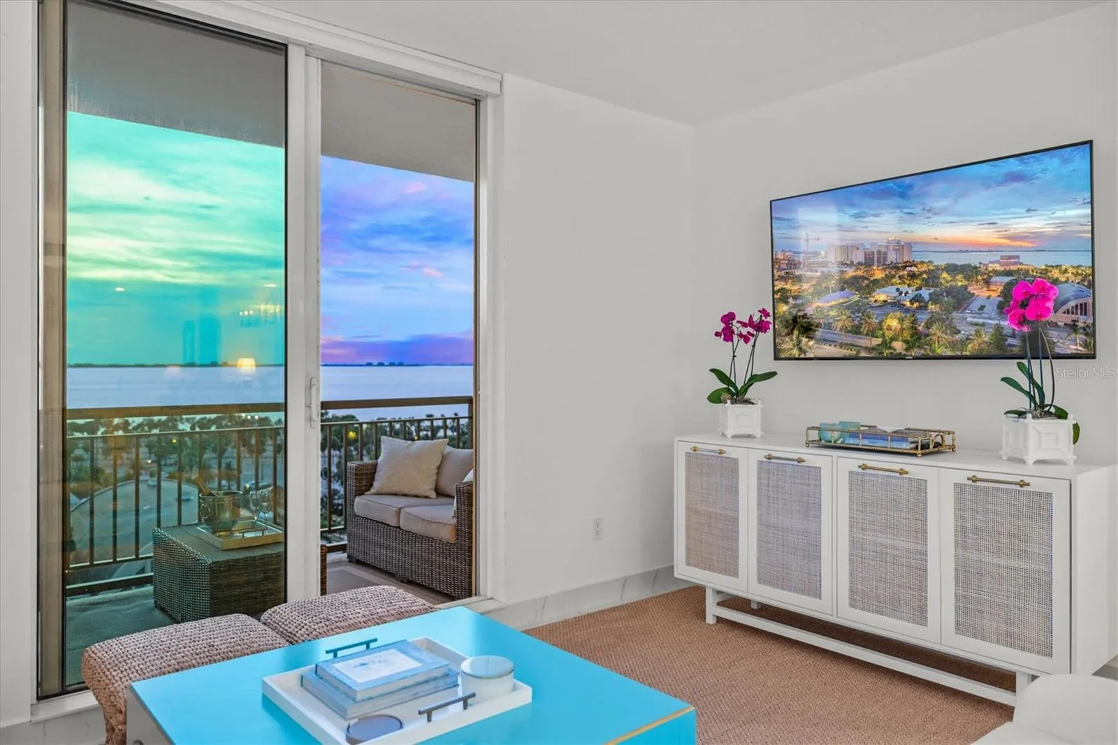 Welcome to the pinnacle of coastal luxury living! Prepare to be captivated by this stunning two-bedroom, two-bath unit in the heart of downtown Sarasota. Step inside and be instantly greeted by a bright, open floor plan that feels like a breath of fresh air. Sunlight dances across the gleaming marble floors, creating an ethereal, cloud-like ambiance—even from your 11th-floor sanctuary. Gorgeous porcelain tiles extend to the baseboards, creating a seamless look that is as easy to clean as it is beautiful.