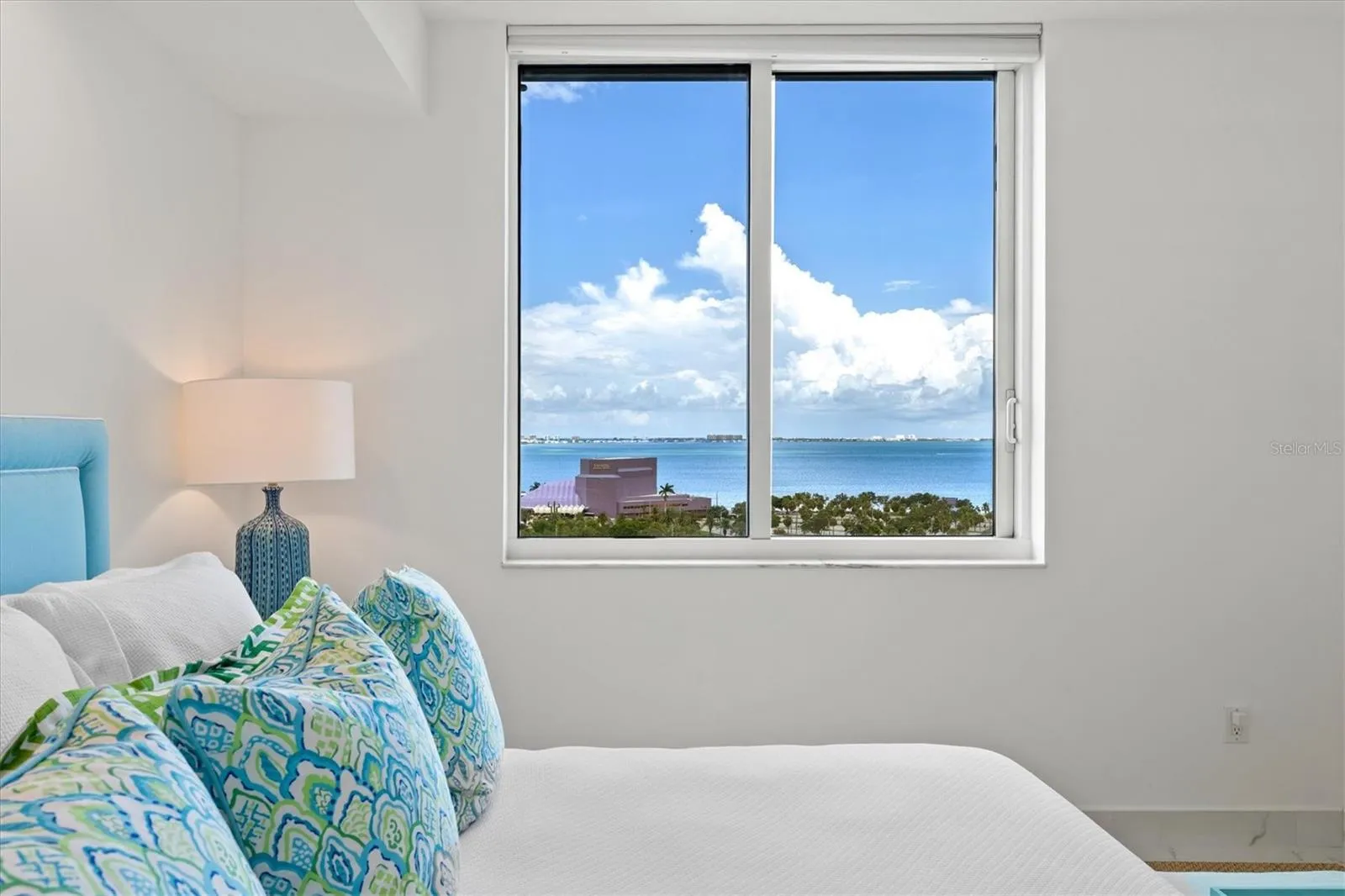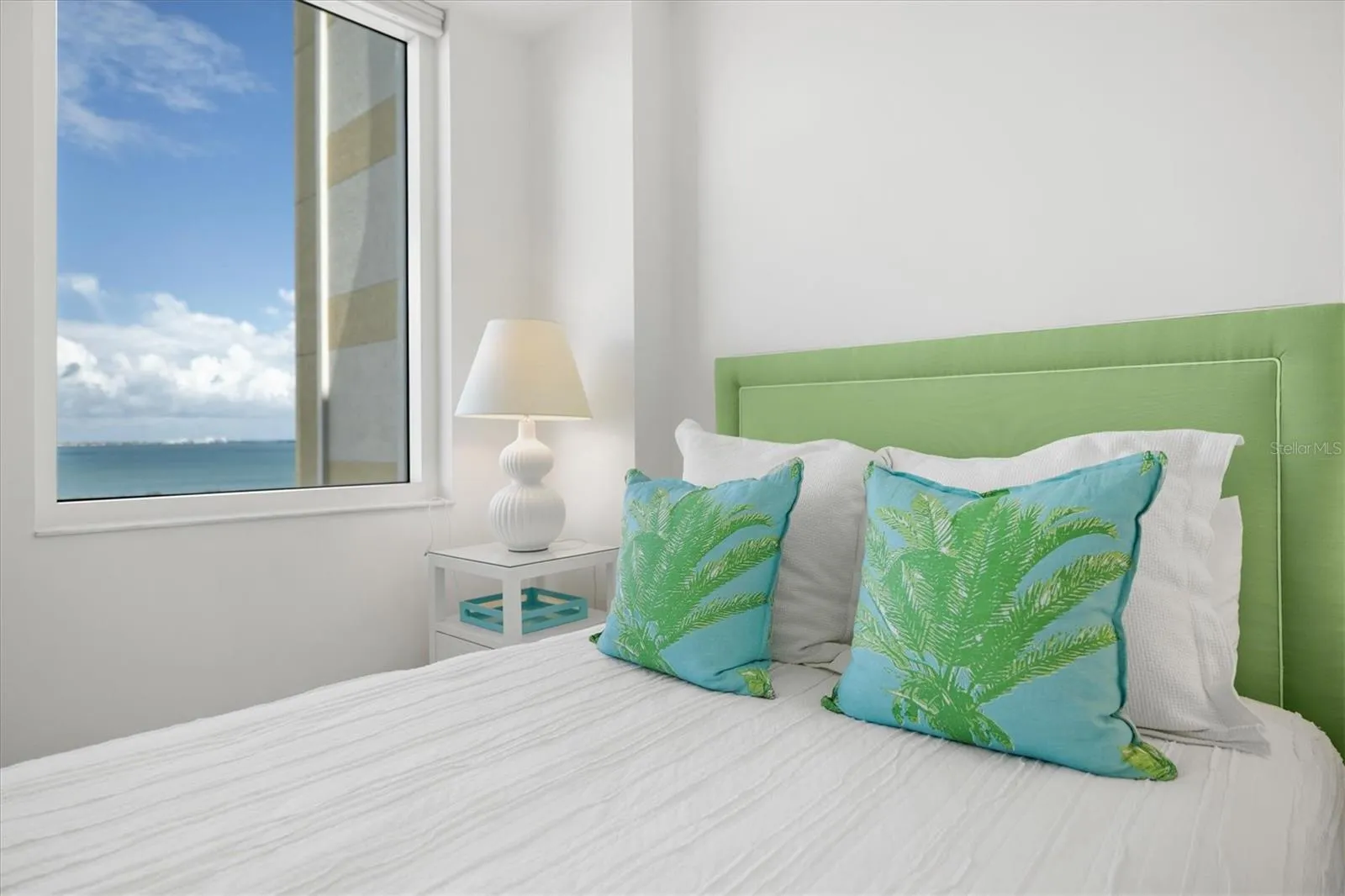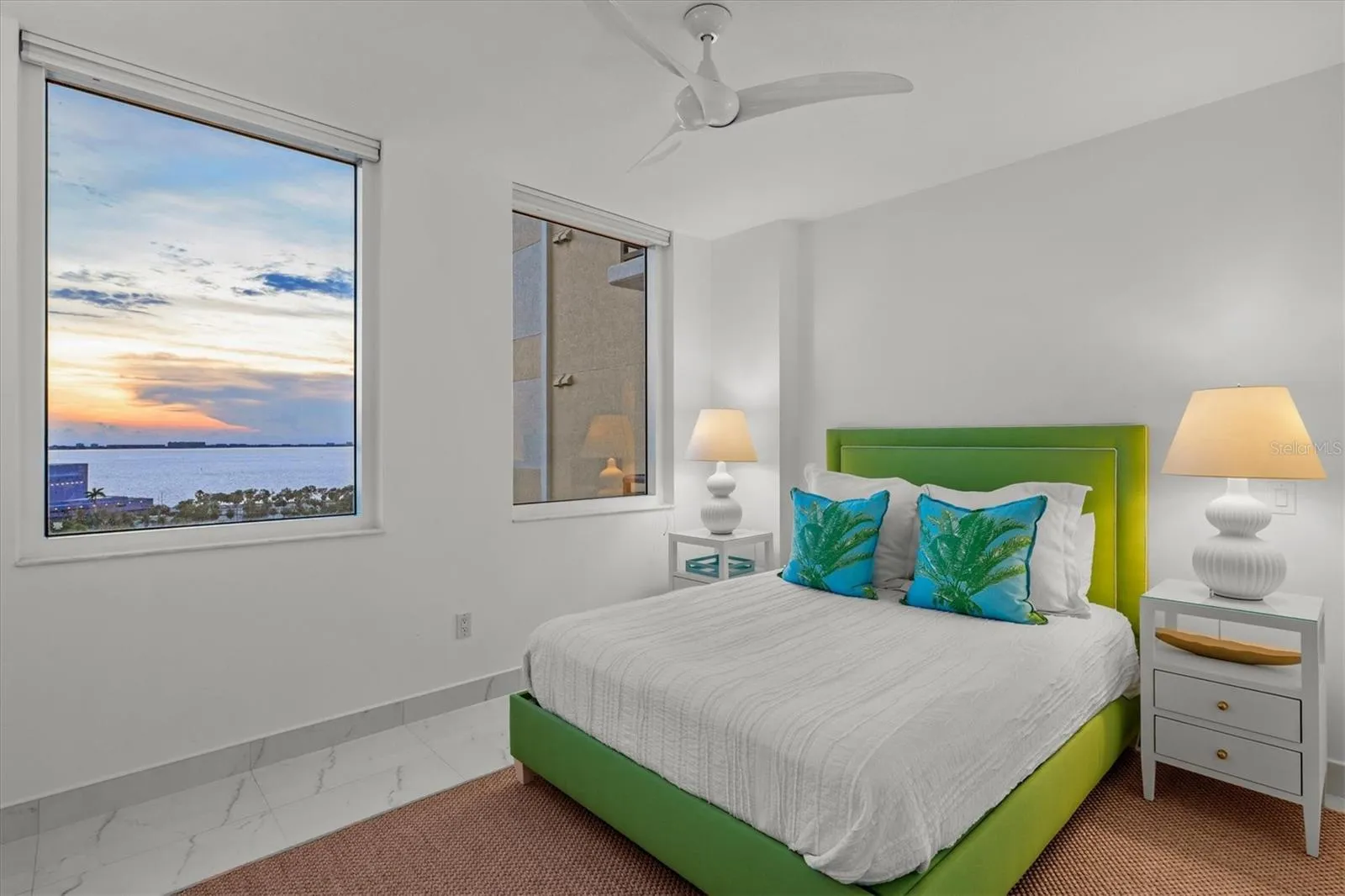 The second bedroom is just as impressive, with two large windows framing spectacular views of Sarasota Bay and the iconic Ringling Bridge. Even the laundry room has been transformed into a stylish space with built-in cabinetry and a beautiful light fixture. And every evening, you’ll be treated to the most magnificent sunsets on the West Coast of Florida right from your window!