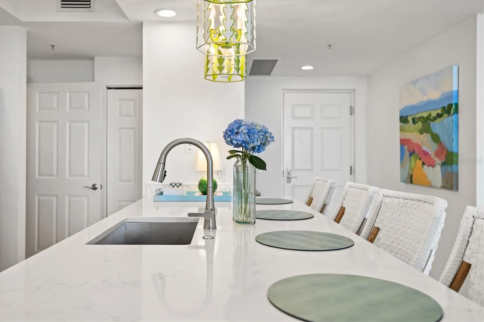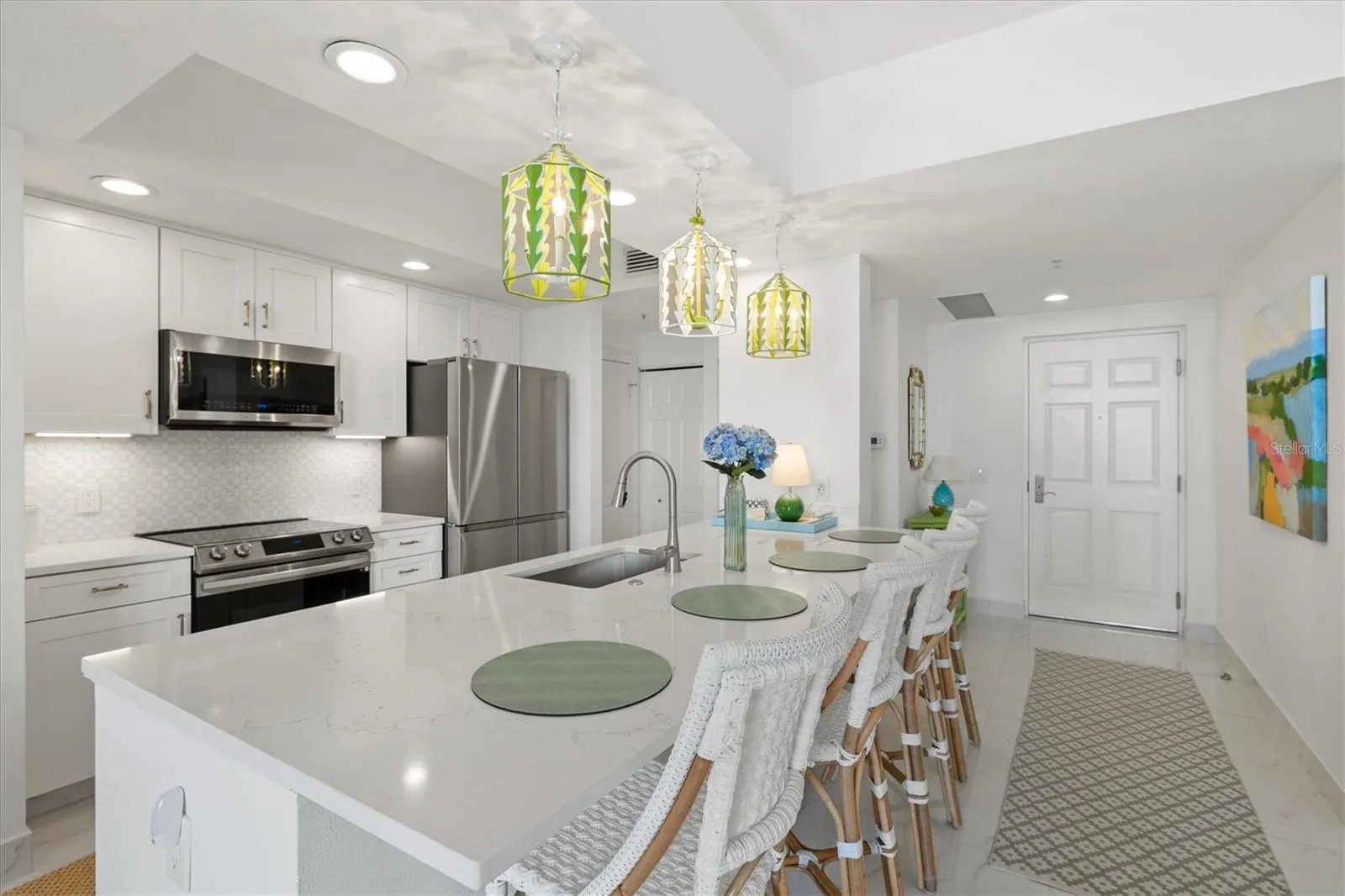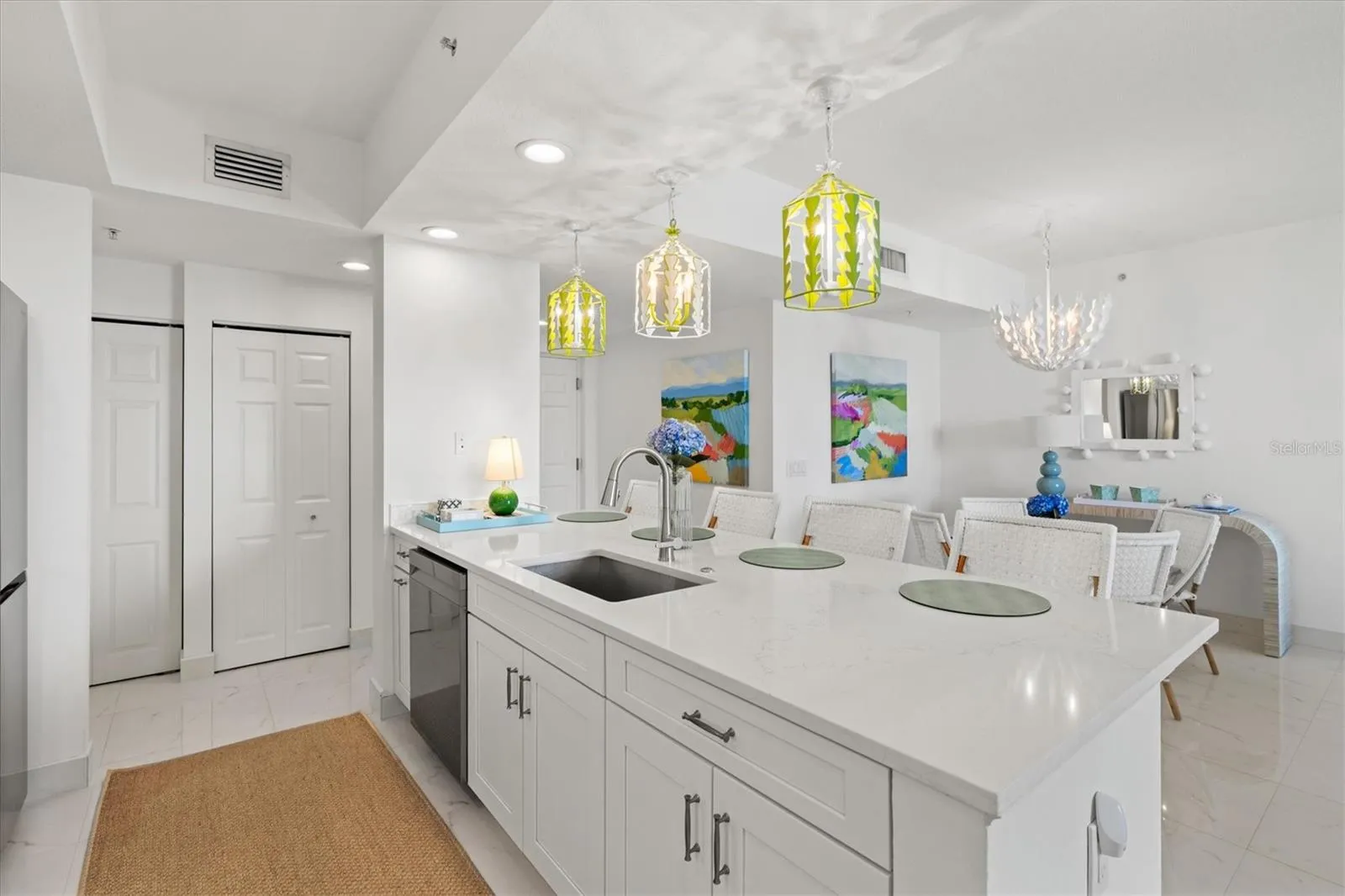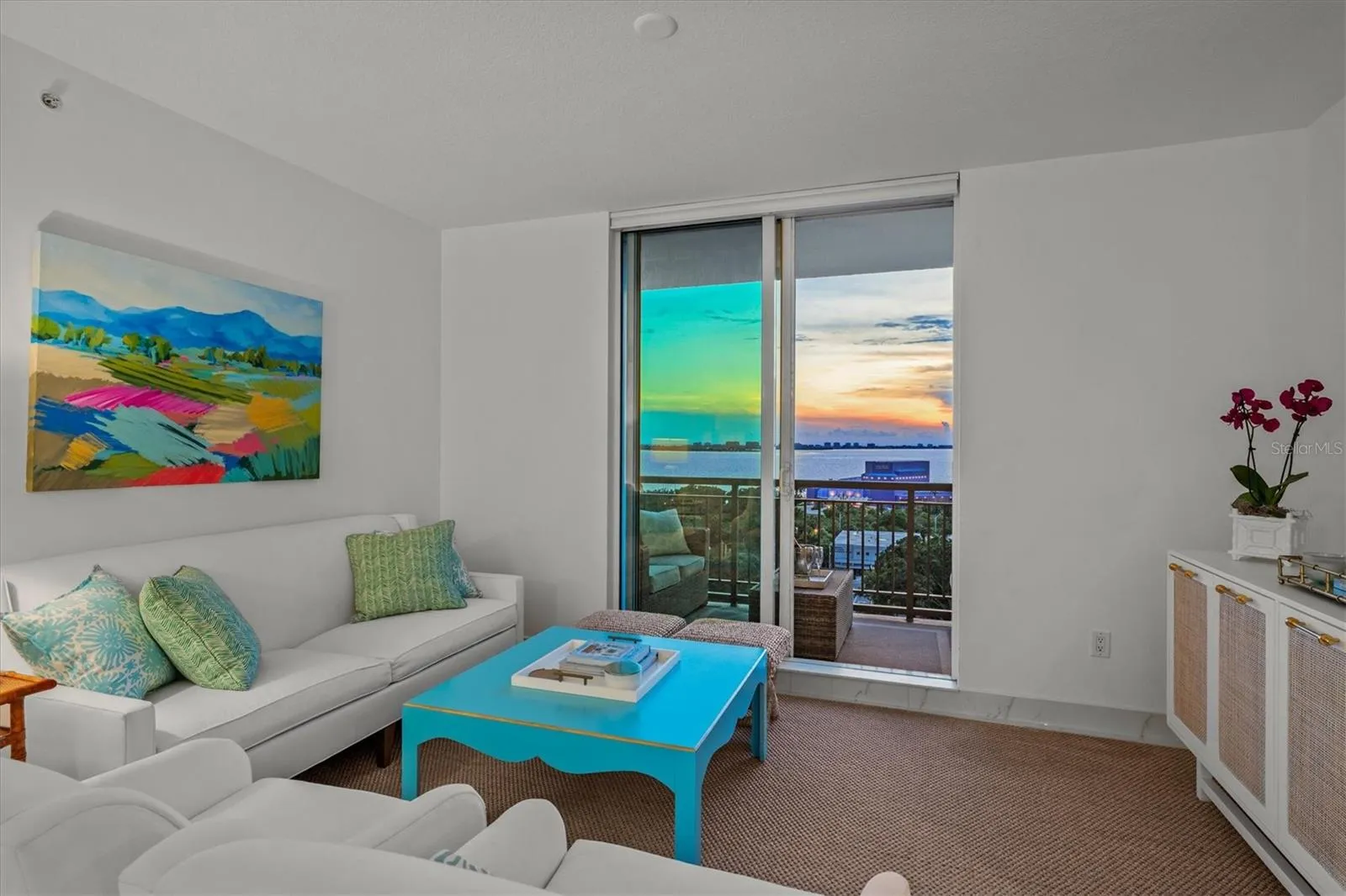 The second bedroom is just as impressive, with two large windows framing spectacular views of Sarasota Bay and the iconic Ringling Bridge. Even the laundry room has been transformed into a stylish space with built-in cabinetry and a beautiful light fixture. And every evening, you’ll be treated to the most magnificent sunsets on the West Coast of Florida right from your window!