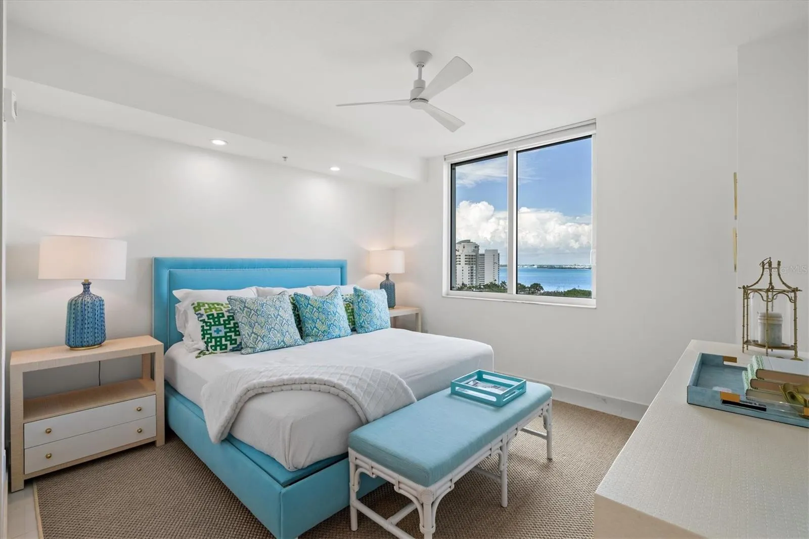 The kitchen is a chef’s dream, featuring a sleek Samsung stainless steel appliance package that perfectly complements the home’s elegant atmosphere. The spacious primary bedroom offers breathtaking views of Sarasota Bay, a generous walk-in closet, and a custom-designed en-suite bath that is both beautiful and highly functional. You’ll love the large walk-in shower and the rare, coveted linen closet, providing all the storage you need.