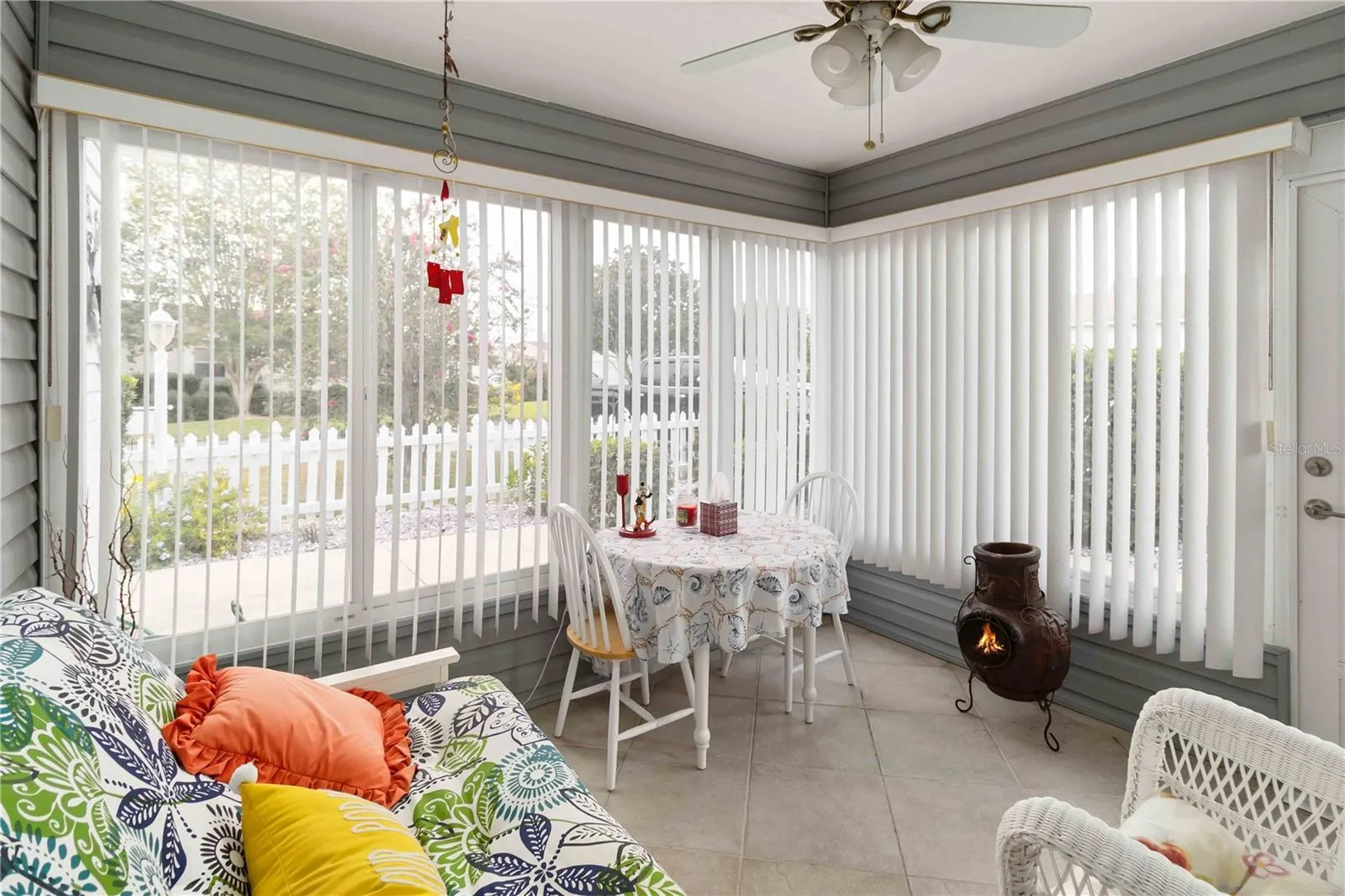 The spacious primary bedroom boasts hardwood flooring, a customized walk-in closet, and a private en-suite bathroom. The guest bedroom also has hardwood floors and is equipped with a Murphy bed for versatile use. From the guest room, you have direct access to the enclosed birdcage with a hot tub, providing a private space for relaxation and entertaining with evening lighting. The home also has an enclosed front lanai with an additional 114 square feet of living space, under heat and air.