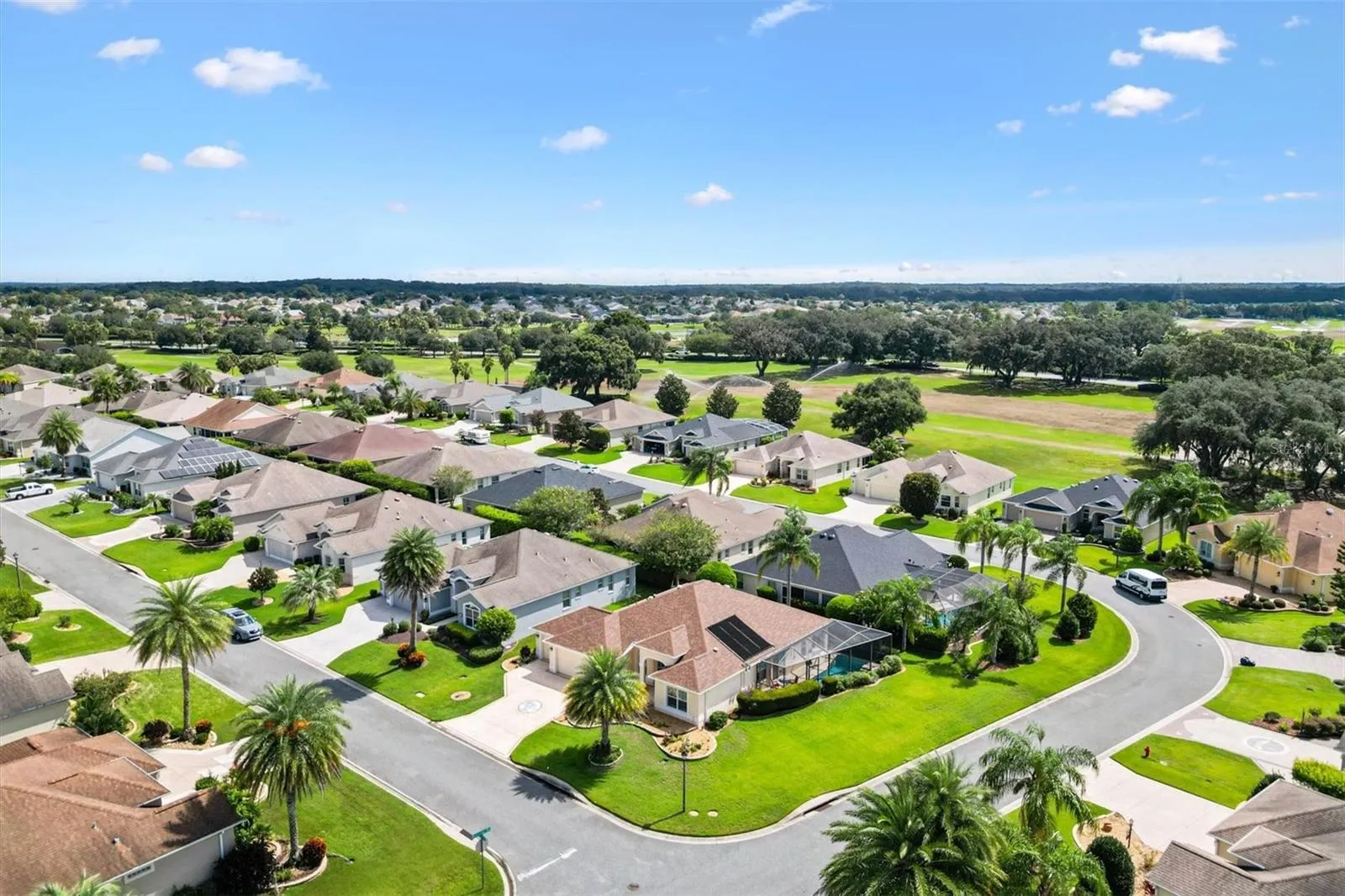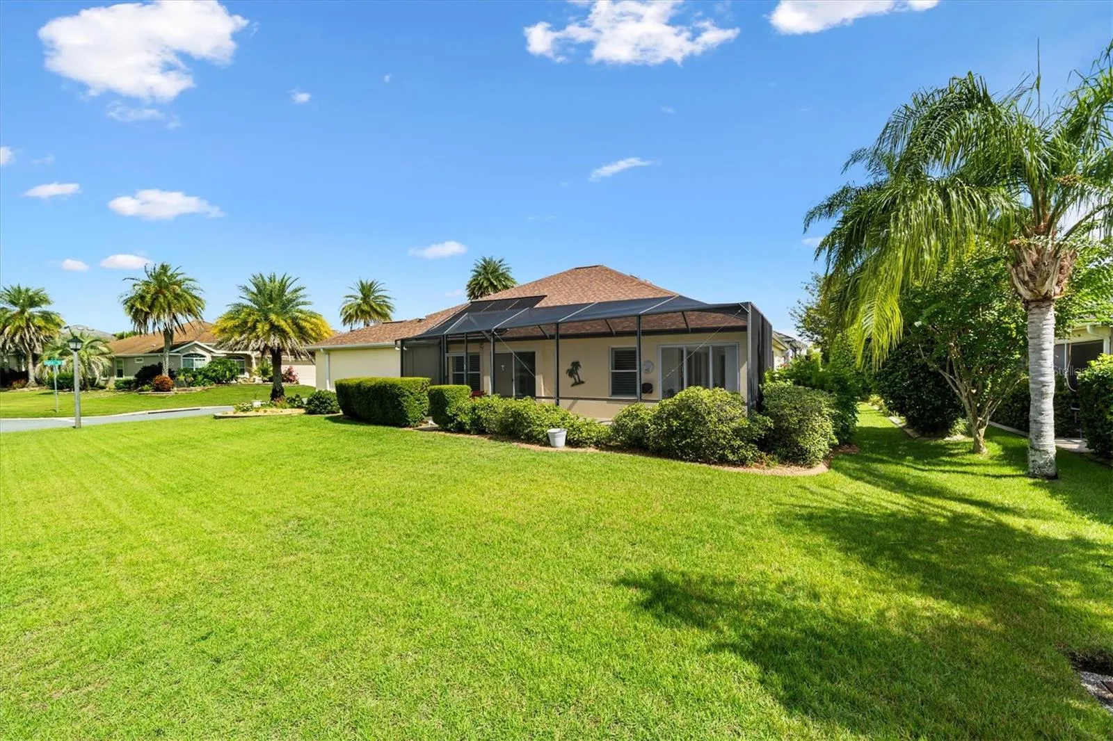 POOL & GOLF CART GARAGE ON CORNER LOT in the Village of Hemingway, this well kept 3 Bedroom 2 Bath Gardenia Pool Home with a golf cart garage is waiting for you to call home. Offered (WITH GOLF CART) partially furnished, it features plantation shutters, four solar tubes for abundant natural light, and thoughtful upgrades throughout. The kitchen is designed for both function and beauty, with light staggered cabinets, a glass-front display feature, pullout shelving in the lower cabinets, and Corian countertops. Enjoy casual meals in the breakfast nook, or entertain in the dining room, which is free of the column typical of the Gardenia model. The spacious Primary Suite boasts a tray ceiling, two walk-in closets, and a luxurious en-suite with a Roman shower and split vanities. The front bedroom includes a wall bed and built-in desk, making it ideal for extra guests and a home office. A guest bathroom separates the second and third bedrooms to complete the split floorplan guest suite and added privacy. The Living Room features a sliding door that lead to your private saltwater pool with screen enclosure. Double sliders open to enter the east-facing lanai in the rear of the home. Additional highlights include a 2024 roof, brand-new HVAC (July 2025), and proximity to Havana Country Club with championship golf and a popular restaurant. This home offers a sought-after blend of indoor and outdoor living in one of The Villages’ most convenient locations. Enjoy The Villages, FL, lifestyle with abundant amenities for you to attend golfing, shopping, dining, and enjoy many entertainment choices, club meetings, medical services, and more, all accessible by a golf cart.