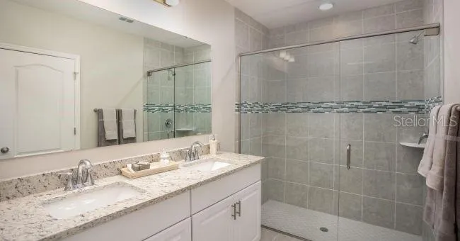 Both the great room and the primary bedroom benefit from enhanced LED lighting and horizontal cordless blinds, ensuring bright, inviting spaces. The private primary suite at the back of the home includes a sizable walk-in closet, dual sinks, and a beautifully tiled shower with glass enclosure, providing a luxurious retreat.