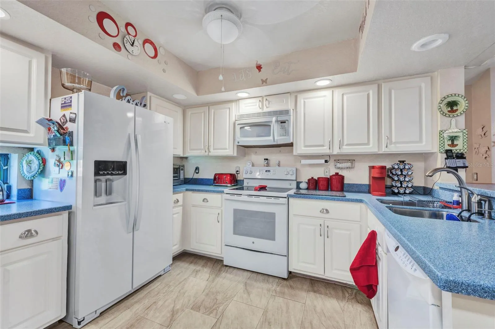 The kitchen has updated cabinets and Corian Countertops, Side by Side Refrigerator,