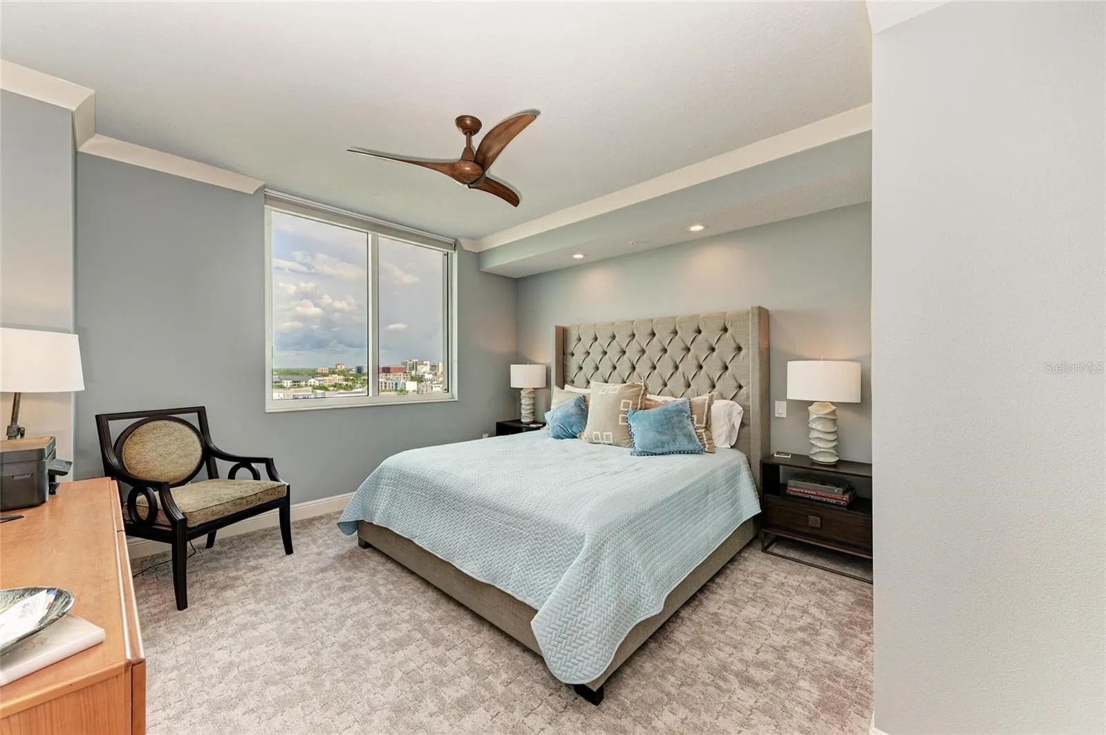 –Experience 10th-floor panoramic views in this highly sought-after “Cellini” split floor plan—1,323 sq. ft. of refined living in the heart of Downtown Sarasota. This 2-bedroom, 2-bath luxury residence showcases soaring ceilings, expansive windows, and a bright open concept design perfect for entertaining. The gourmet kitchen boasts granite counters, light color coastal cabinetry, and brand new 2025 Thermador appliances.