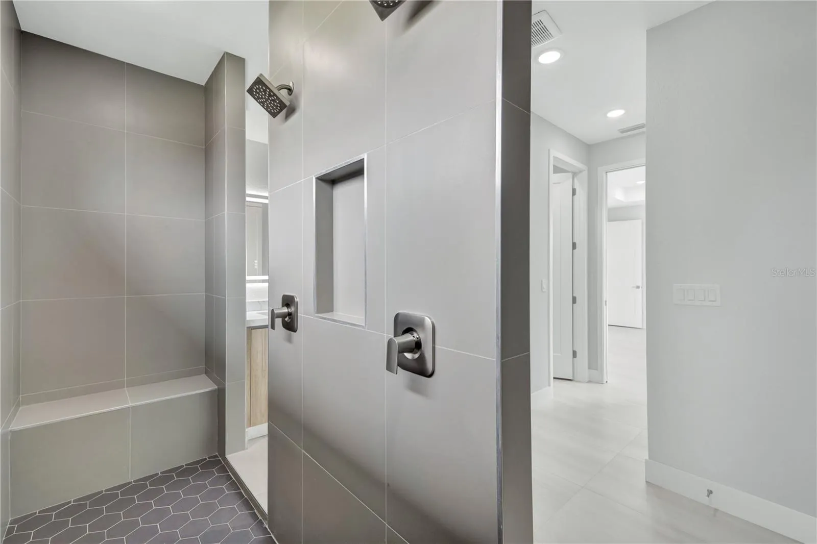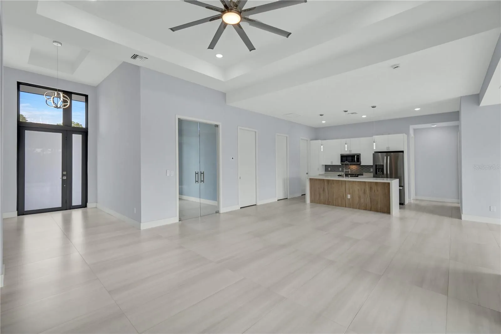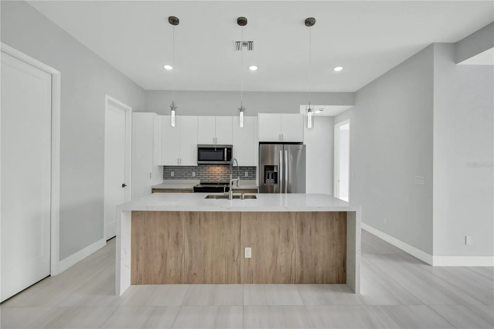 Step inside to discover SOARING VOLUME CEILINGS, 8-FOOT DOORS, and DESIGNER 24” x 48” porcelain tile flooring throughout. The SPACIOUS LIVING ROOM showcases a dramatic TRAY CEILING WITH RECESSED LIGHTING and a THREE-PANEL SLIDING GLASS DOOR that opens to the COVERED LANAI, creating a bright and seamless indoor-outdoor living experience. The primary suite is a private retreat, featuring lanai access, a Tray ceiling, TWO walk-in closets, and a SPA-INSPIRED BATHROOM with DUAL VANITIES, QUARTZ COUNTERTOPS, and a TILED SHOWER WITH DUAL SHOWERHEADS. The JUNIOR PRIMARY SUITE (perfect for guests or in-laws) includes its own ENSUITE BATH boasting a fully TILED SHOWER. At the heart of the home, the CHEF-INSPIRED KITCHEN dazzles with HIGH-END STAINLESS STEEL APPLIANCES, TILE BACKSPLASH, WALK-IN PANTRY, and a WATERFALL-EDGE QUARTZ ISLAND accented by elegant PENDANT LIGHTING and SLATTED WOOD DETAILING. Sleek BLACK HARDWARE adds a modern finishing touch.
