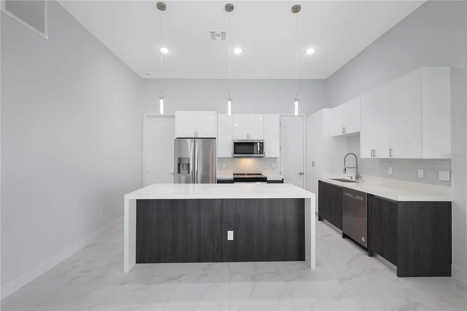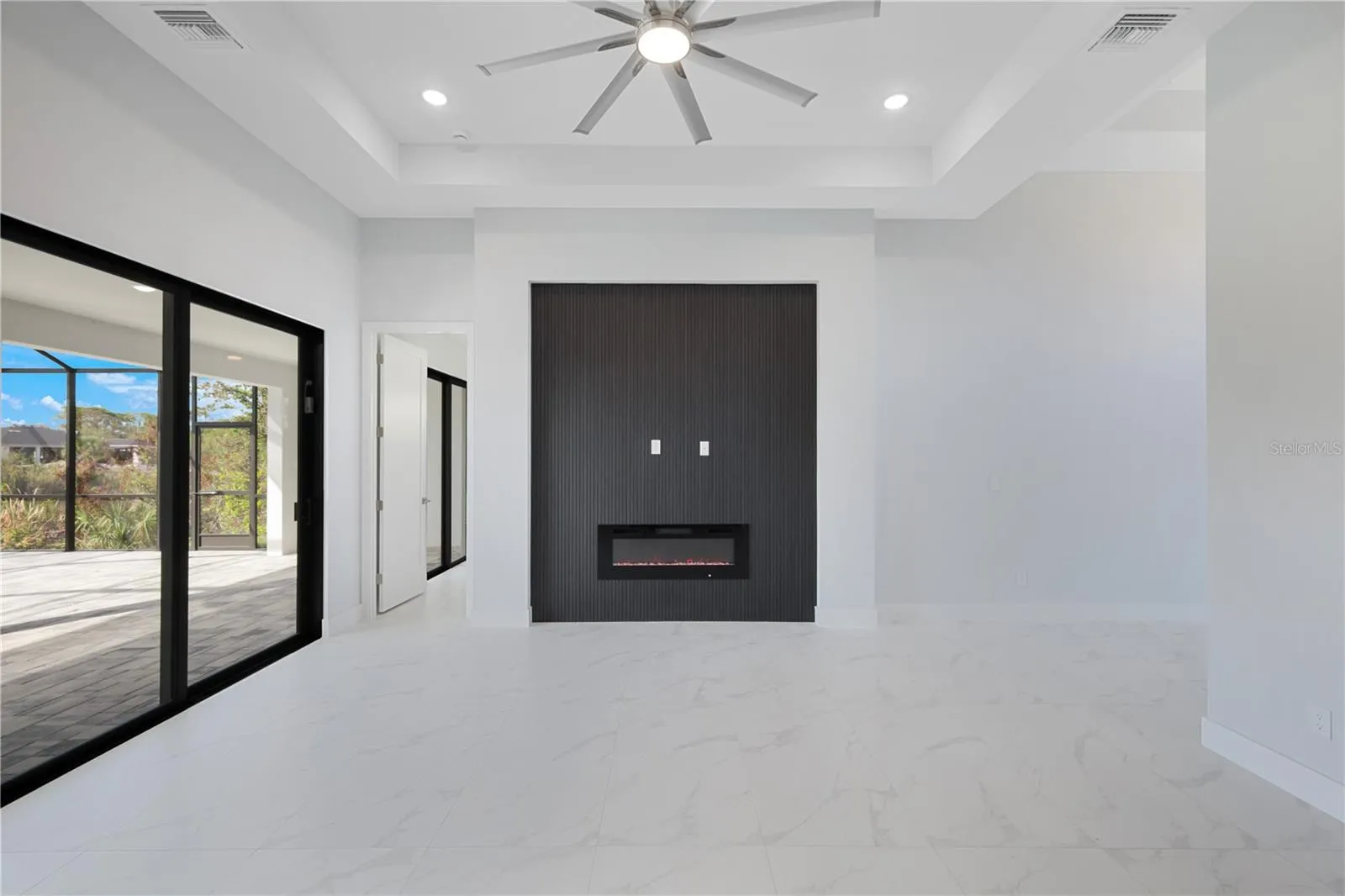 Step inside to discover SOARING VOLUME CEILINGS, 8-FOOT DOORS, and DESIGNER 24” x 48” porcelain tile flooring throughout. The SPACIOUS LIVING ROOM showcases a dramatic TRAY CEILING WITH RECESSED LIGHTING and a THREE-PANEL SLIDING GLASS DOOR that opens to the COVERED LANAI, creating a bright and seamless indoor-outdoor living experience. The primary suite is a private retreat, featuring lanai access, a Tray ceiling, TWO walk-in closets, and a SPA-INSPIRED BATHROOM with DUAL VANITIES, QUARTZ COUNTERTOPS, and a TILED SHOWER WITH DUAL SHOWERHEADS. The JUNIOR PRIMARY SUITE (perfect for guests or in-laws) includes its own ENSUITE BATH, a LARGE WALK-IN CLOSET, and PRIVATE POOL DECK ACCESS, offering comfort and independence for your visitors. At the heart of the home, the CHEF-INSPIRED KITCHEN dazzles with HIGH-END STAINLESS STEEL APPLIANCES, TILE BACKSPLASH, WALK-IN PANTRY, and a WATERFALL-EDGE QUARTZ ISLAND accented by elegant PENDANT LIGHTING and SLATTED WOOD DETAILING. Sleek BLACK HARDWARE adds a modern finishing touch.