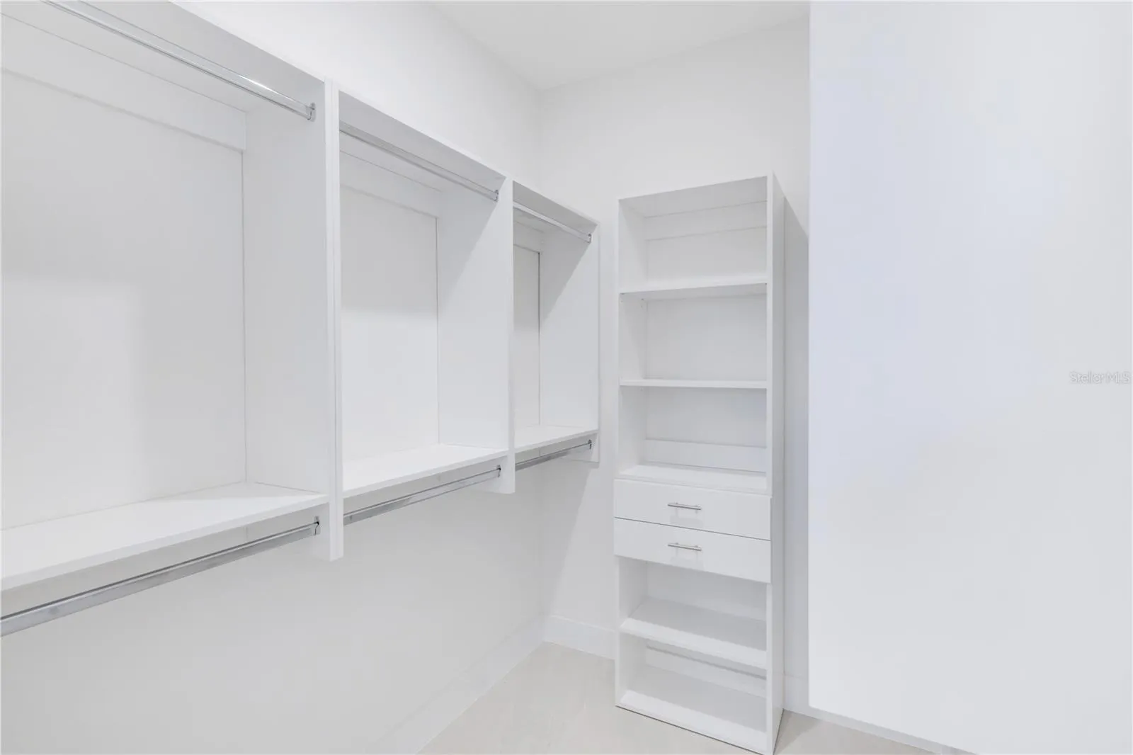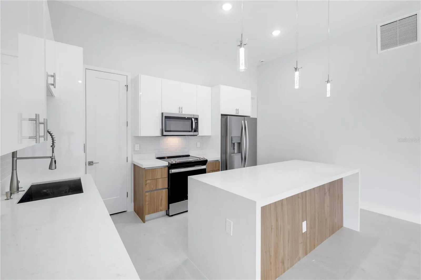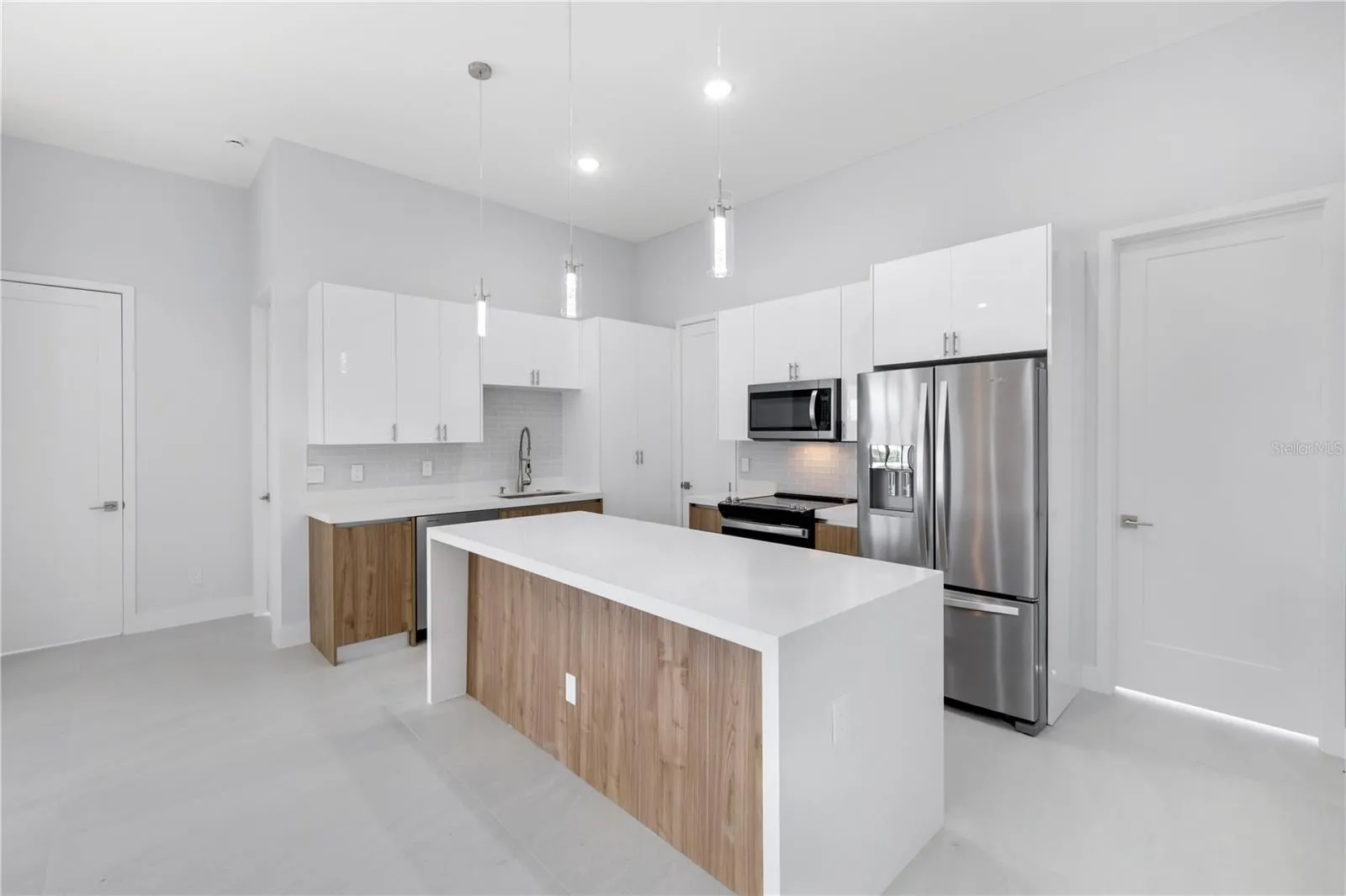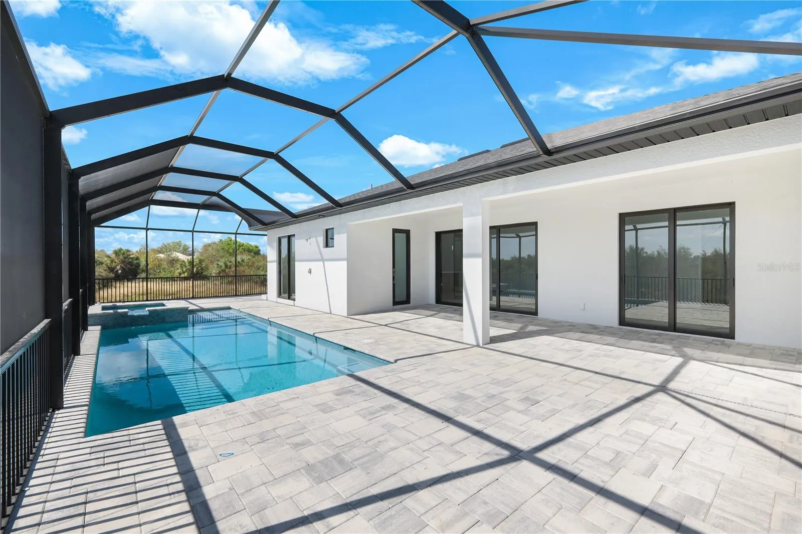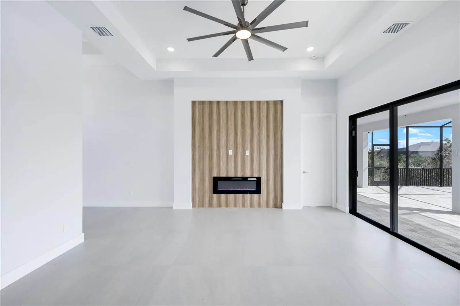 Step inside to discover SOARING VOLUME CEILINGS, 8-FOOT DOORS, and DESIGNER 24” x 48” porcelain tile flooring throughout. The SPACIOUS LIVING ROOM showcases a dramatic TRAY CEILING WITH RECESSED LIGHTING and a THREE-PANEL SLIDING GLASS DOOR that opens to the COVERED LANAI, creating a bright and seamless indoor-outdoor living experience. The primary suite is a private retreat, featuring lanai access, a Tray ceiling, TWO walk-in closets, and a SPA-INSPIRED BATHROOM with DUAL VANITIES, QUARTZ COUNTERTOPS, and a TILED SHOWER WITH DUAL SHOWERHEADS. The JUNIOR PRIMARY SUITE (perfect for guests or in-laws) includes its own ENSUITE BATH, a LARGE WALK-IN CLOSET, and PRIVATE POOL DECK ACCESS, offering comfort and independence for your visitors. At the heart of the home, the CHEF-INSPIRED KITCHEN dazzles with HIGH-END STAINLESS STEEL APPLIANCES, TILE BACKSPLASH, WALK-IN PANTRY, and a WATERFALL-EDGE QUARTZ ISLAND accented by elegant PENDANT LIGHTING and SLATTED WOOD DETAILING. Sleek BLACK HARDWARE adds a modern finishing touch.
