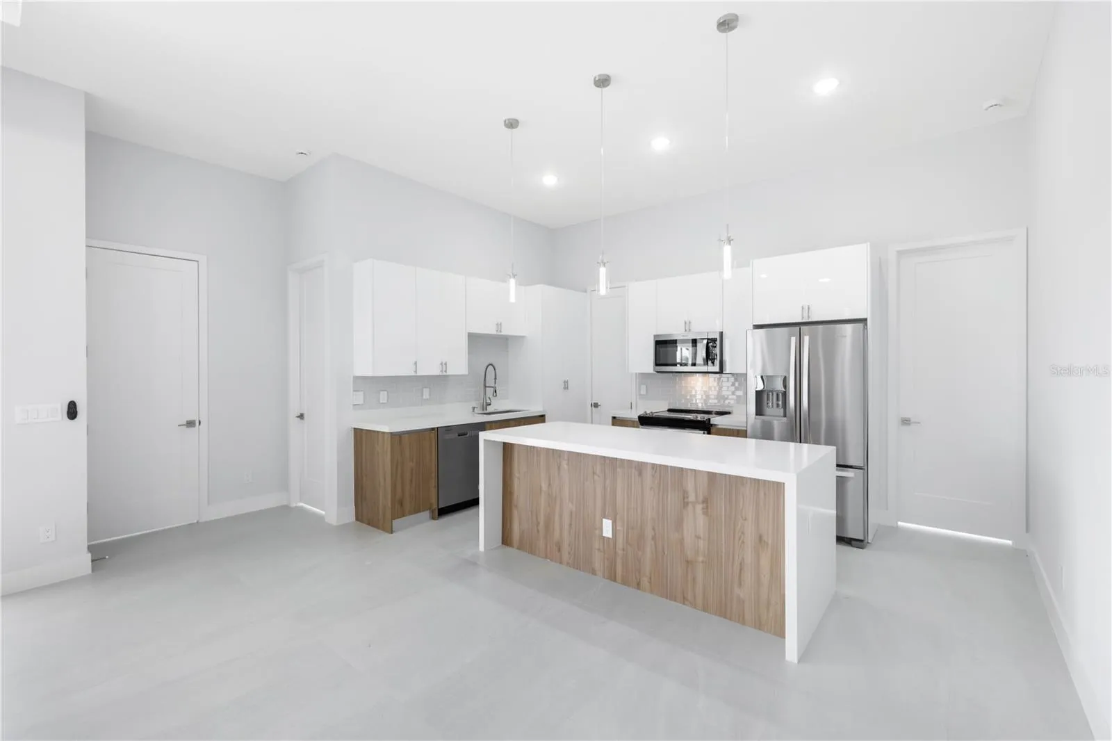 Step inside to discover SOARING VOLUME CEILINGS, 8-FOOT DOORS, and DESIGNER 24” x 48” porcelain tile flooring throughout. The SPACIOUS LIVING ROOM showcases a dramatic TRAY CEILING WITH RECESSED LIGHTING and a THREE-PANEL SLIDING GLASS DOOR that opens to the COVERED LANAI, creating a bright and seamless indoor-outdoor living experience. The primary suite is a private retreat, featuring lanai access, a Tray ceiling, TWO walk-in closets, and a SPA-INSPIRED BATHROOM with DUAL VANITIES, QUARTZ COUNTERTOPS, and a TILED SHOWER WITH DUAL SHOWERHEADS. The JUNIOR PRIMARY SUITE (perfect for guests or in-laws) includes its own ENSUITE BATH, a LARGE WALK-IN CLOSET, and PRIVATE POOL DECK ACCESS, offering comfort and independence for your visitors. At the heart of the home, the CHEF-INSPIRED KITCHEN dazzles with HIGH-END STAINLESS STEEL APPLIANCES, TILE BACKSPLASH, WALK-IN PANTRY, and a WATERFALL-EDGE QUARTZ ISLAND accented by elegant PENDANT LIGHTING and SLATTED WOOD DETAILING. Sleek BLACK HARDWARE adds a modern finishing touch.