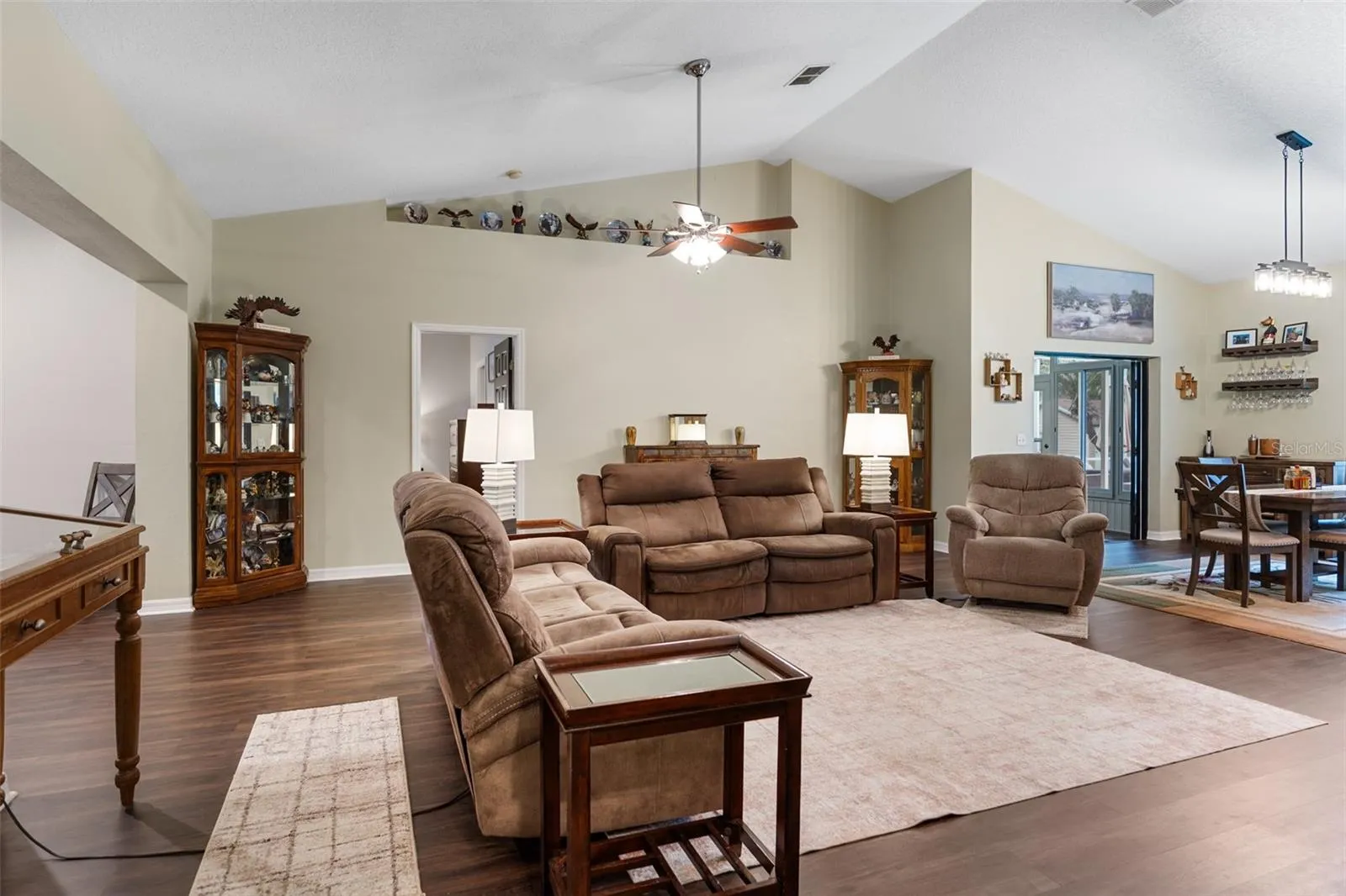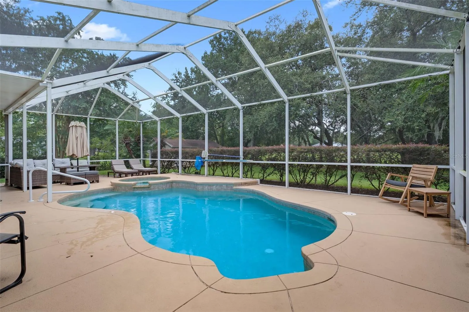 IMPRESSIVE POOL HOME ON GORGEOUS CORNER LOT! Come See this spacious 2,285 sq.ft., 3 BD/2 BA home featuring the desirable floor plan that offers an open concept living area with cathedral ceiling, an attractive open kitchen and split bedroom design giving the owners’ suite quiet seclusion. Handsome luxury plank flooring begins at the foyer and continues through to the living areas and into the master suite. To the left of the foyer is the formal dining room, yet, a versatile space with wide opening leading directly to the spaciousness of the great room, kitchen that offers casual dining and seating-at-the countertop. Beautiful wood cabinets and granite counters grace the kitchen that has a walk-in pantry and stainless steel appliances. French doors by the dinette open onto the Florida room made of large windows allowing view across the screened pool/spa and beyond to the mesmerizing landscaping throughout the fenced lawn. The secluded master en suite has a spacious walk-in closet and a room that is ideal to use as an office or den; the master bathroom is outfitted with a soaking tub, large shower and a door giving access to Florida room for poolside convenience. The additional bedrooms have carpeted flooring and stand near the second full bathroom. This beautiful corner lot has stunning landscaping with outlined islands accenting oak trees, crape myrtles and ornamental plantings. The driveway to the side-positioned garage is extra wide providing a parking pad for additional autos or boat. Within the fenced backyard is a detached building that is ideal for use as a workshop or hobby cottage. This beautiful home is like Nearly New with the many updated components and features/inside and outside since 2023-2025; currently boasting a brand NEW ROOF and newer A/C, new tankless water heater, pool equipment, generator ready, newer appliances, ceiling fans and more! This impressive property is nestled within the oak hammock of the Spring Pines community(No HOA). It’s a short drive to I-4 for Orlando, Tampa, Gulf or Ocean Beaches; a convenient Central Florida location! Call today, schedule your private viewing of this beauty!