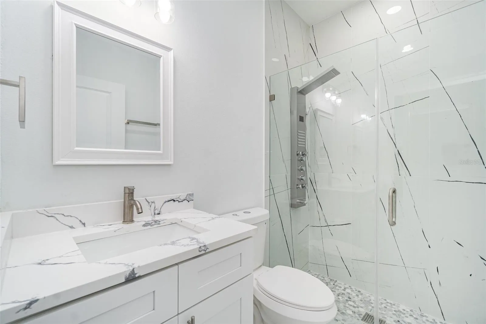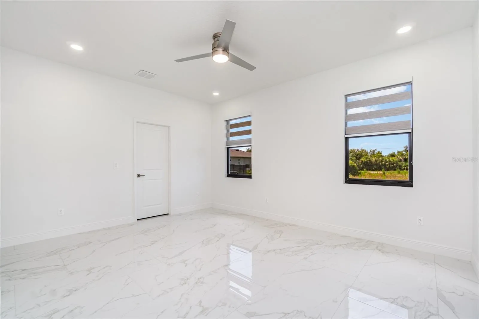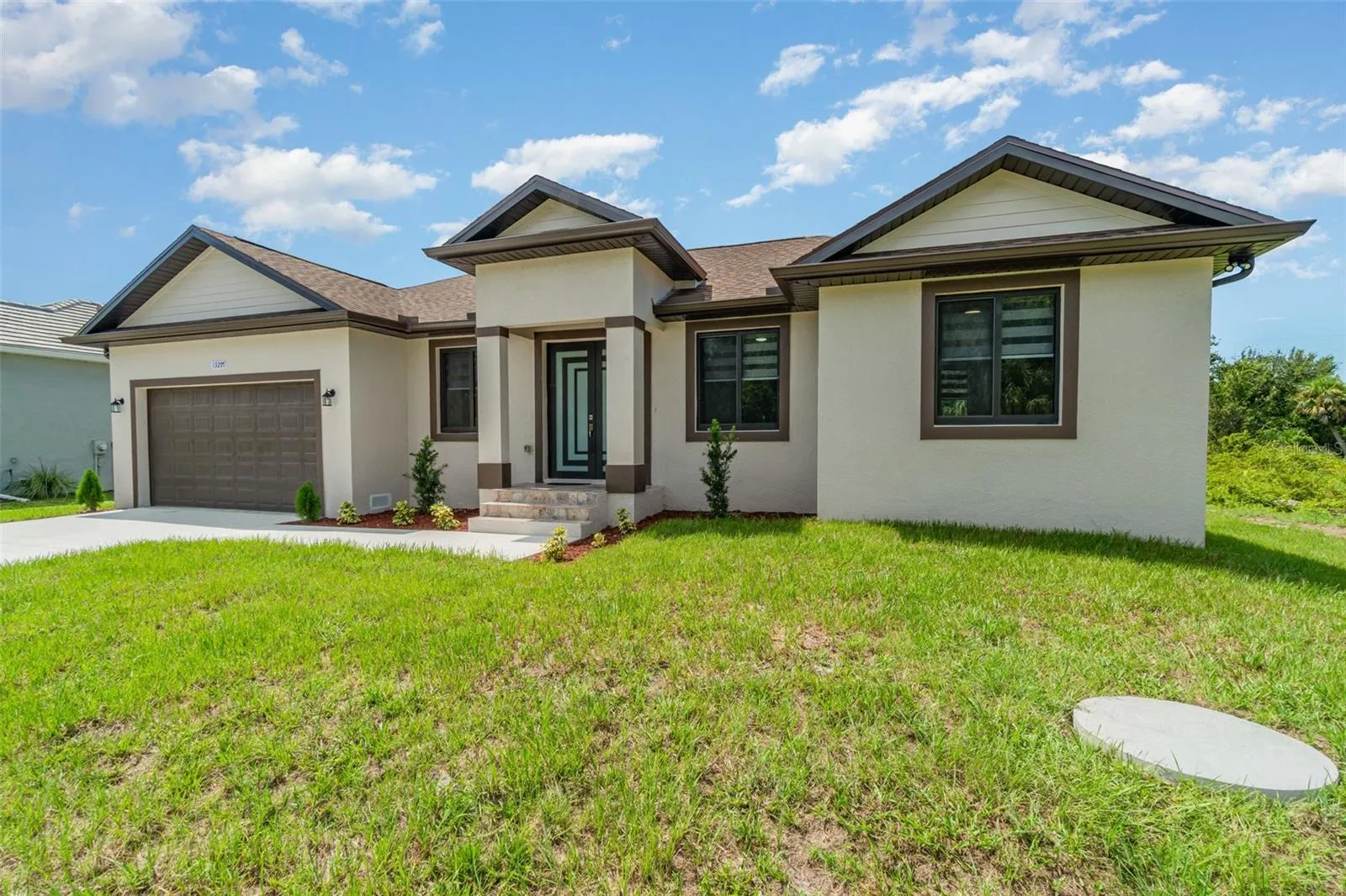 New construction in South Gulf Cove with clean, modern lines and seamless indoor-outdoor living. Single-story 3BR + office / 2BA / 2-car garage. Open concept with large-format porcelain tile throughout, striking frosted-glass double entry, slat accent wall and designer lighting. Show-stopping kitchen features an XL waterfall quartz island, shaker cabinetry, mosaic backsplash, stainless appliances and fixtures. Owner’s suite has dual vanities, frameless glass shower and a freestanding soaking tub. Bright secondary bedrooms with modern fans and zebra shades. Generous laundry room with sink and cabinets. Relax on the covered lanai with wet bar overlooking the backyard, perfect for grilling and entertaining. Minutes to Gasparilla Rd/FL-776, marinas, beaches and golf. Move-in ready and easy to show.