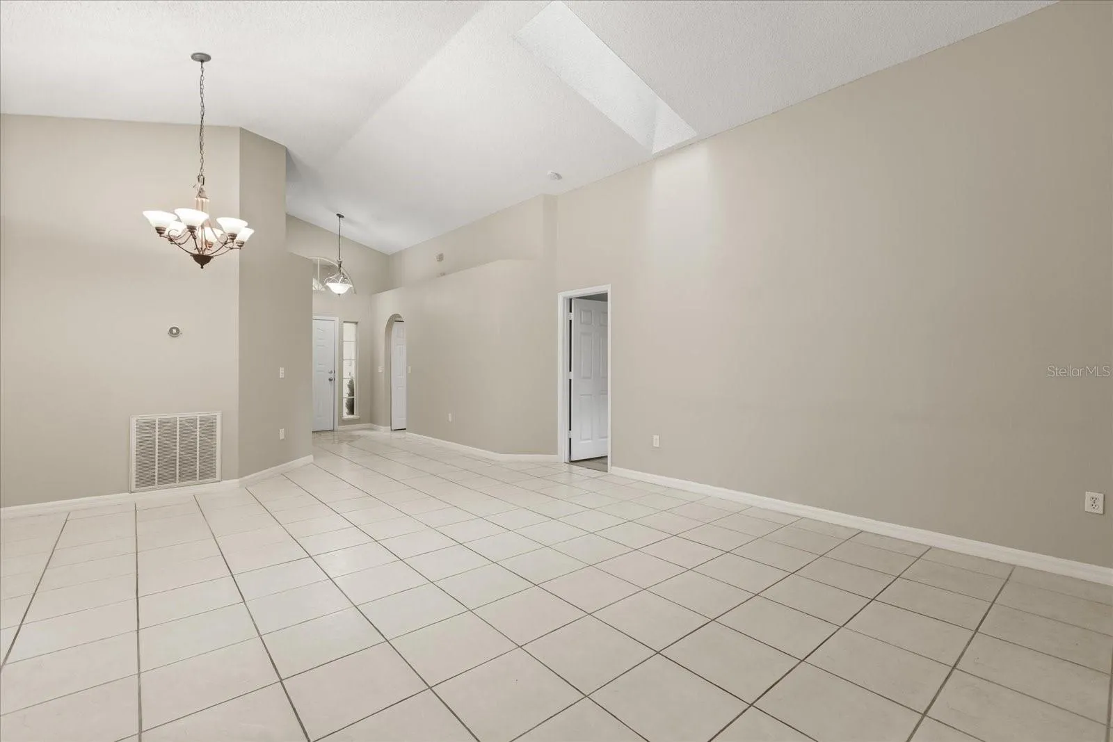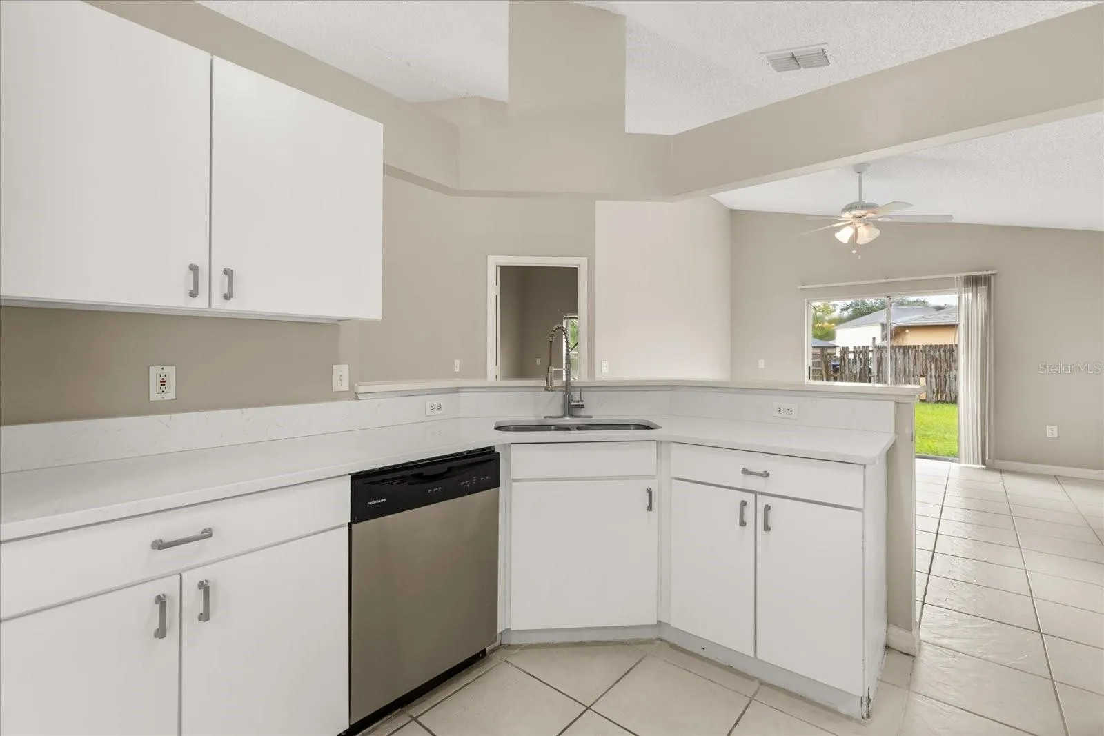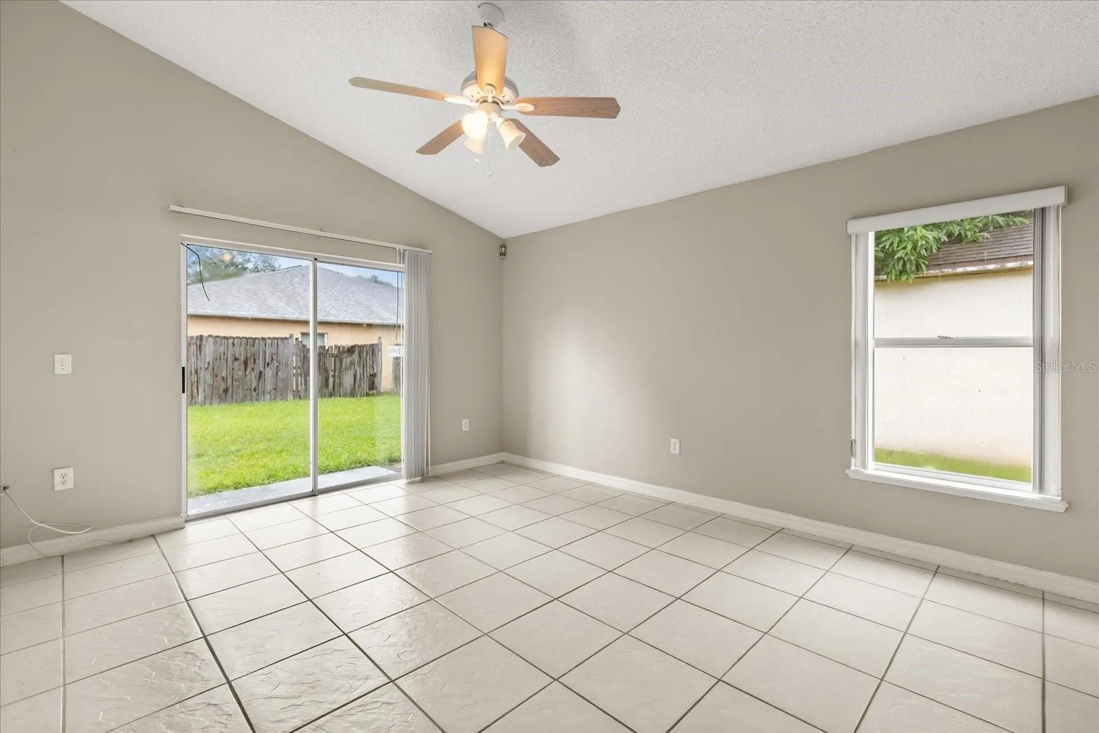 The home features tile flooring throughout, with vinyl flooring in the primary bedroom. The large primary suite includes a walk-in closet and a dual-vanity bathroom. Outside, enjoy a spacious partially fenced yard ideal for gatherings or outdoor activities. The roof was replaced in 2017, providing many years of worry-free use.